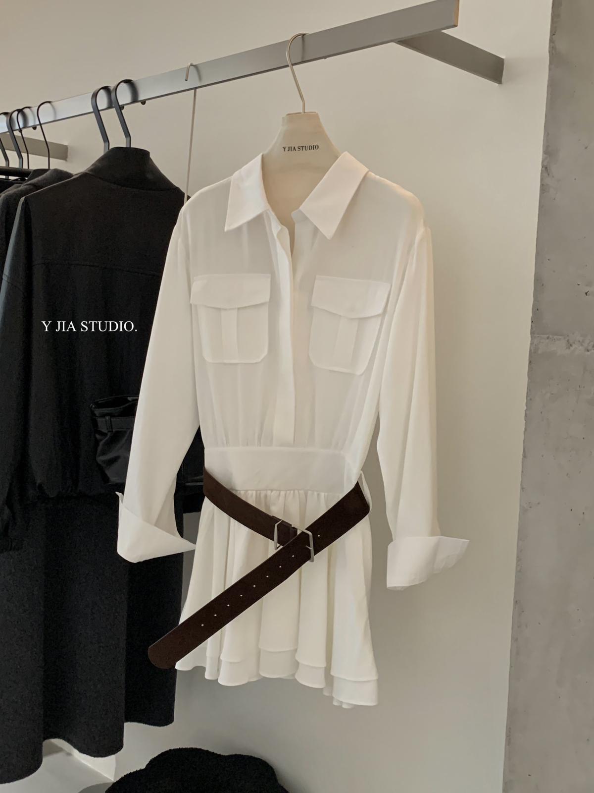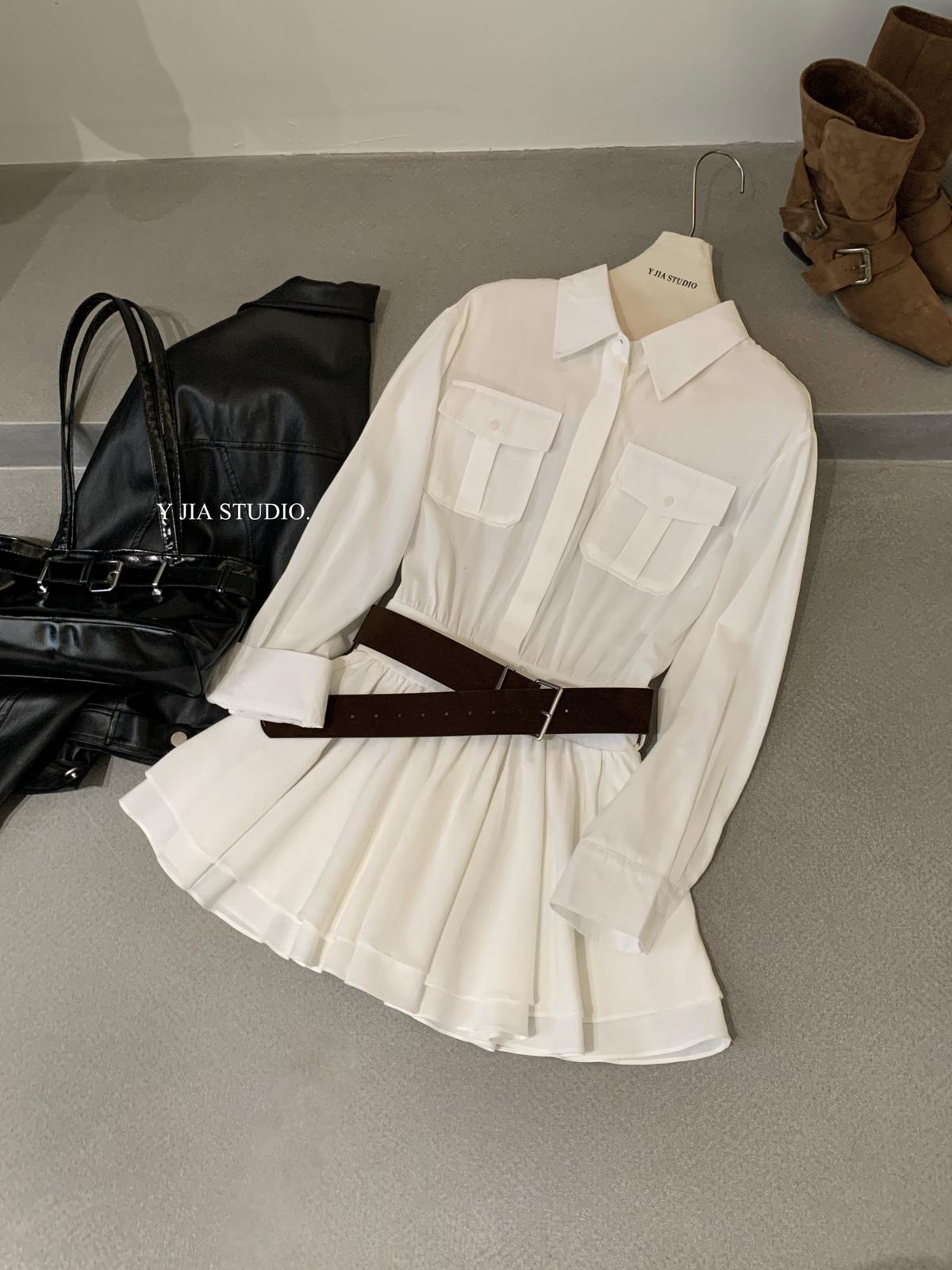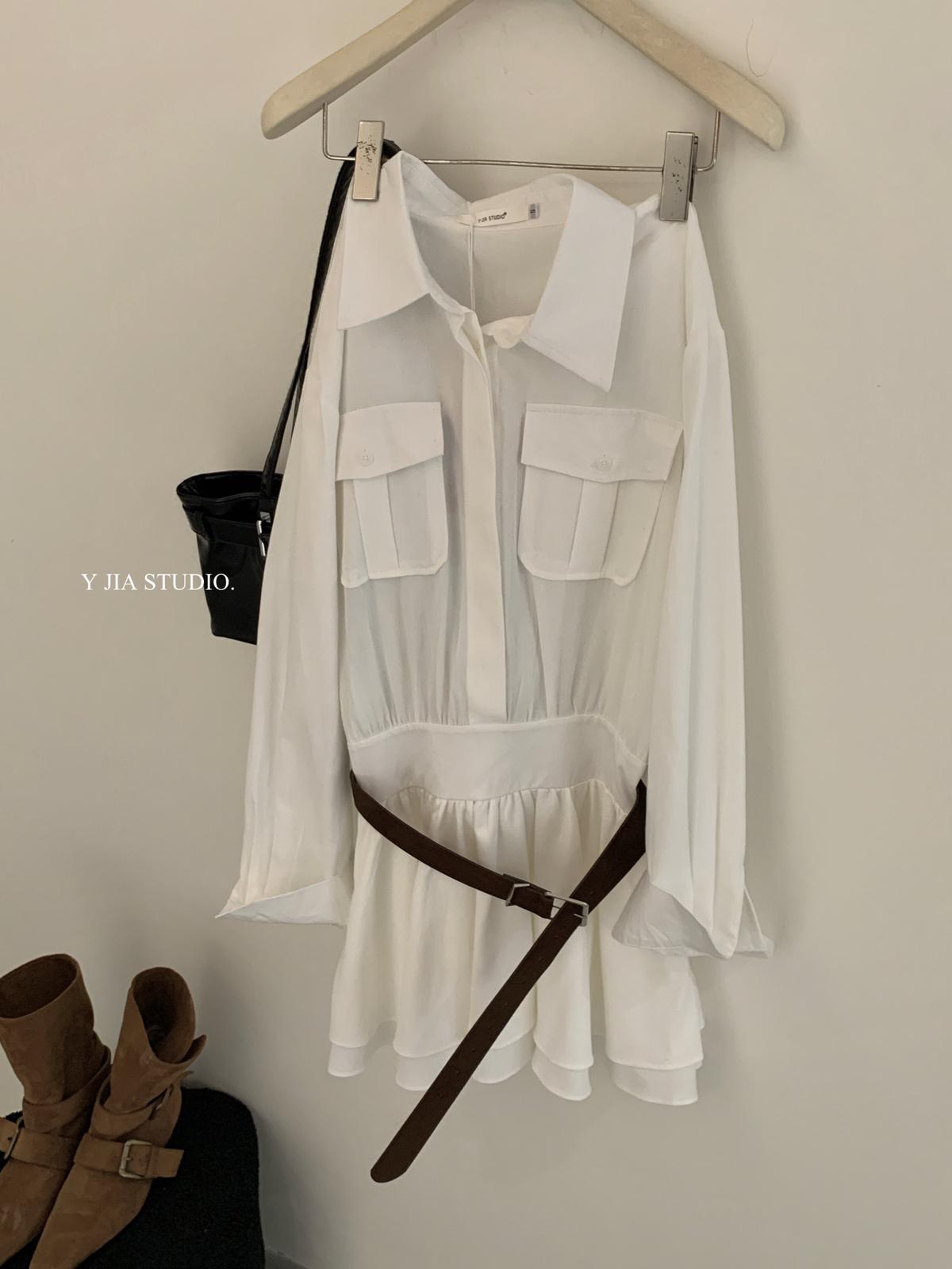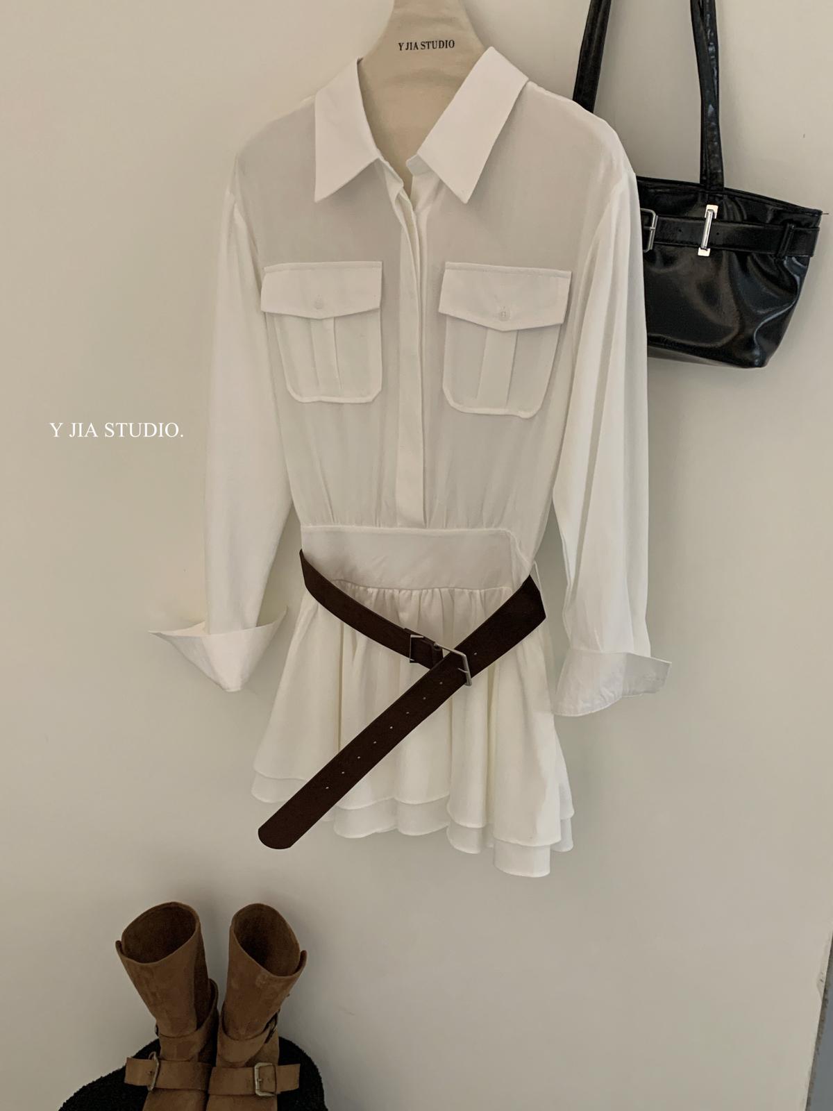 【C8643】山茶白茉莉~留白立裁捏褶收腰襯衫裙連衣裙(配腰帶)