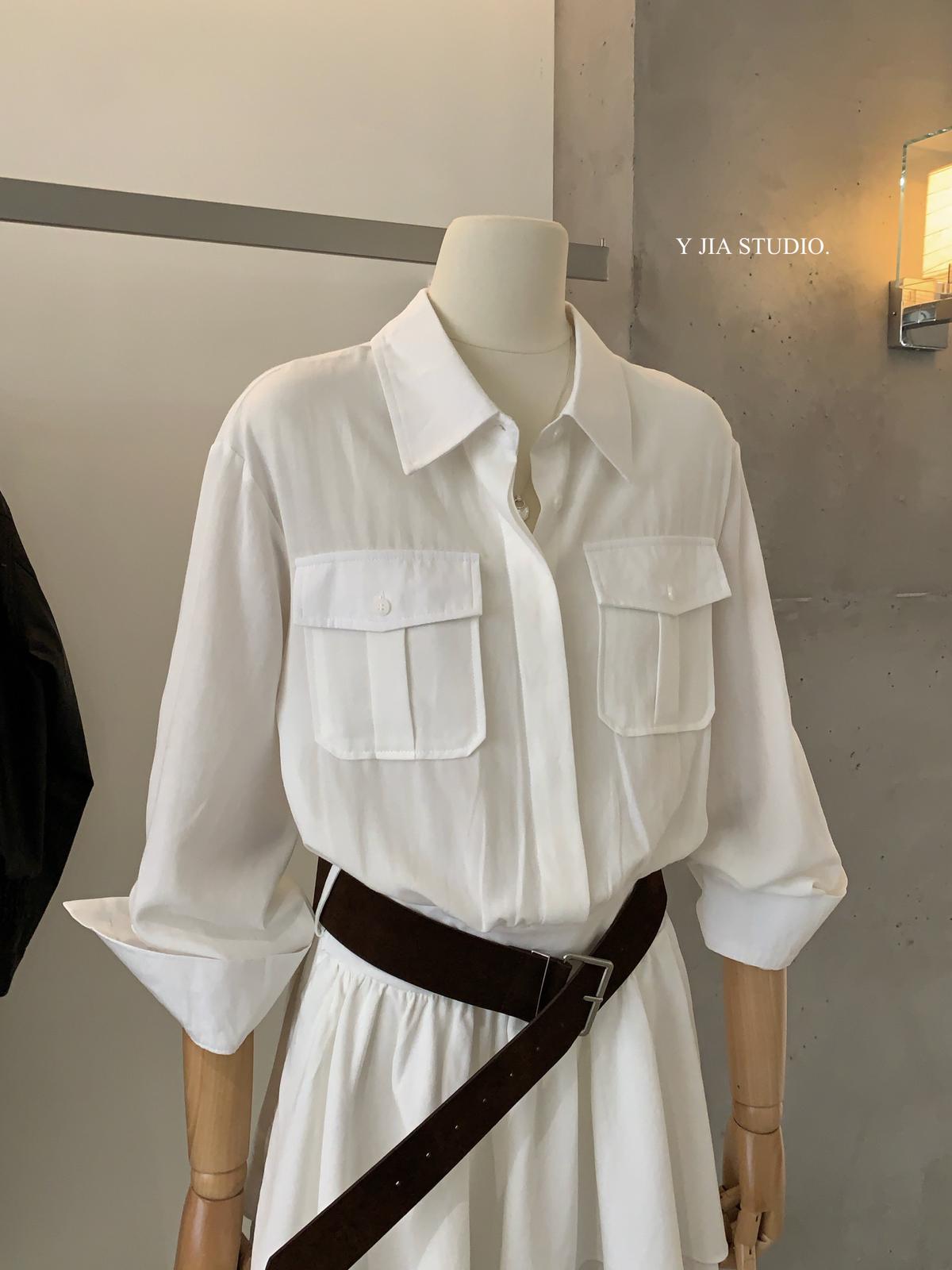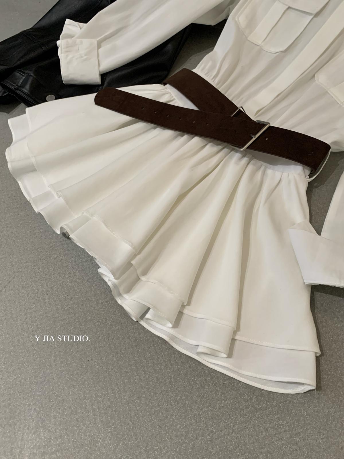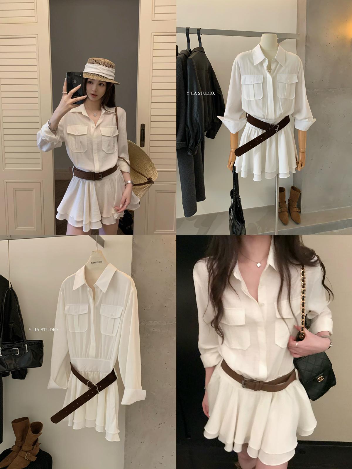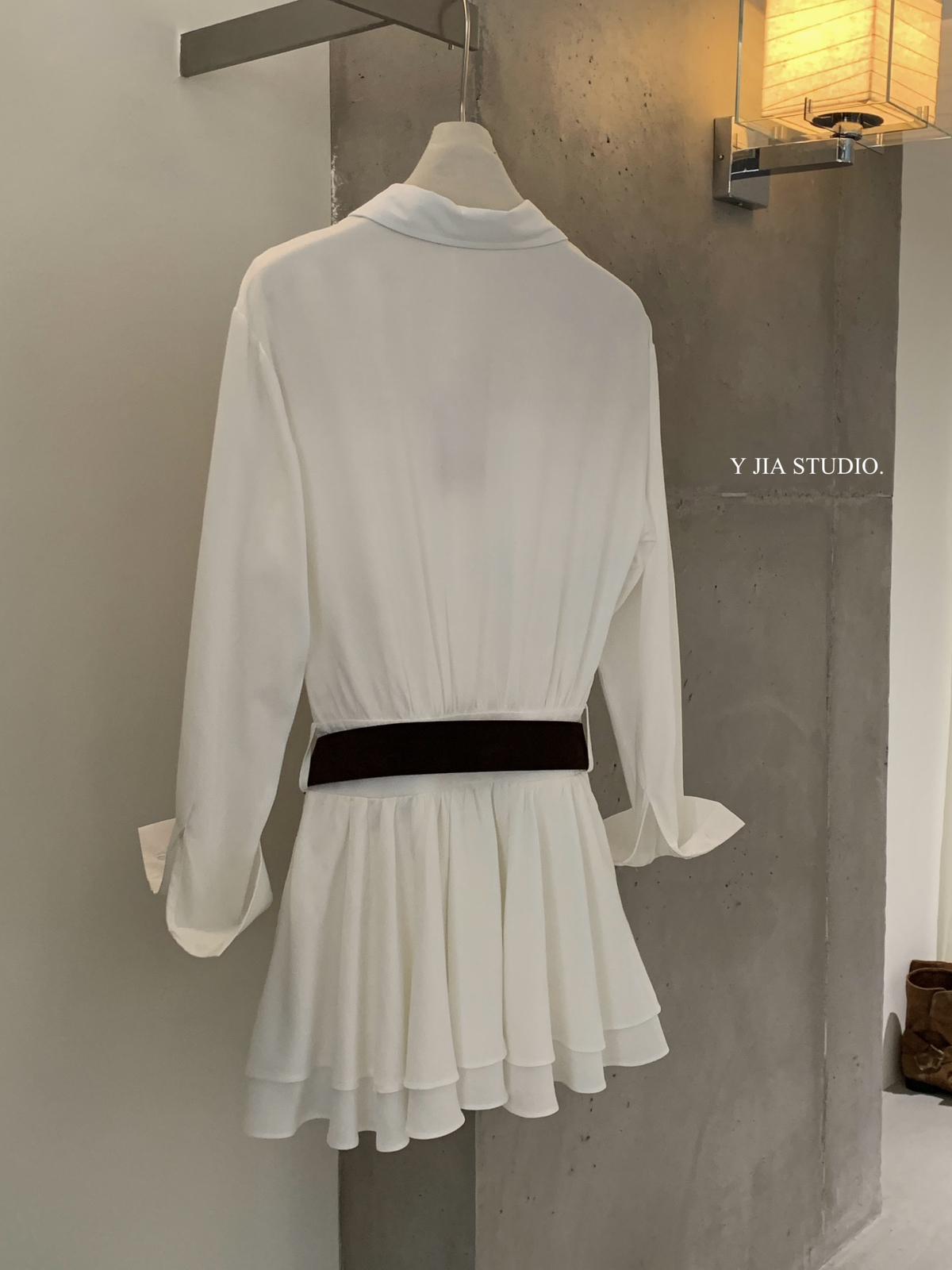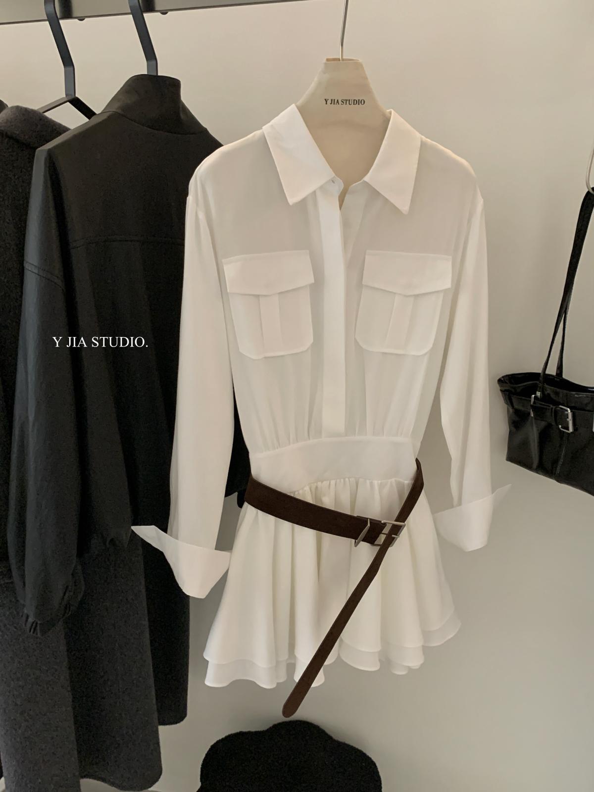 【C8643】山茶白茉莉~留白立裁捏褶收腰襯衫裙連衣裙(配腰帶)
