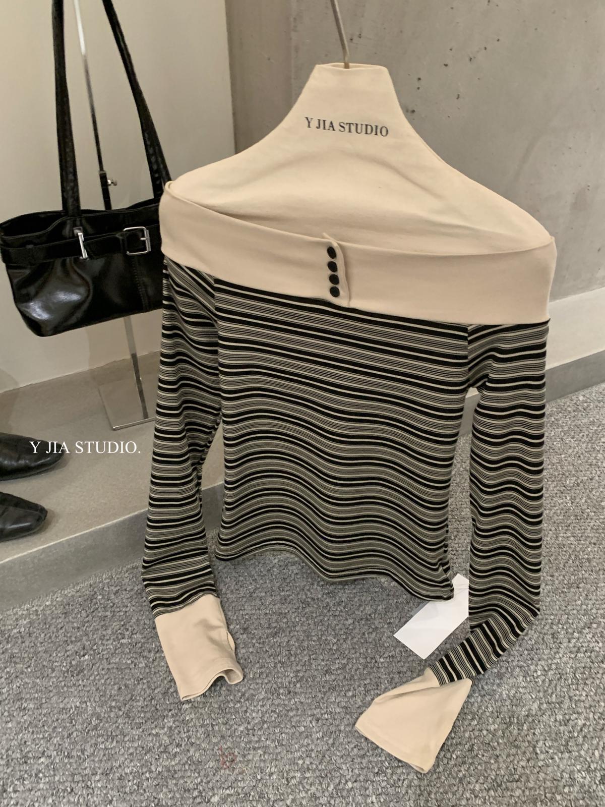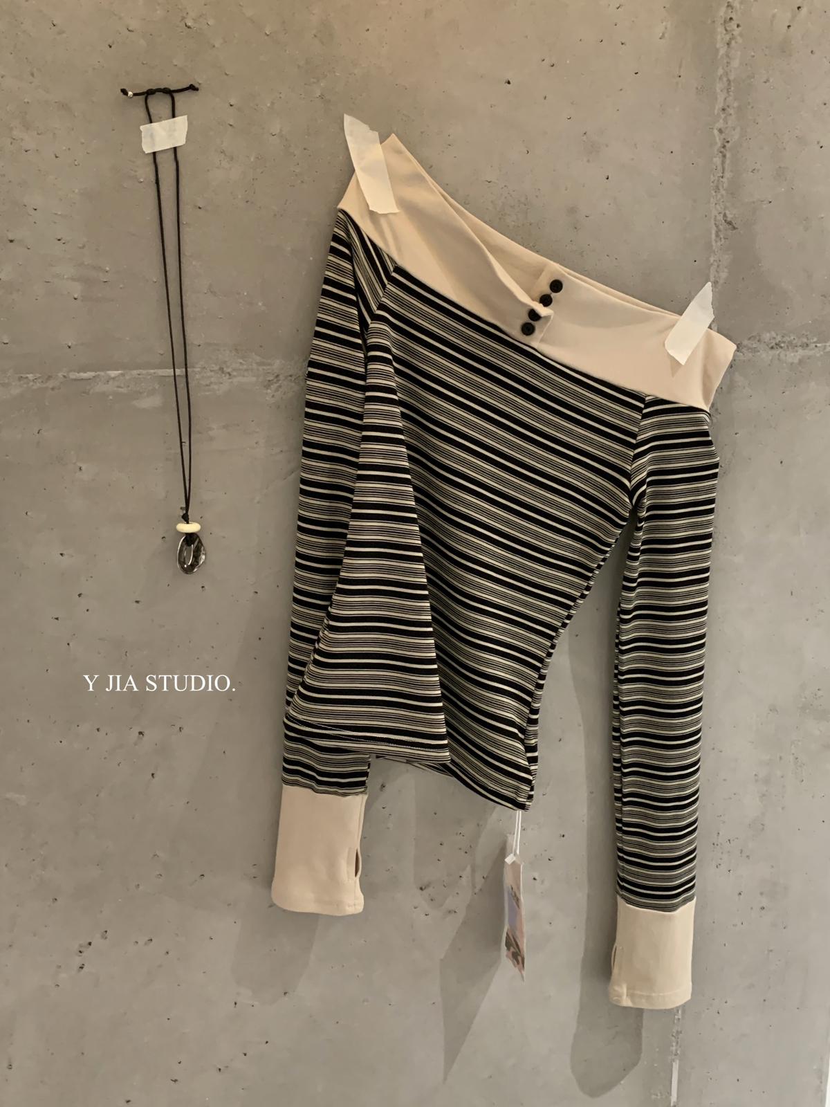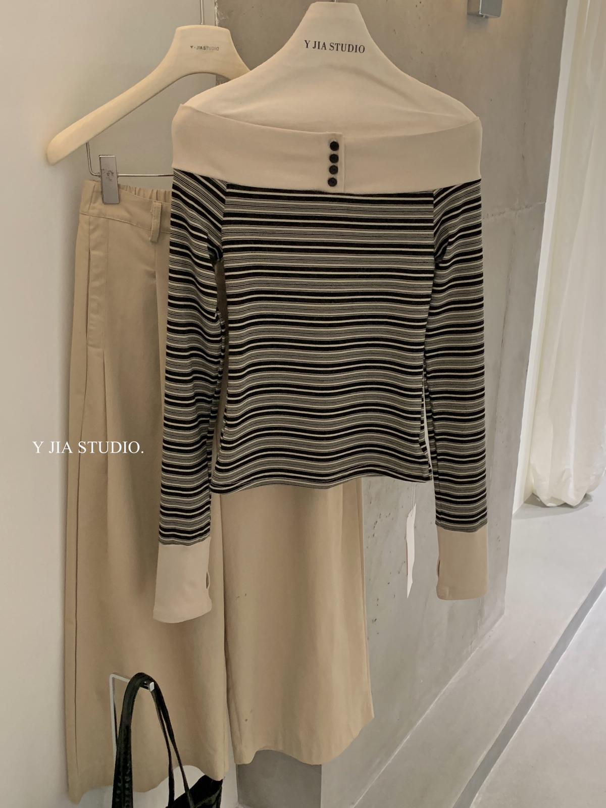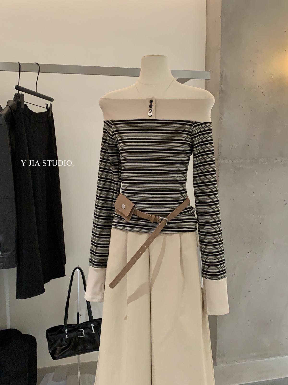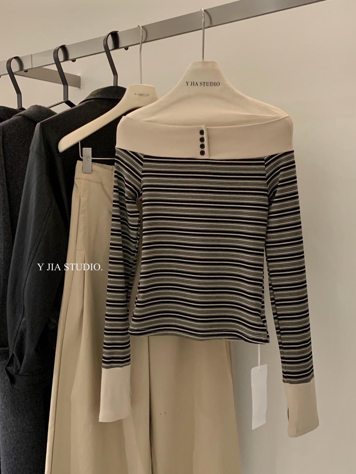 【C8644】時髦藝術生黑白條紋一字肩針織上衣長袖T恤