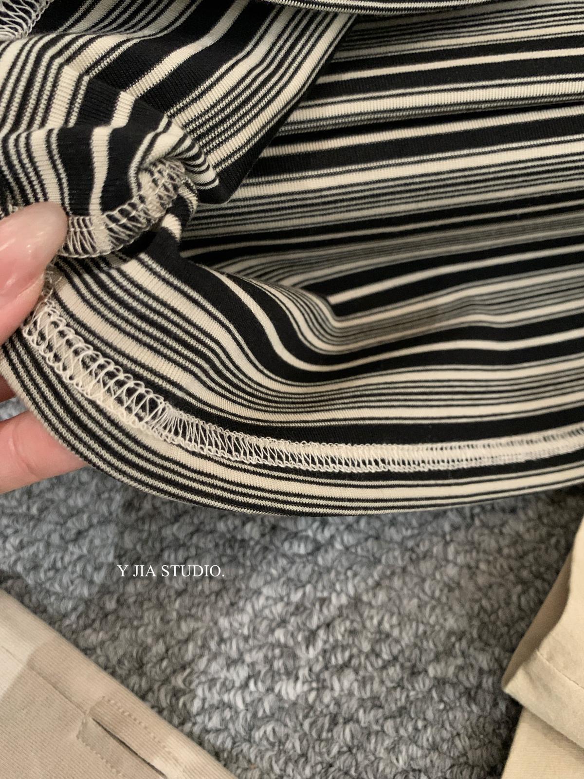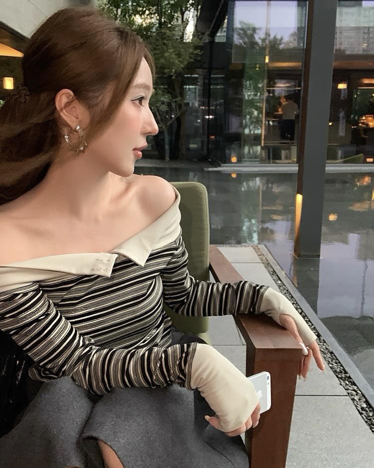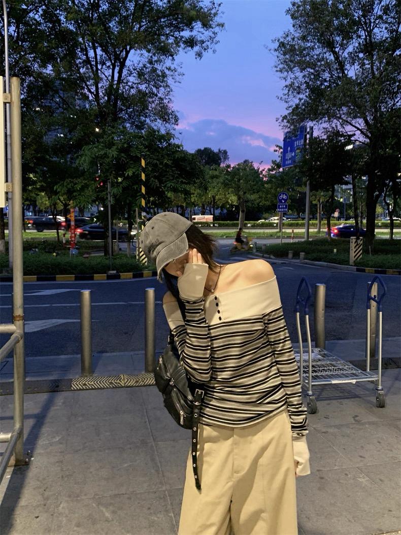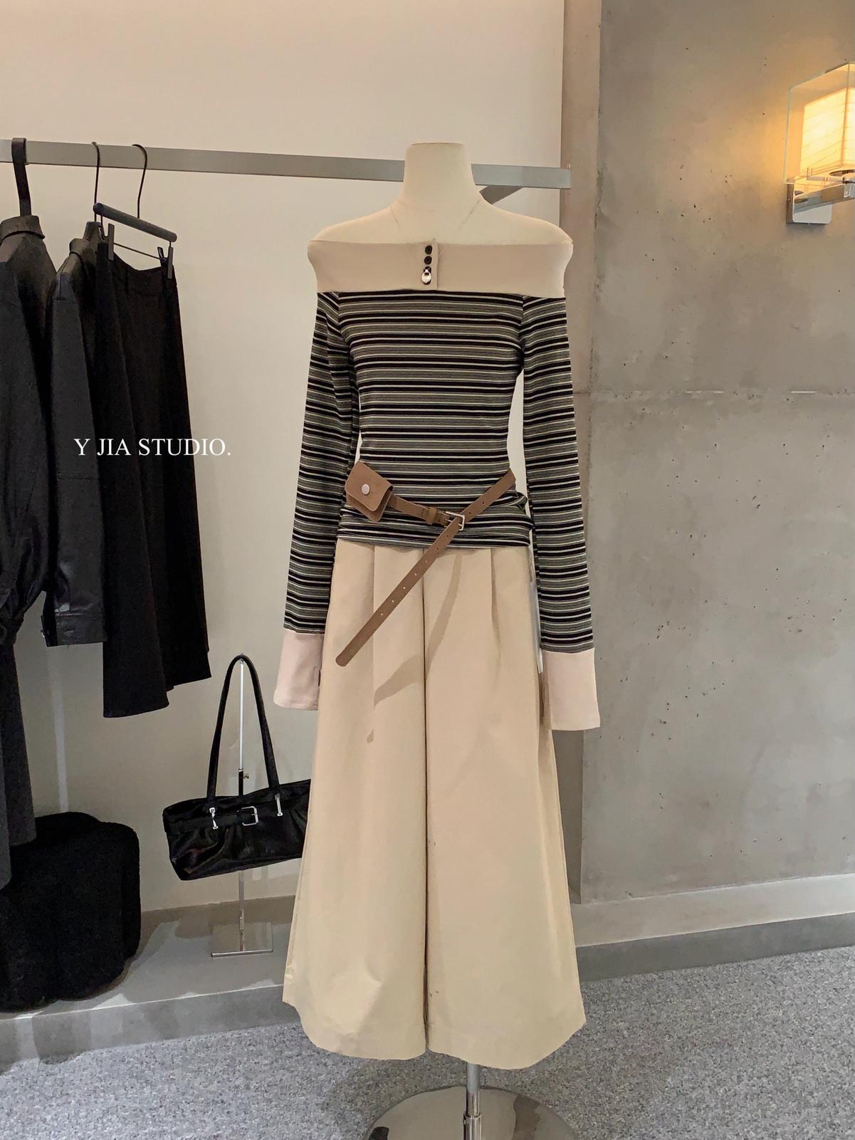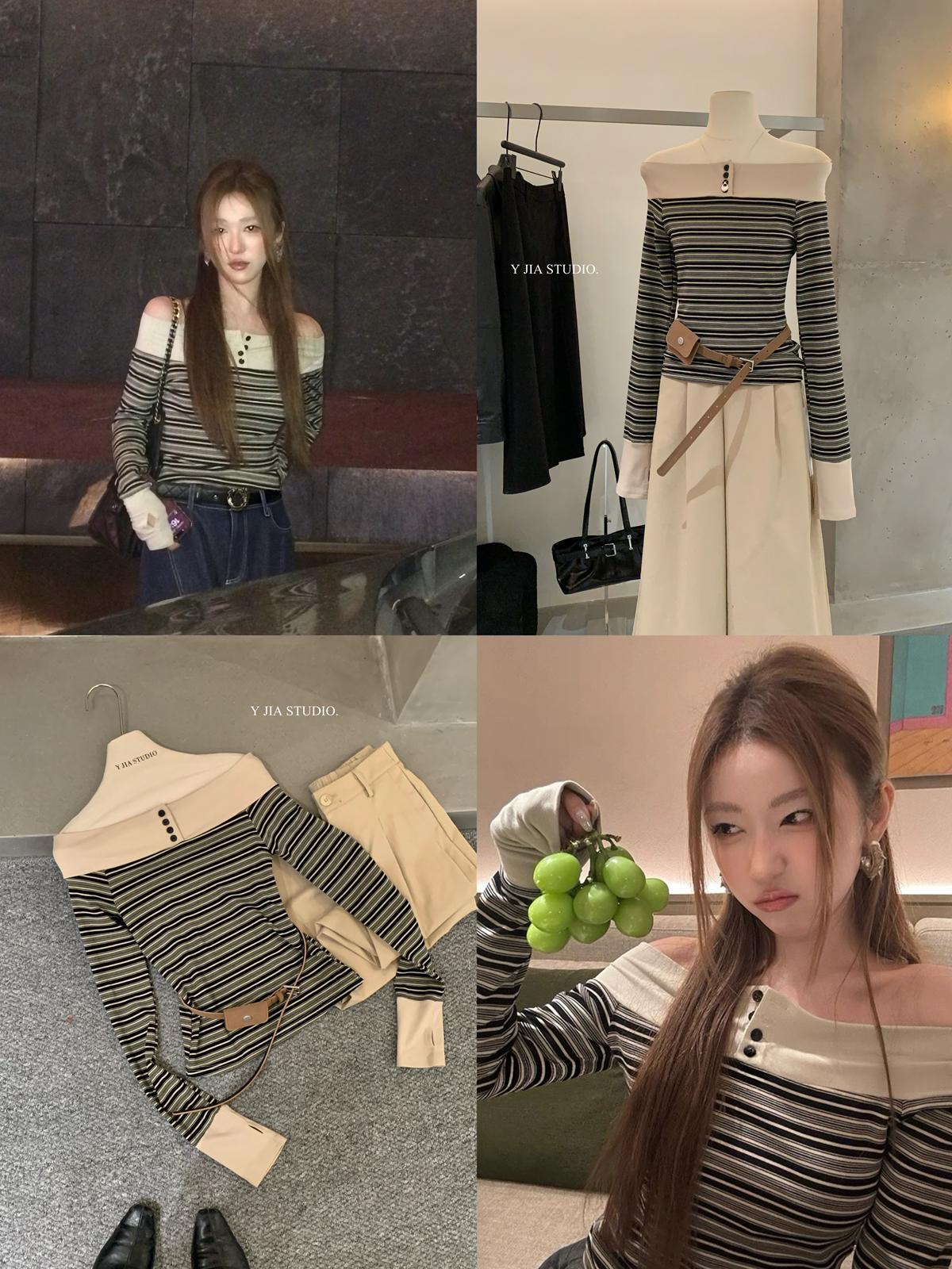 【C8644】時髦藝術生黑白條紋一字肩針織上衣長袖T恤