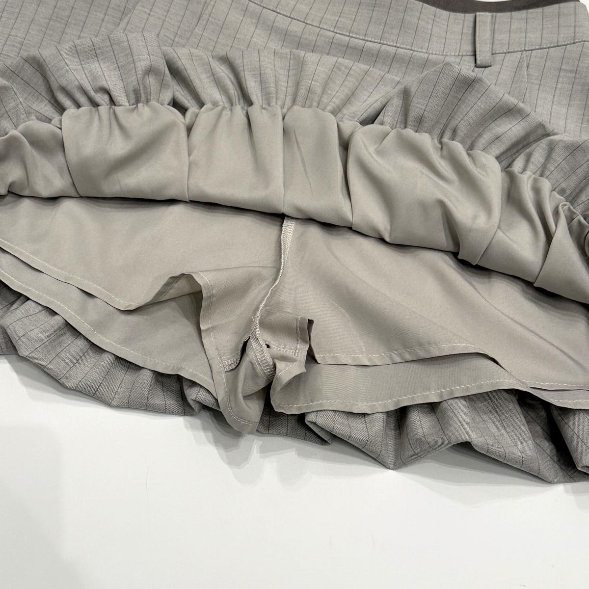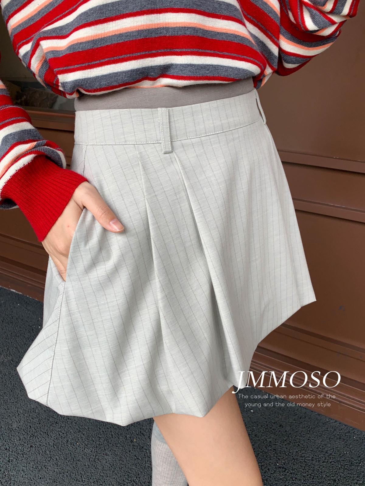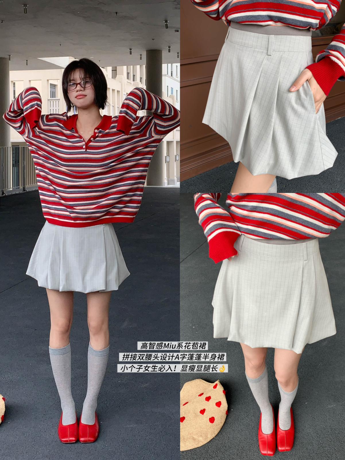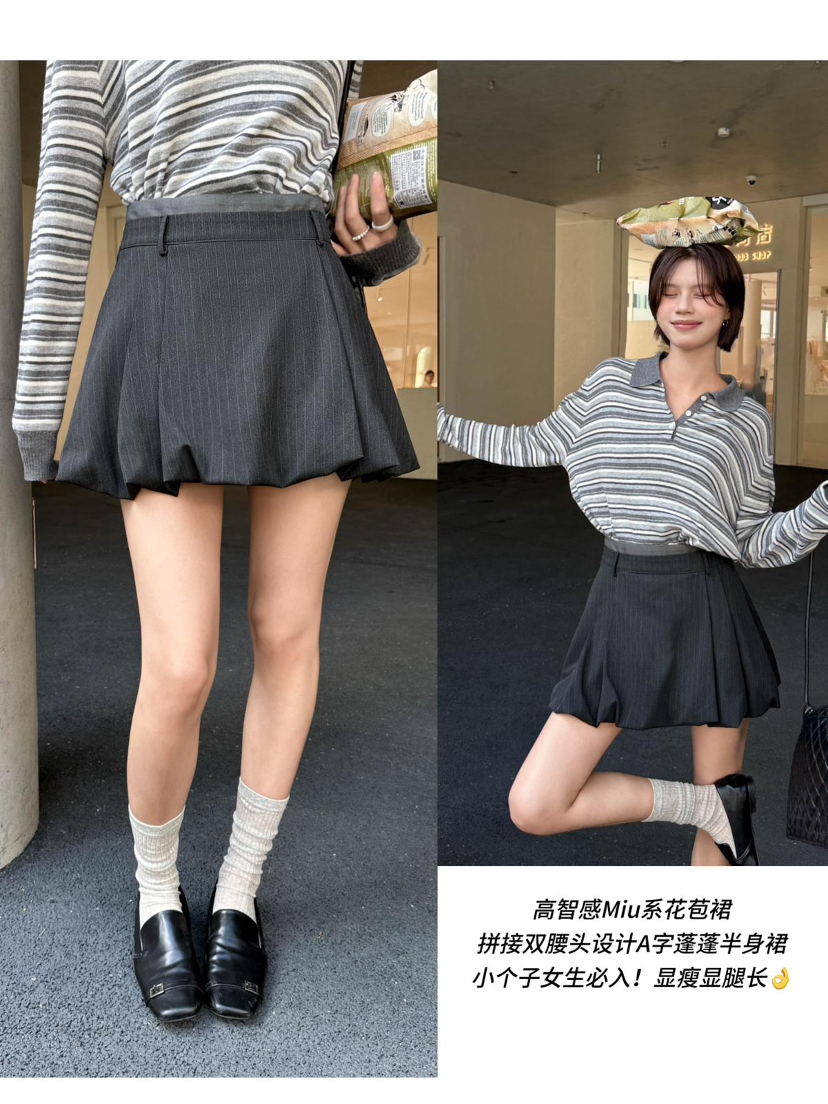 【C8654】韓版miu系蓬蓬花苞短裙!氣質減齡條紋撞色拼接高腰顯瘦半身裙(帶安全褲)