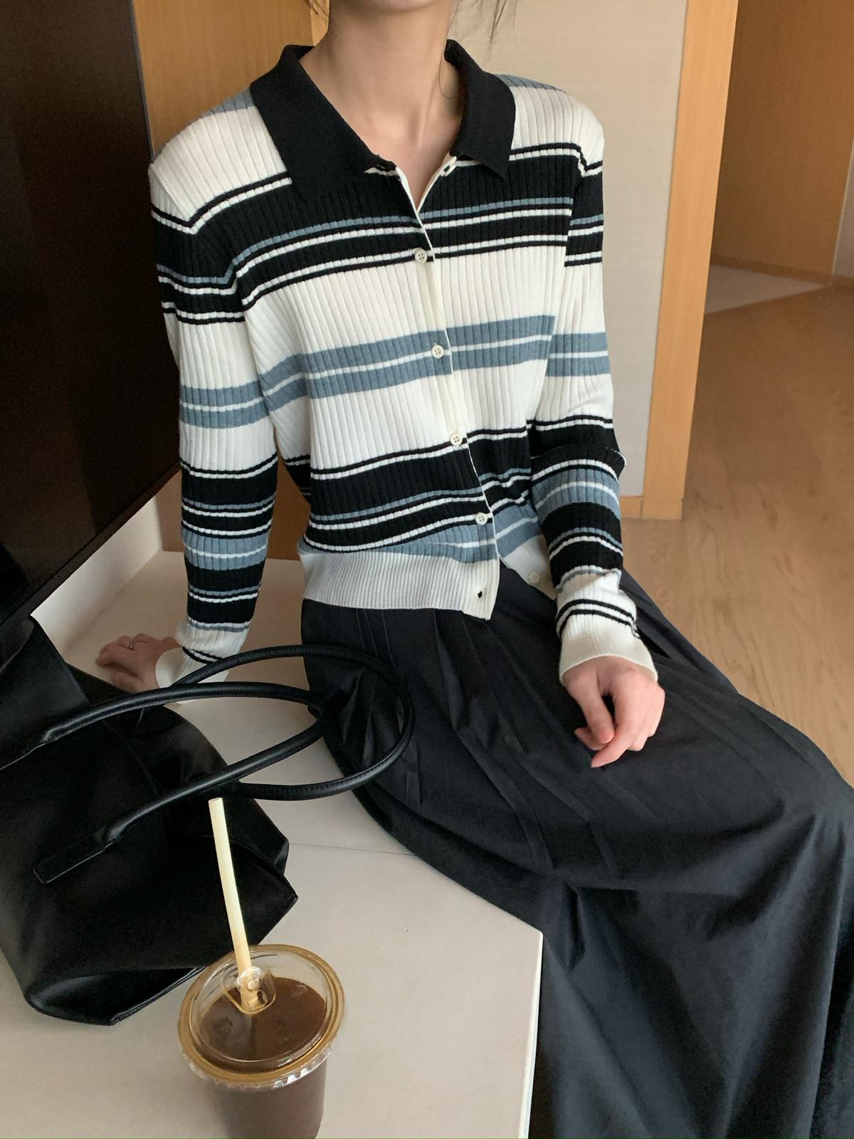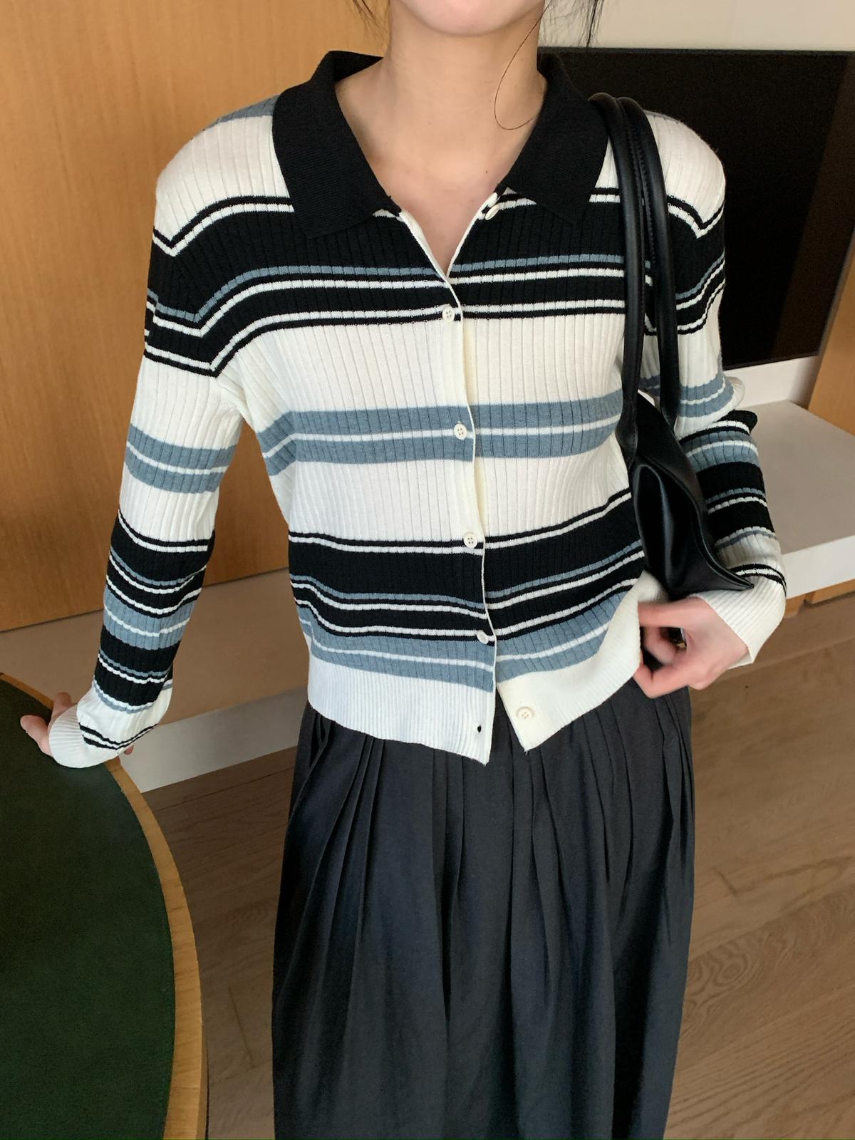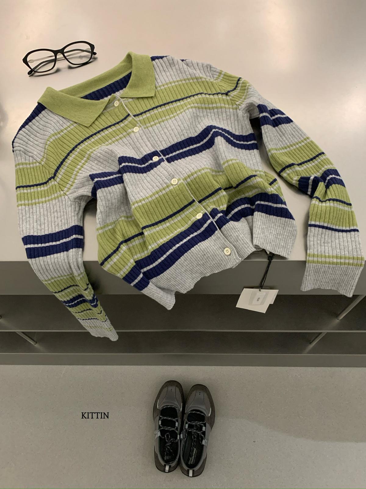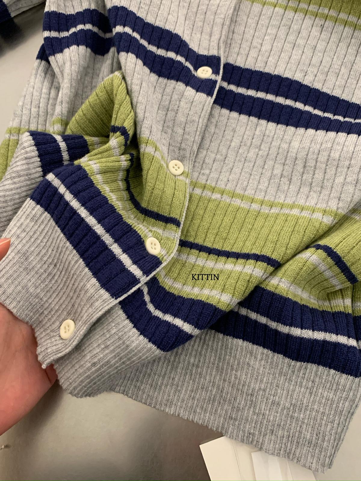 【C8678】清冷淡顏系撞色條紋翻領針織開衫(含4%羊毛)