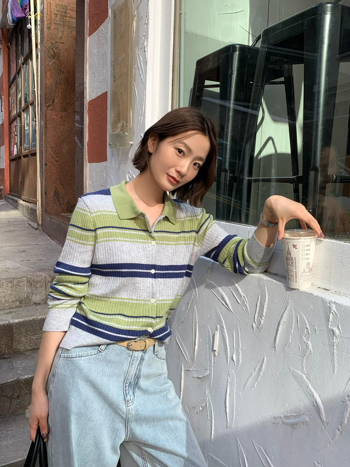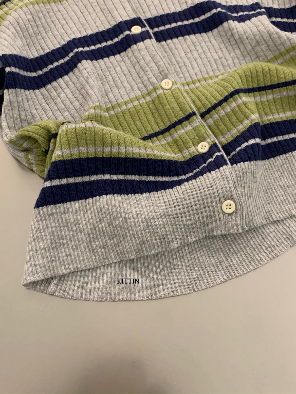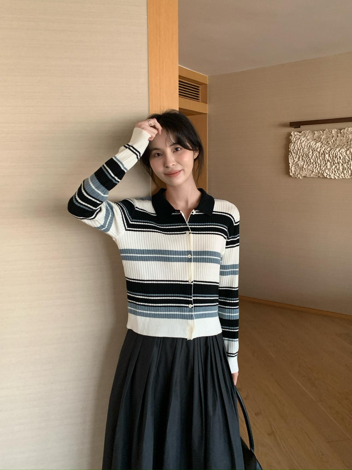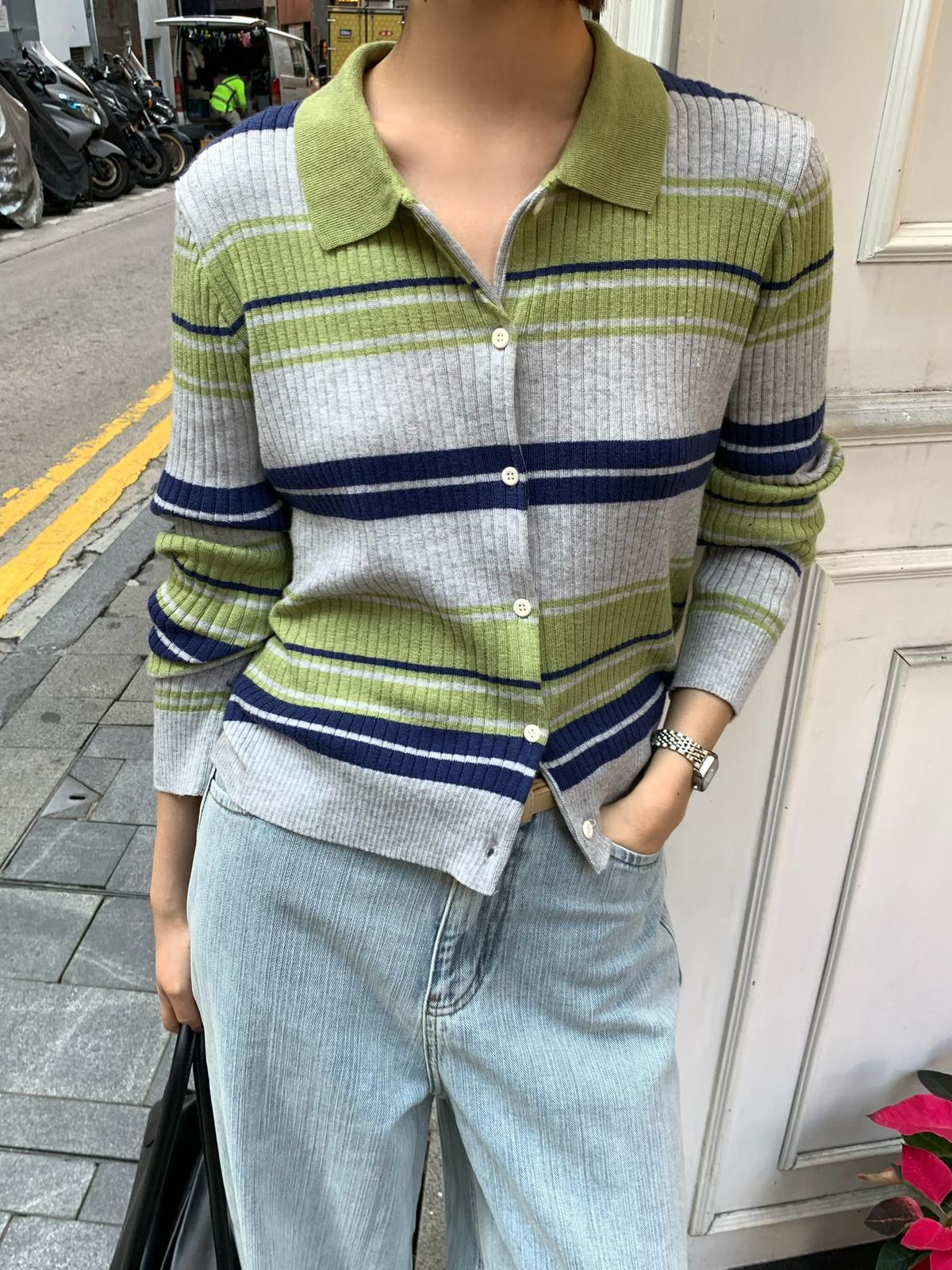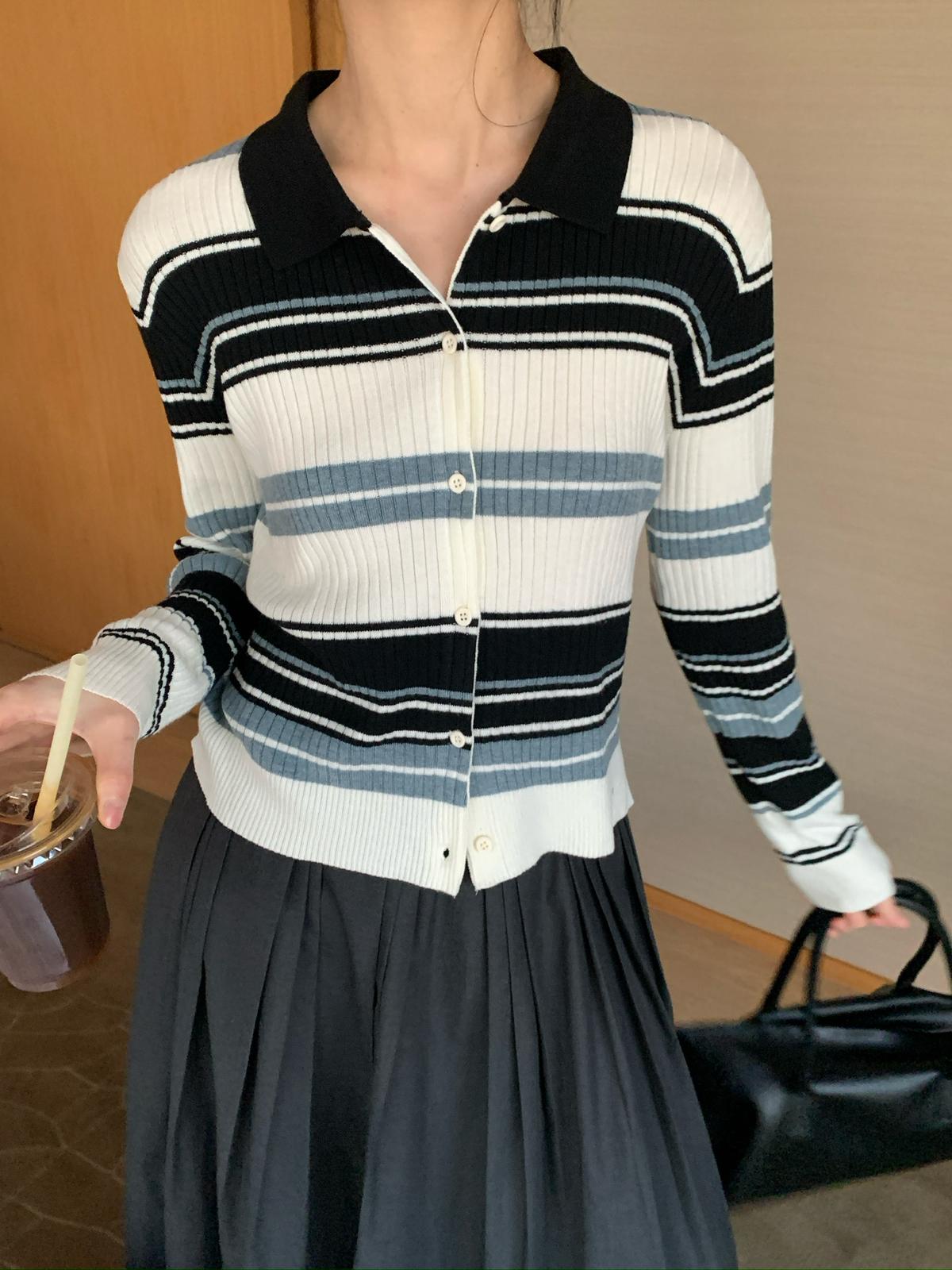 【C8678】清冷淡顏系撞色條紋翻領針織開衫(含4%羊毛)