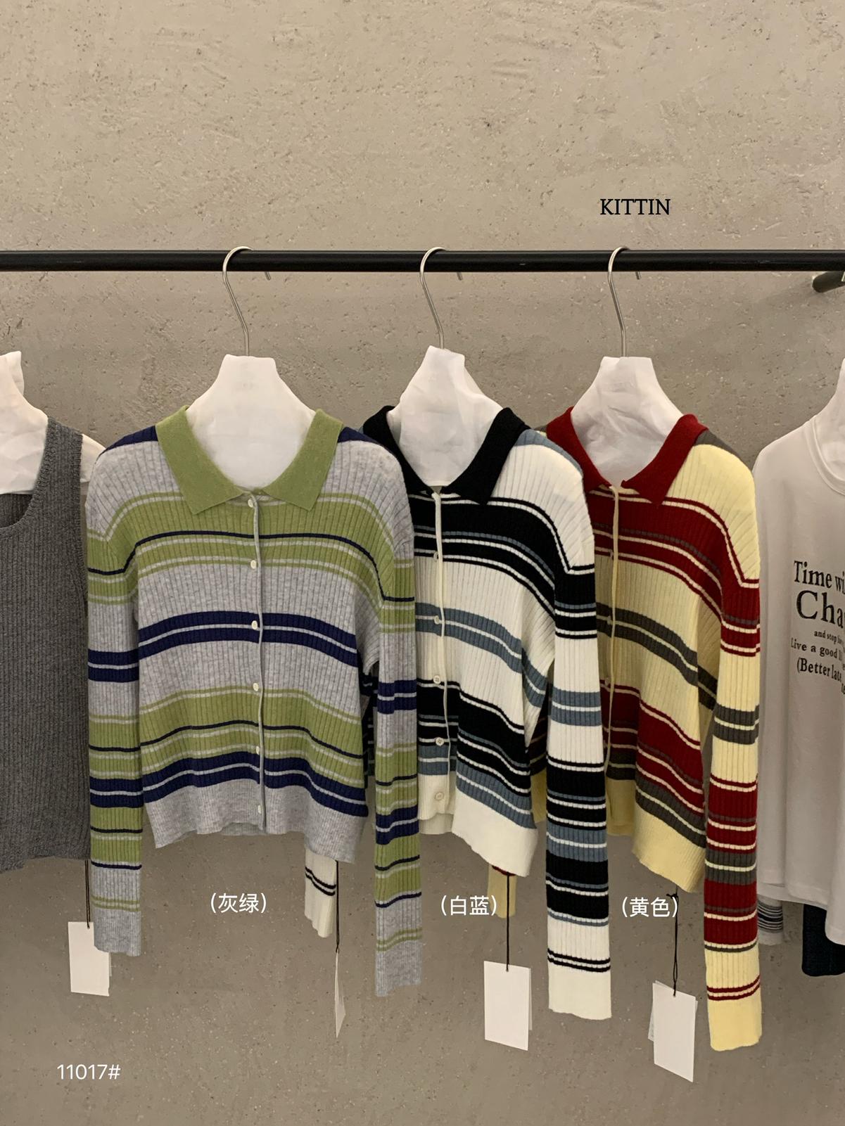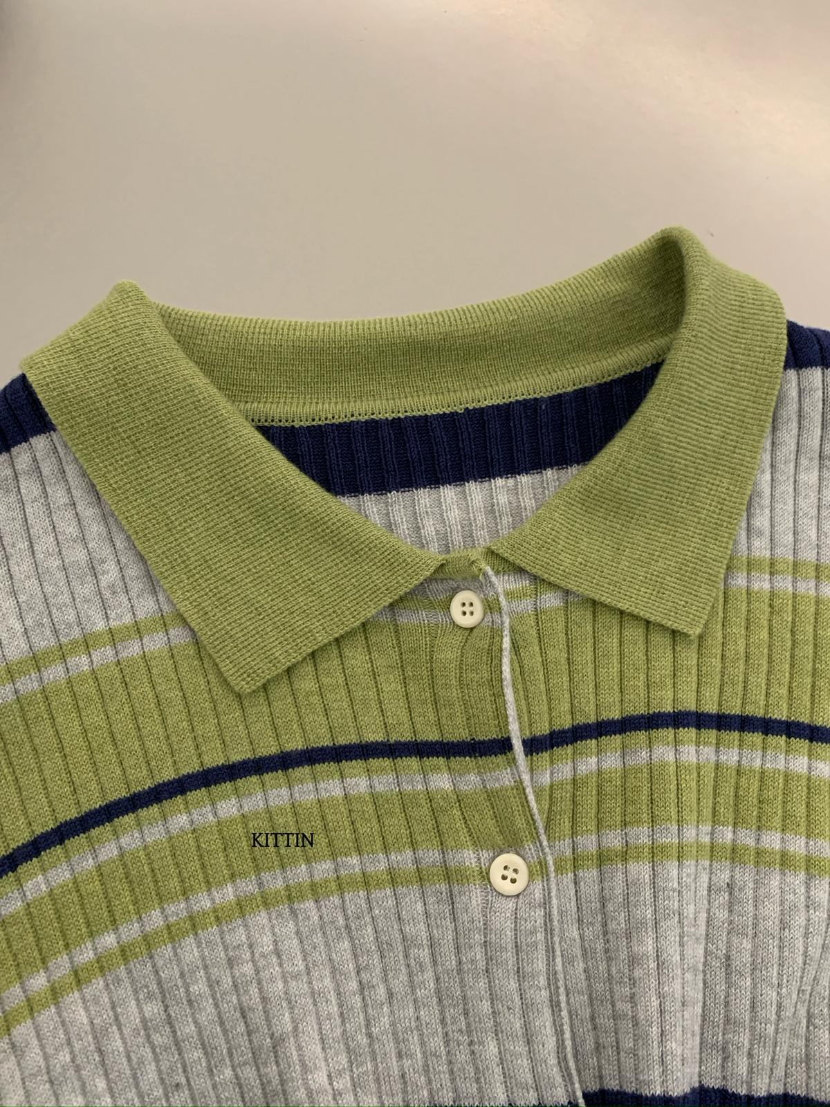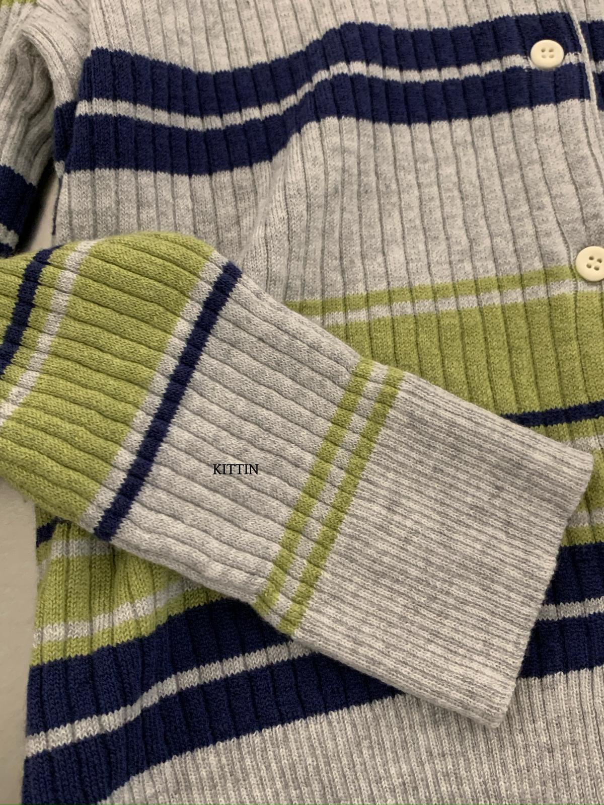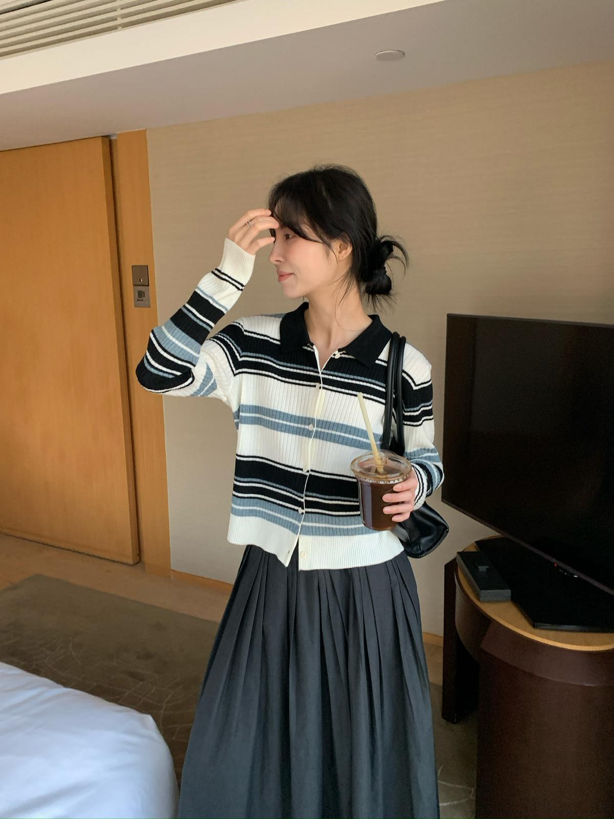 【C8678】清冷淡顏系撞色條紋翻領針織開衫(含4%羊毛)