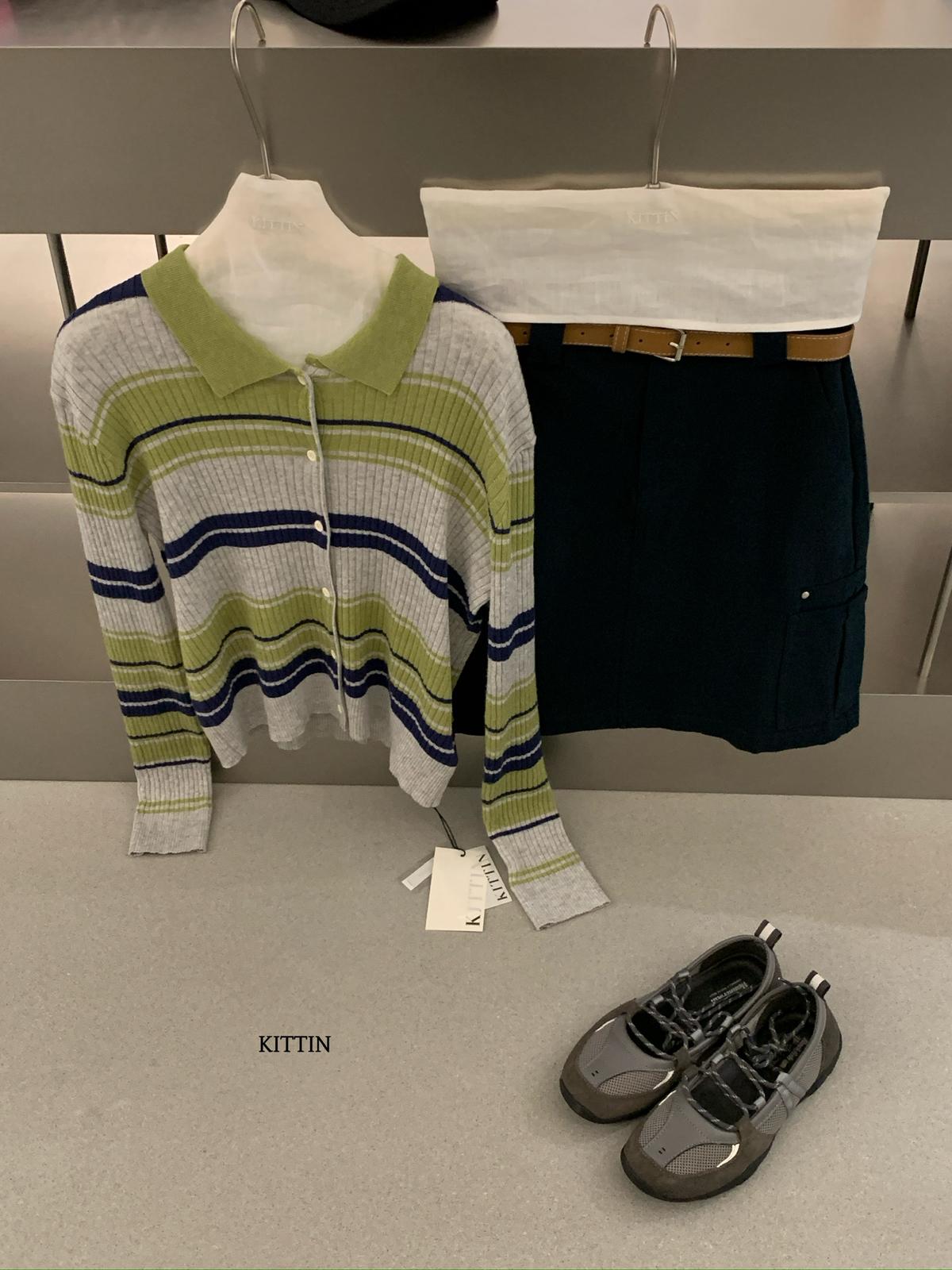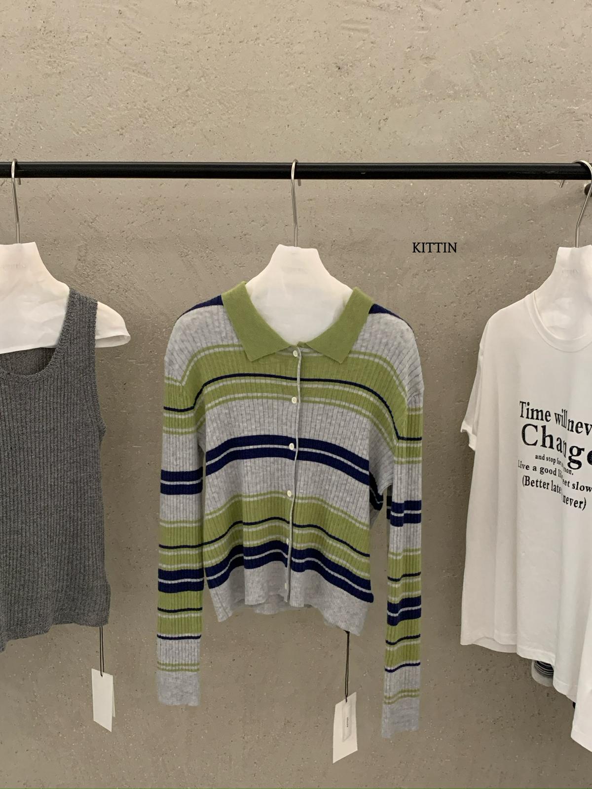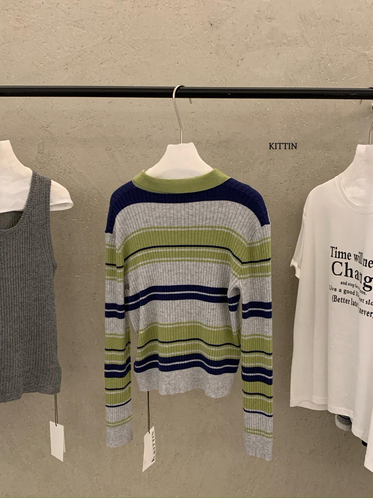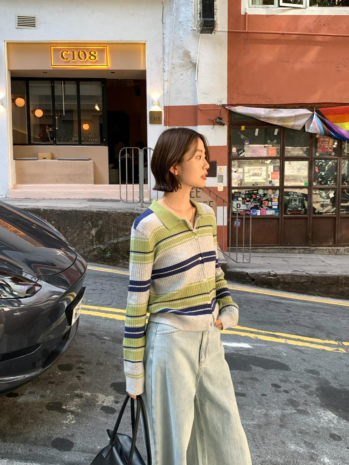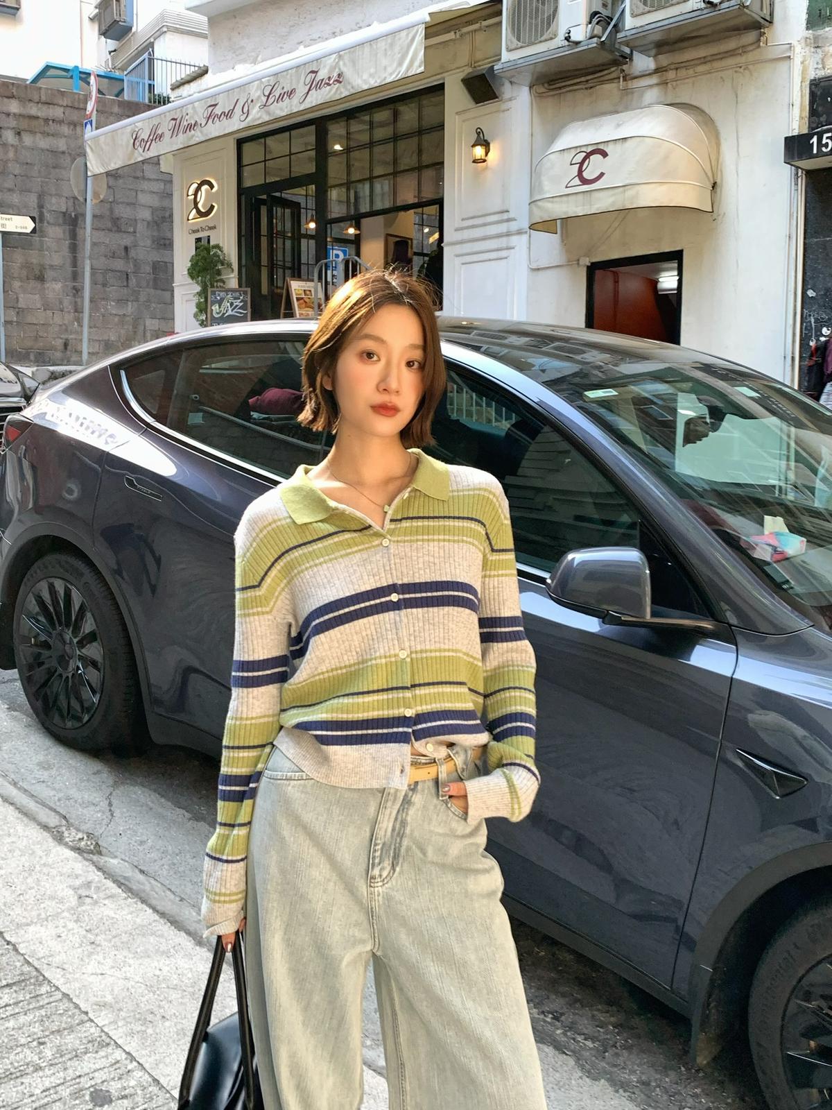 【C8678】清冷淡顏系撞色條紋翻領針織開衫(含4%羊毛)