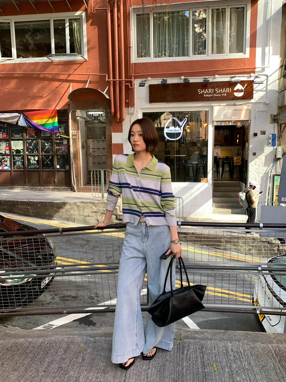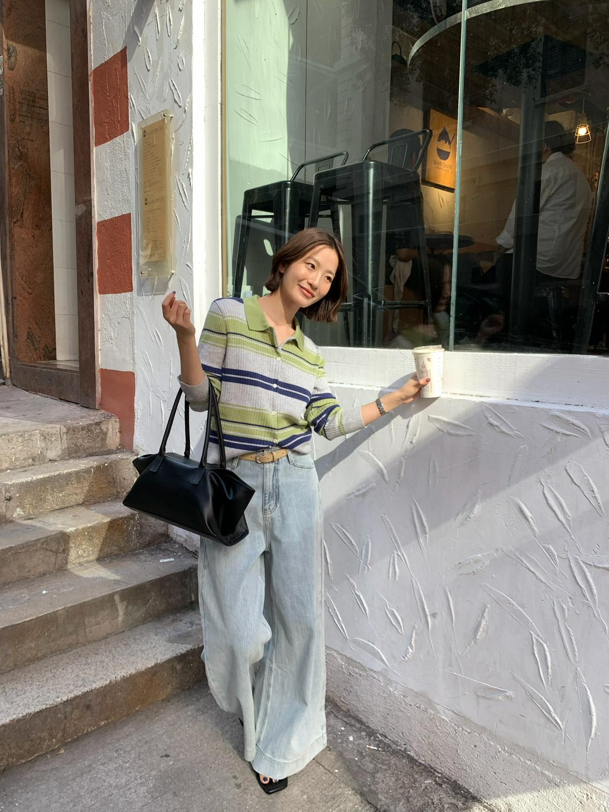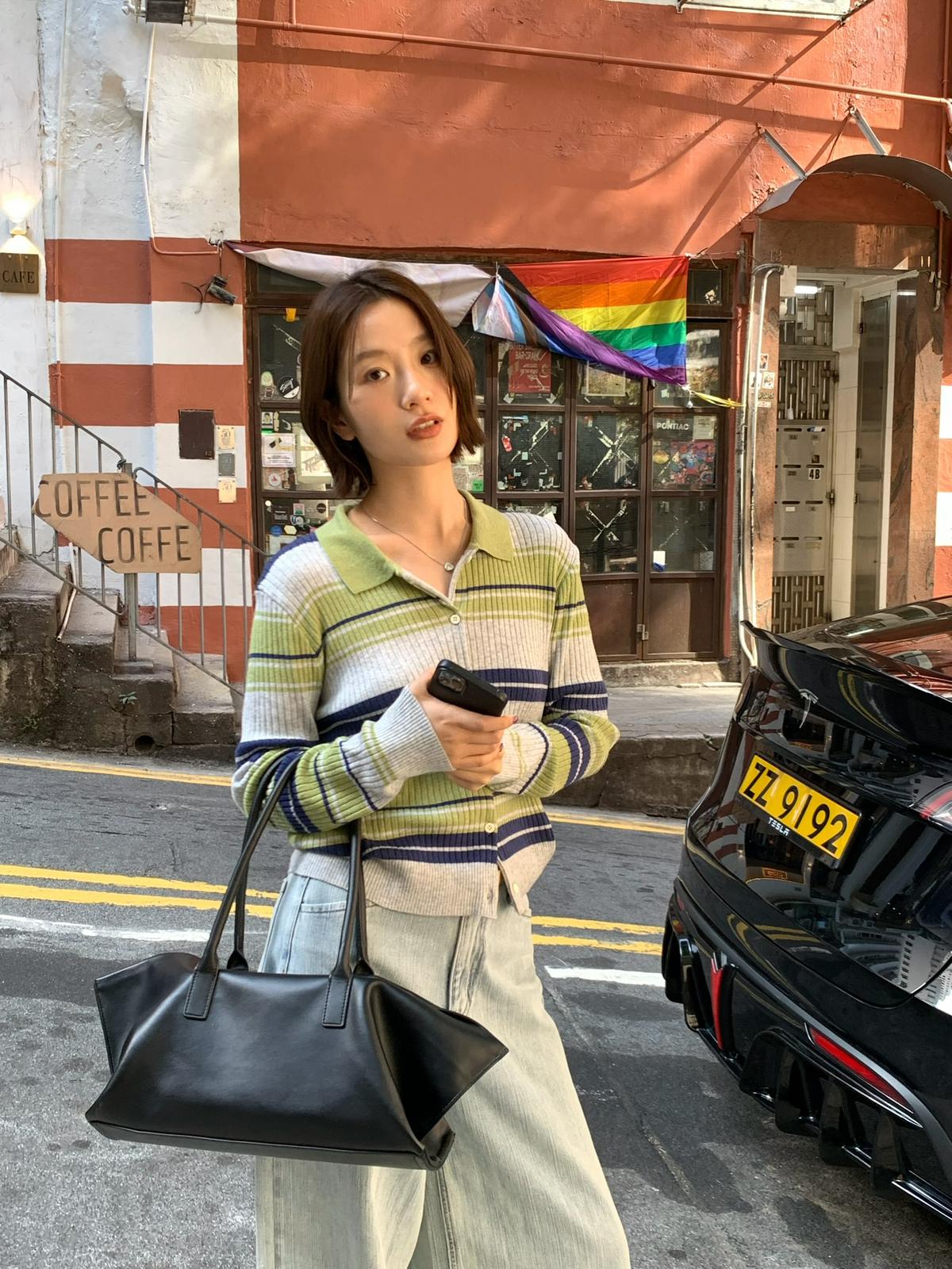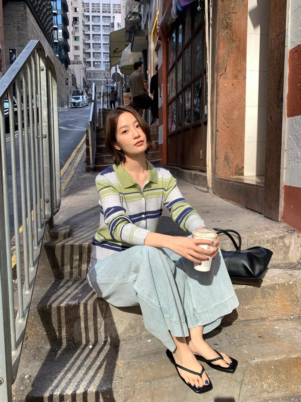 【C8678】清冷淡顏系撞色條紋翻領針織開衫(含4%羊毛)