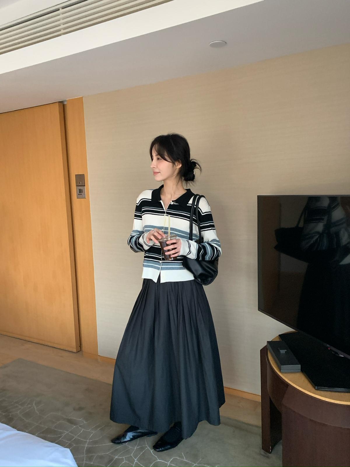 【C8665】簡約帶帽寬鬆條紋百搭半身裙+短外套套裝