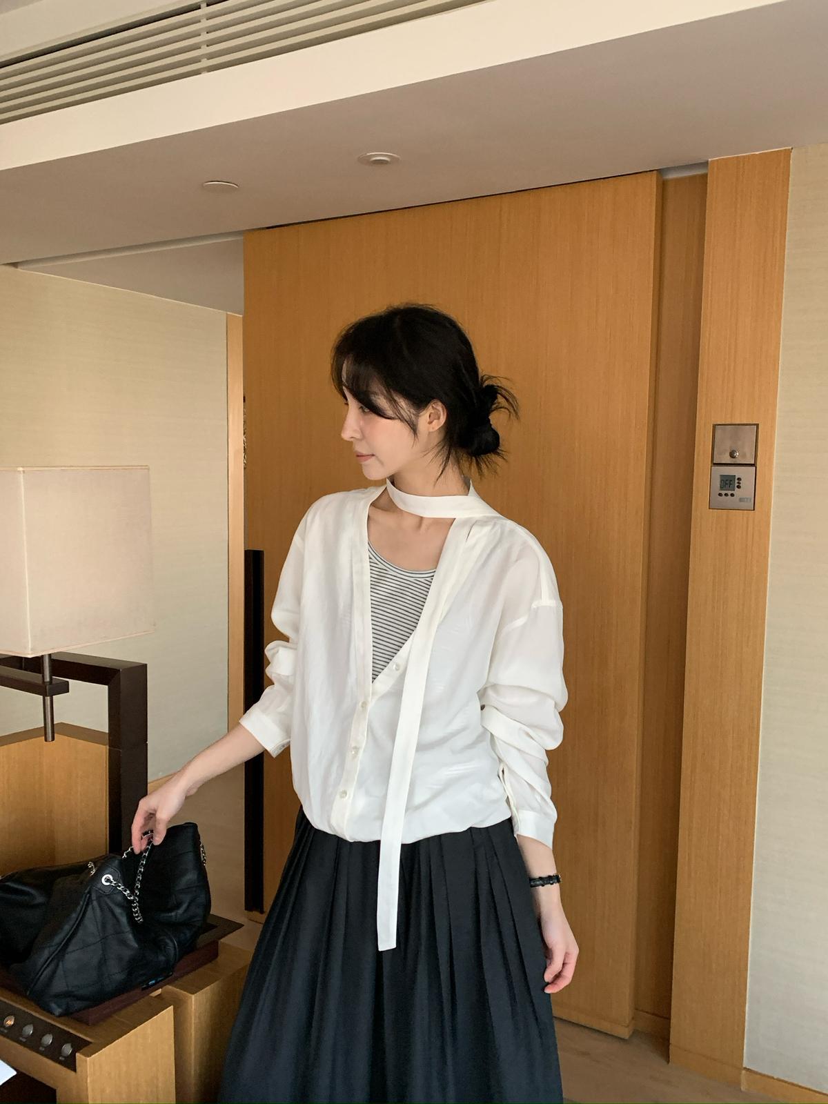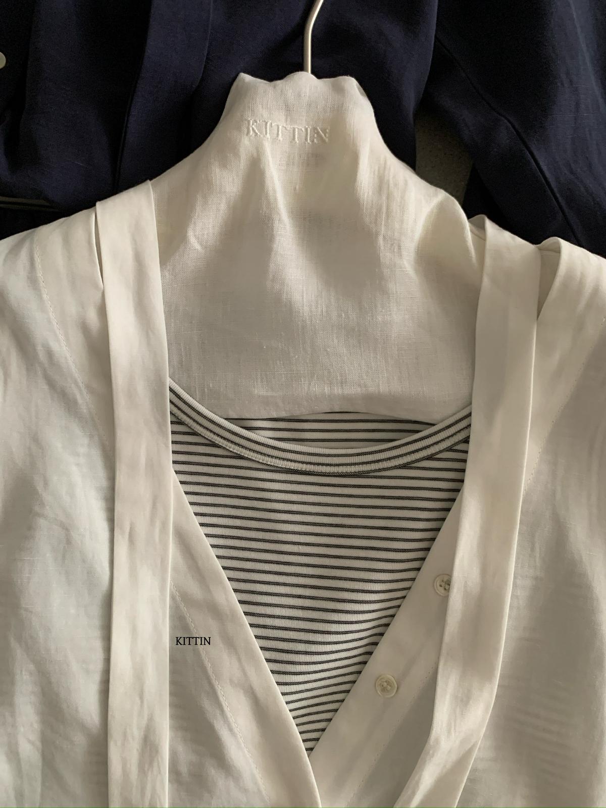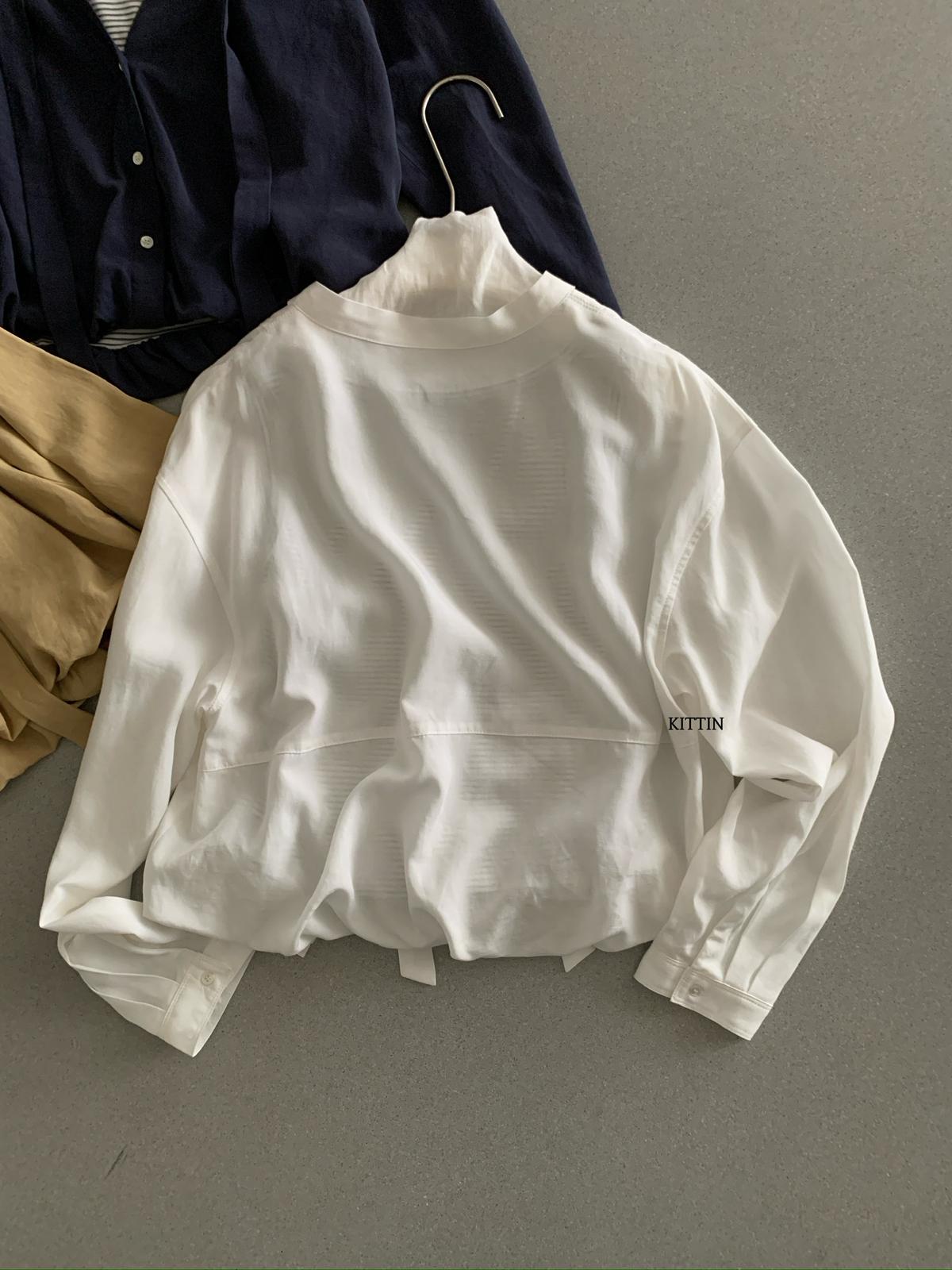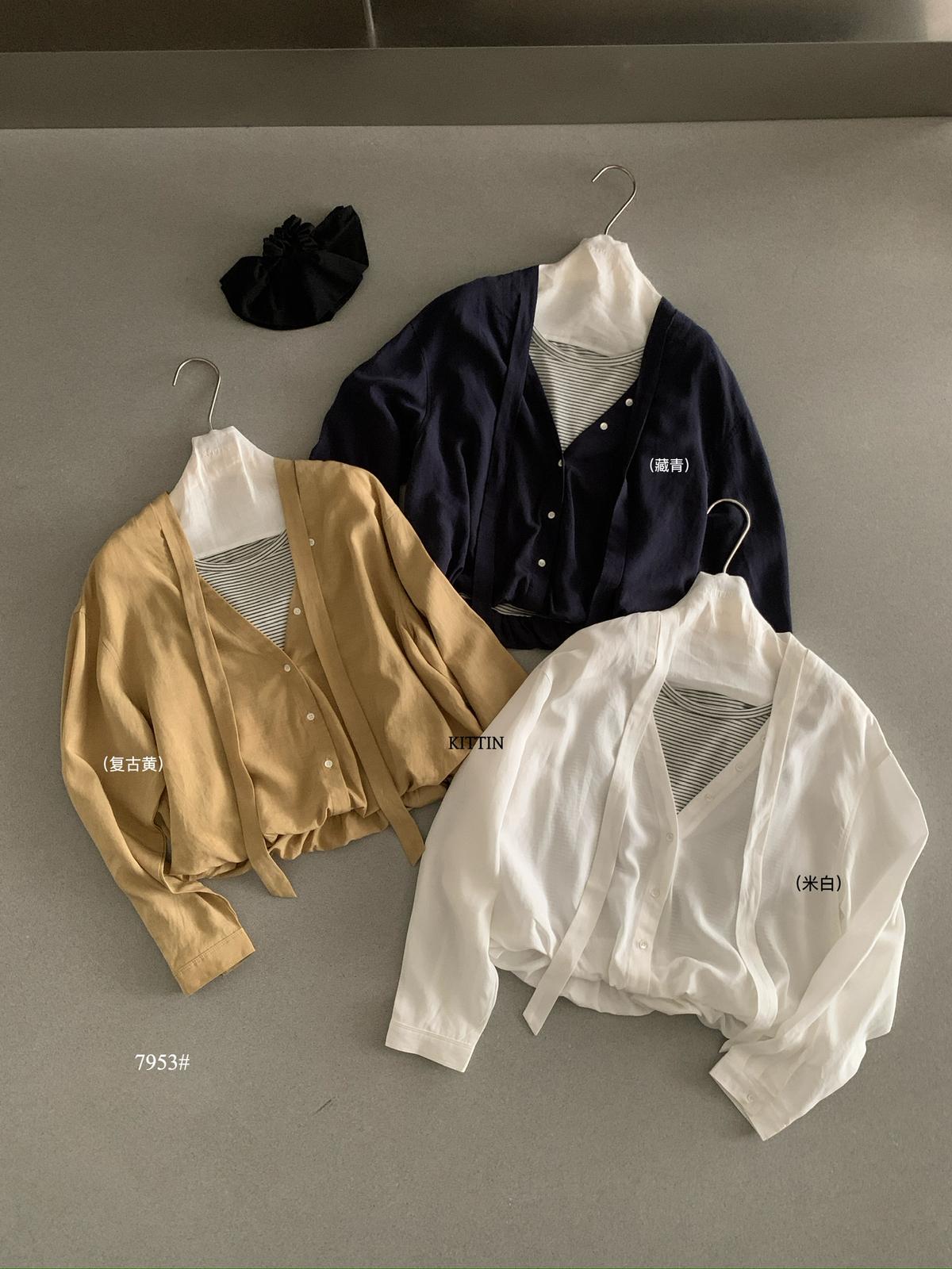 【C8680】慵懶氛圍感假兩件條紋拼接萊賽爾亞麻小衫