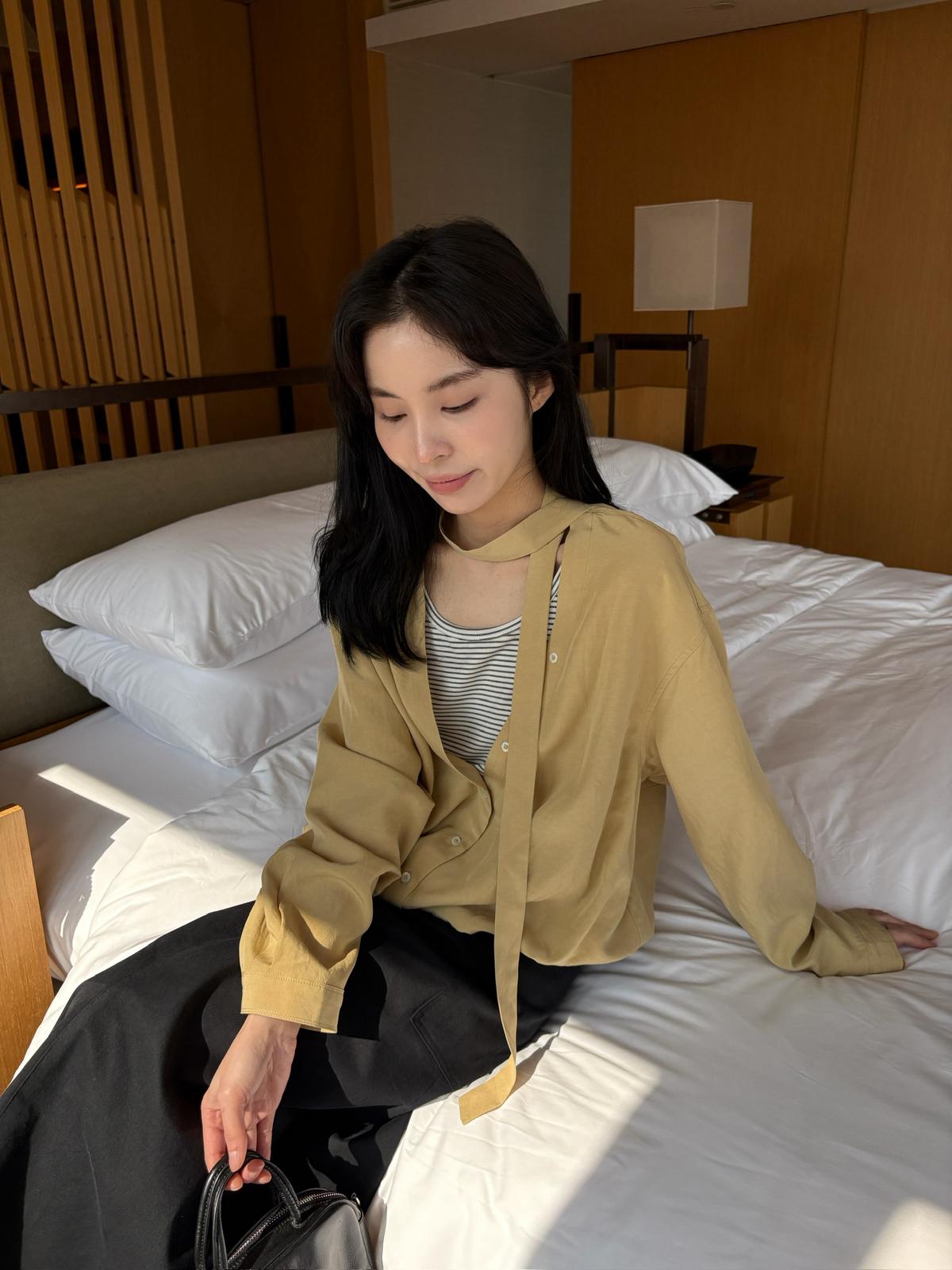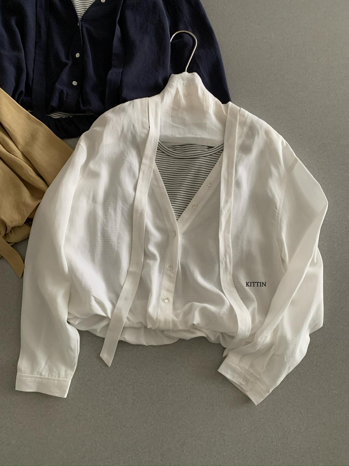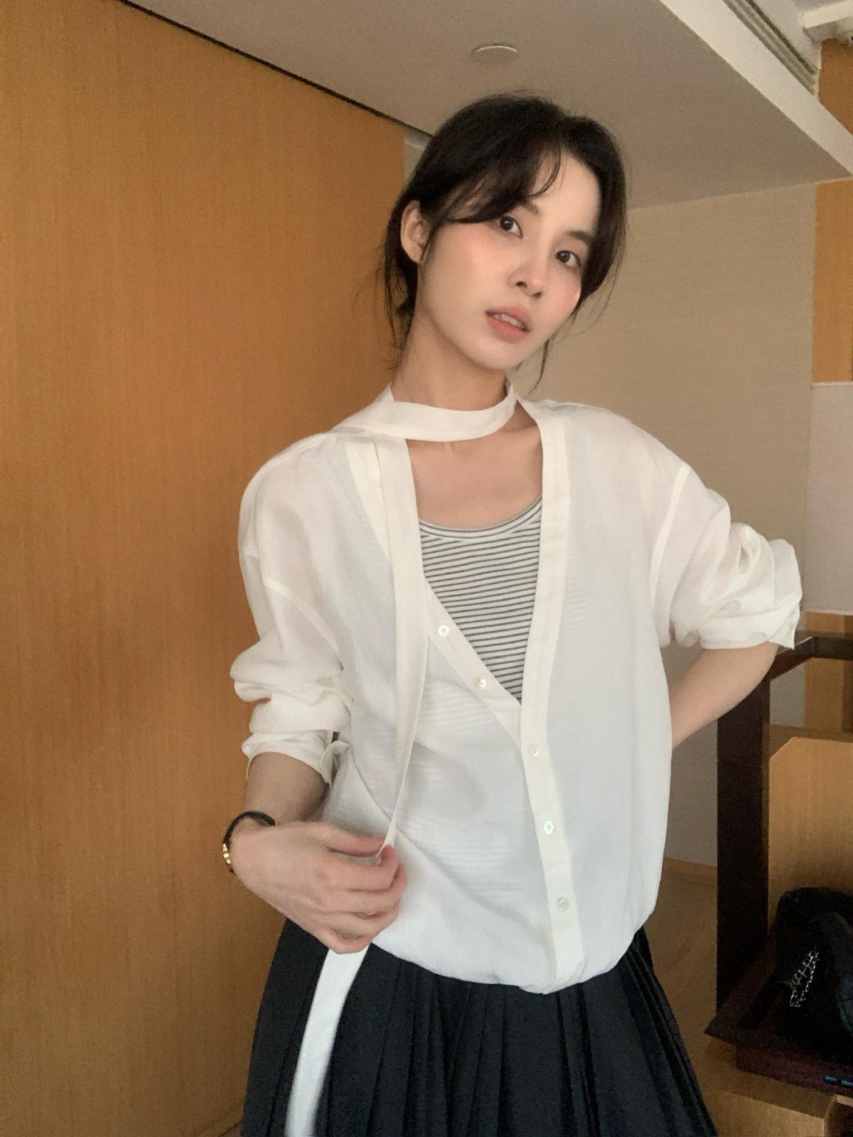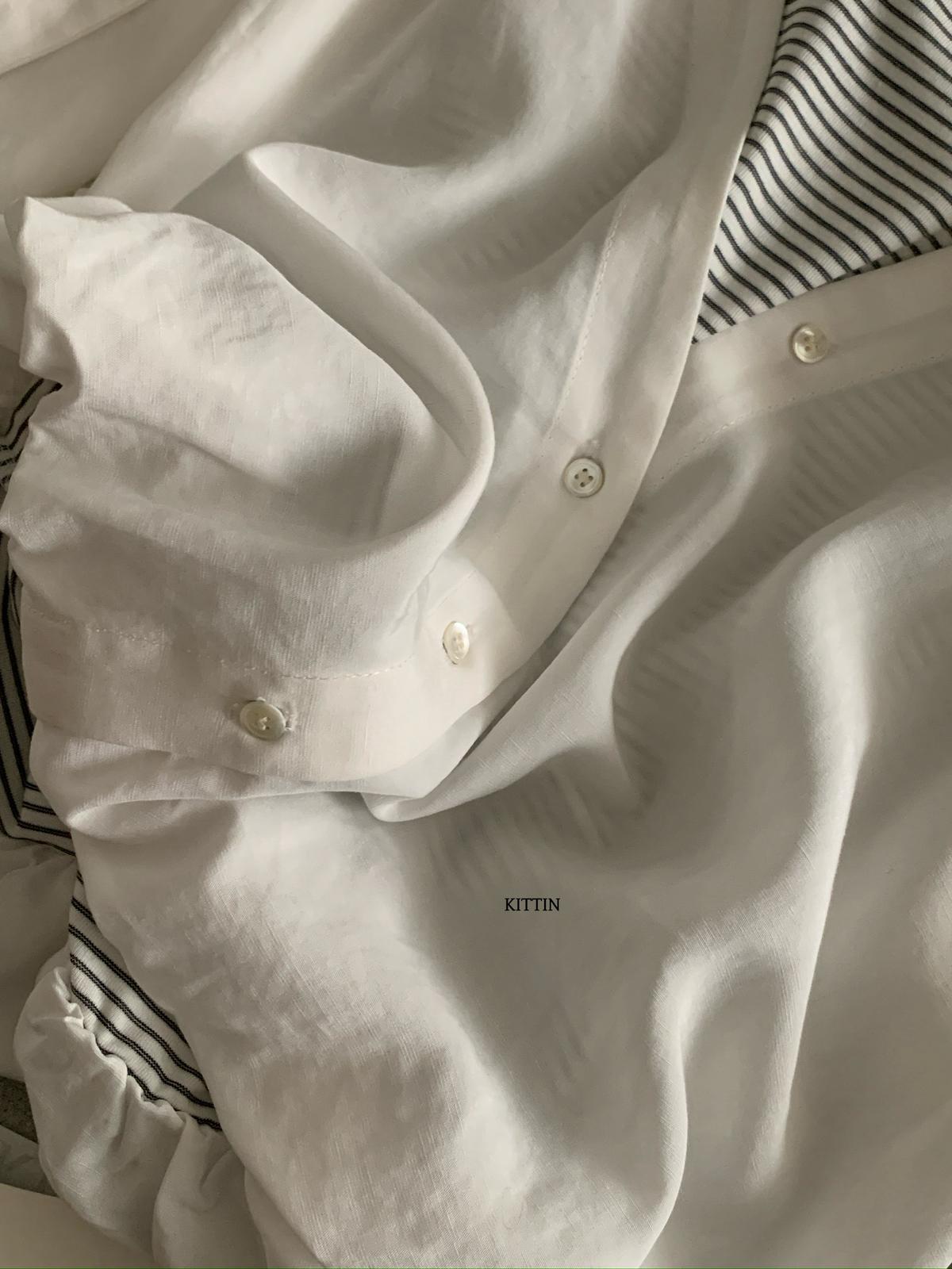 【C8680】慵懶氛圍感假兩件條紋拼接萊賽爾亞麻小衫