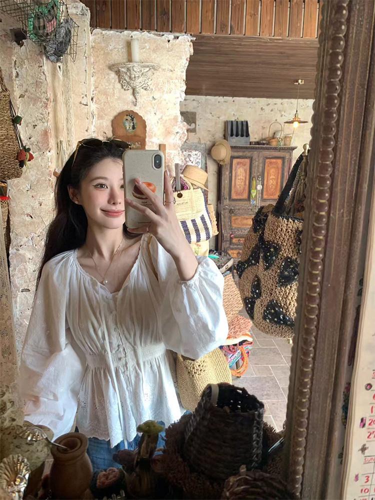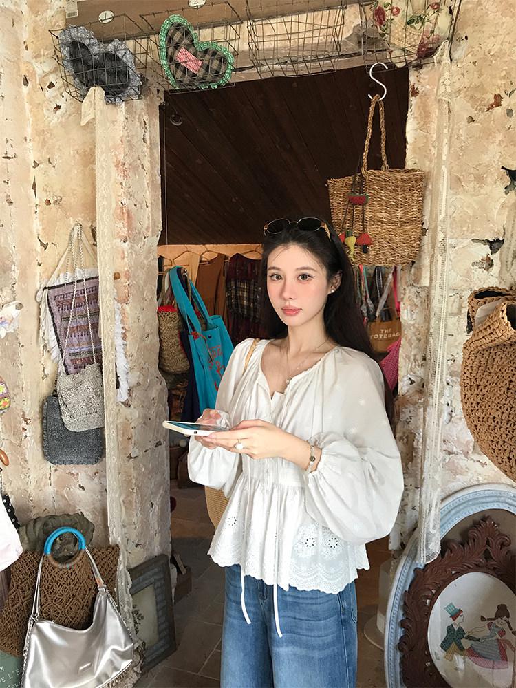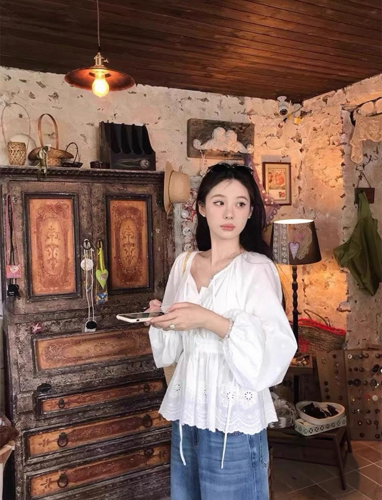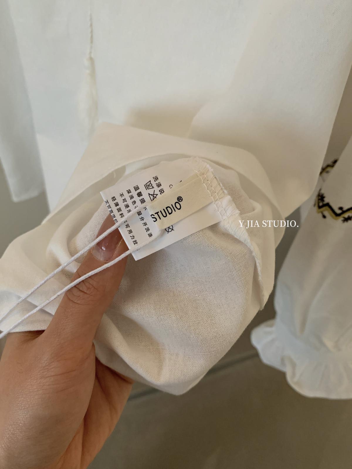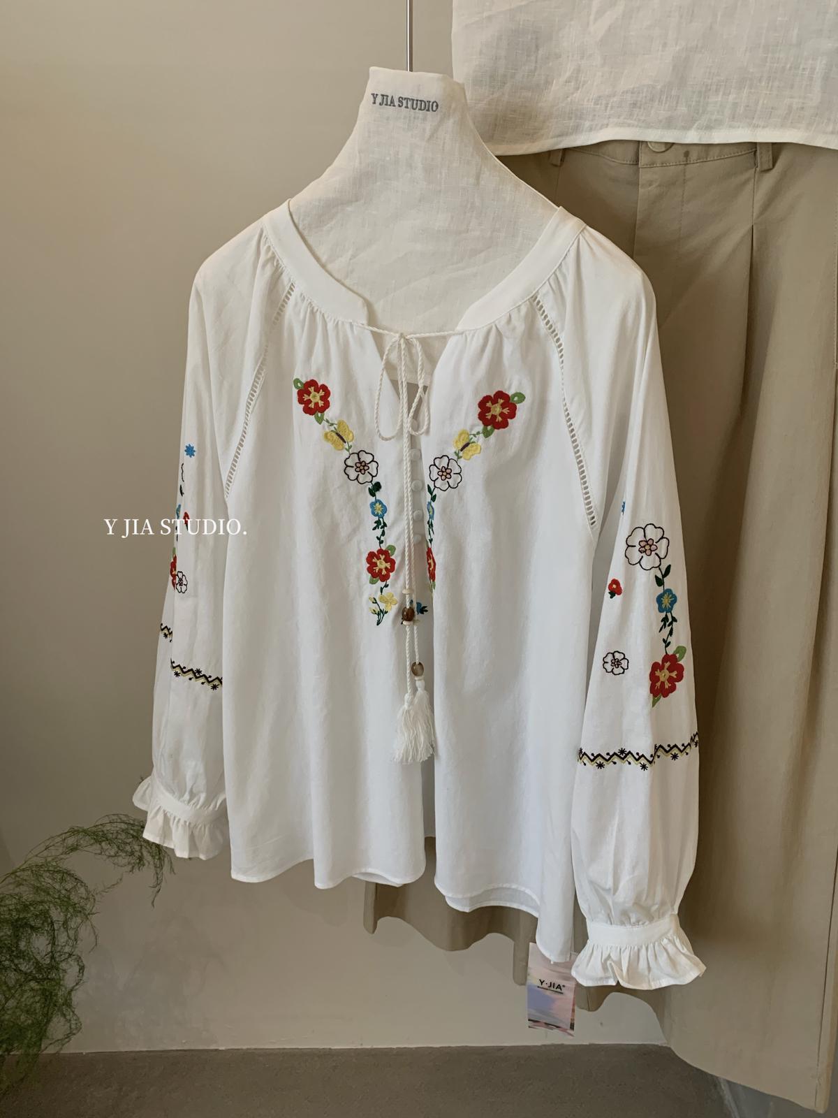 【C8688】設計感刺繡花邊燈籠袖寬鬆顯瘦襯衣小衫襯衫