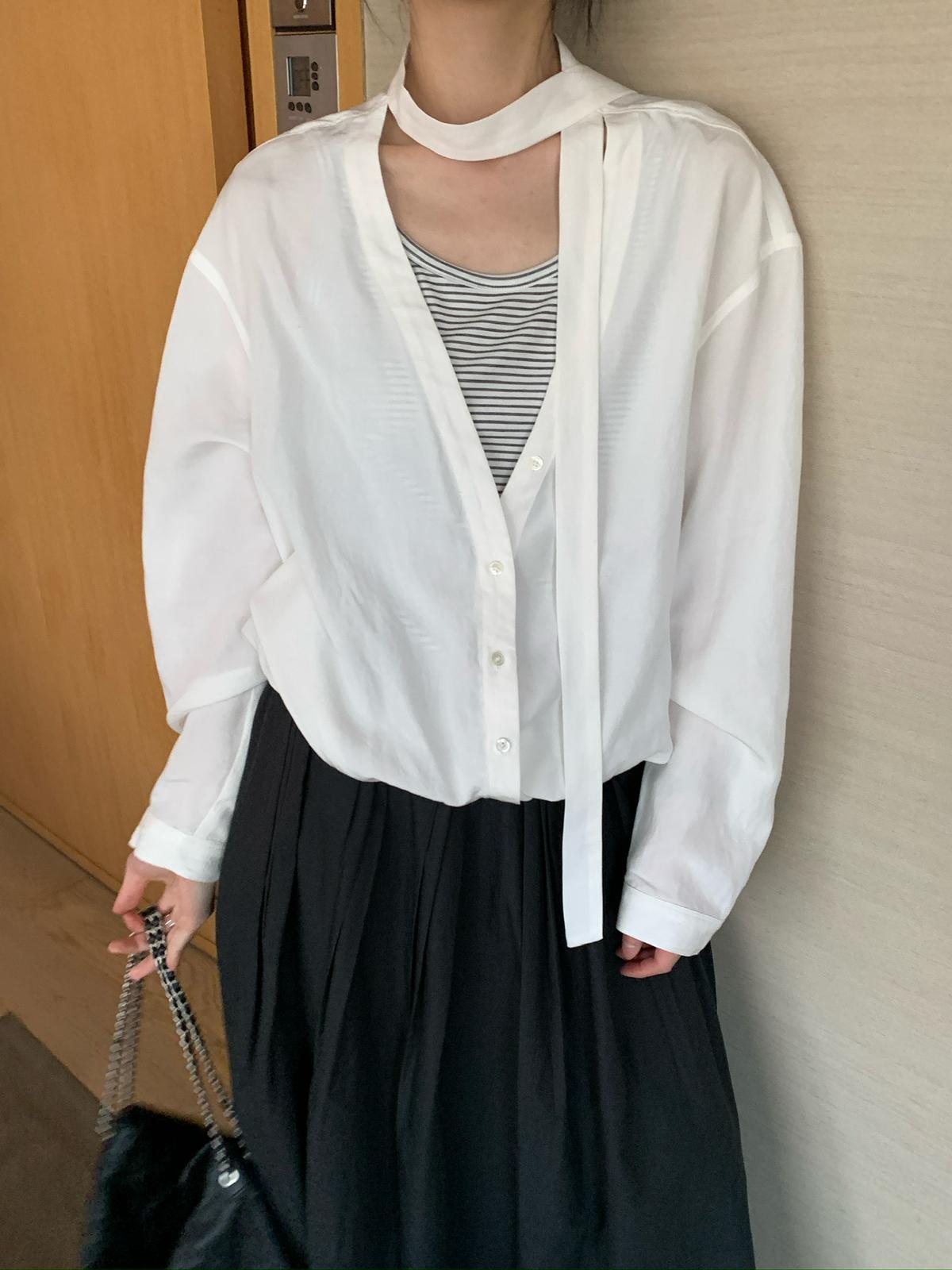 【C8666】繆系設計感撞色拼接領小刺繡假兩件v領長袖T恤