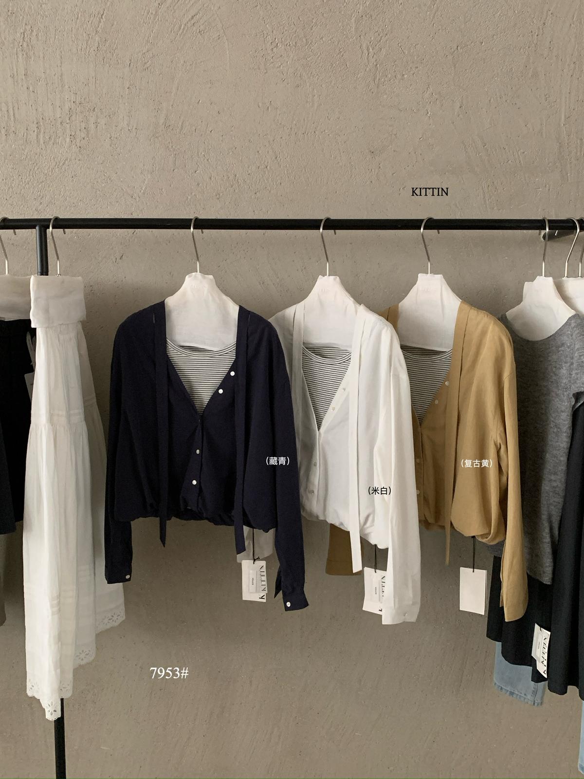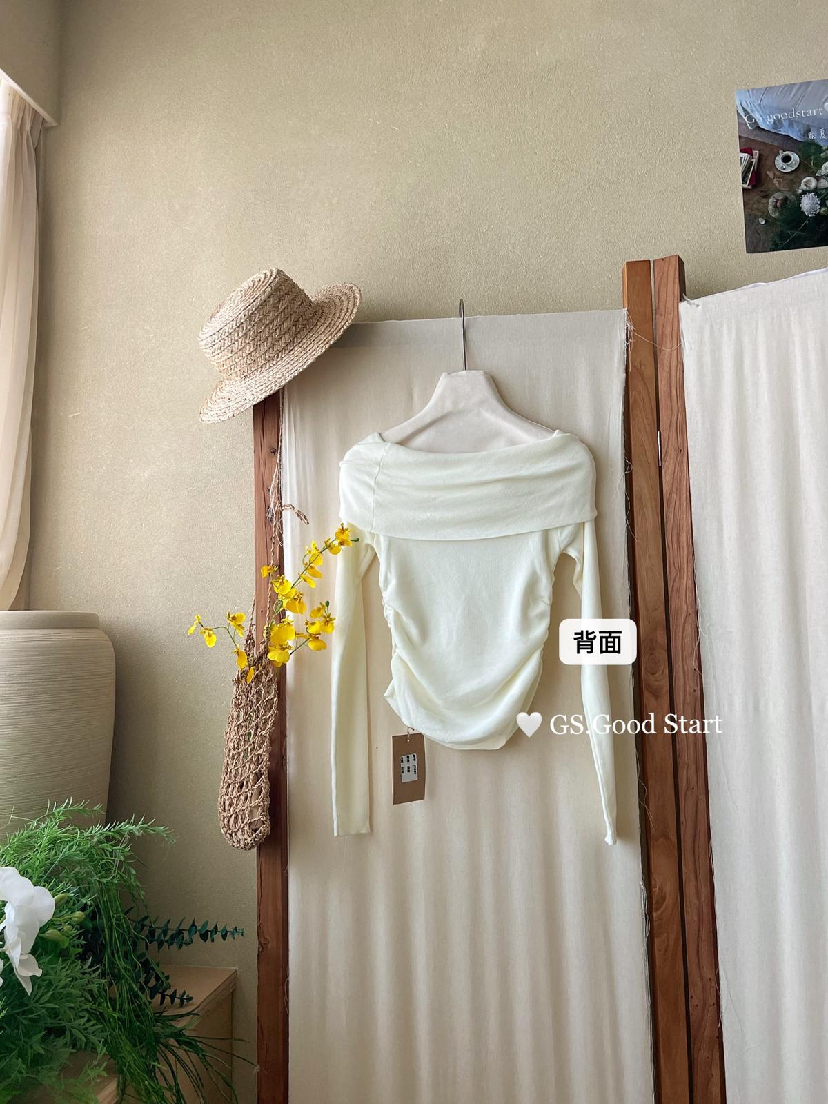 【C8659】時裝感很強——韓女標配不對稱交叉領露肩小衫