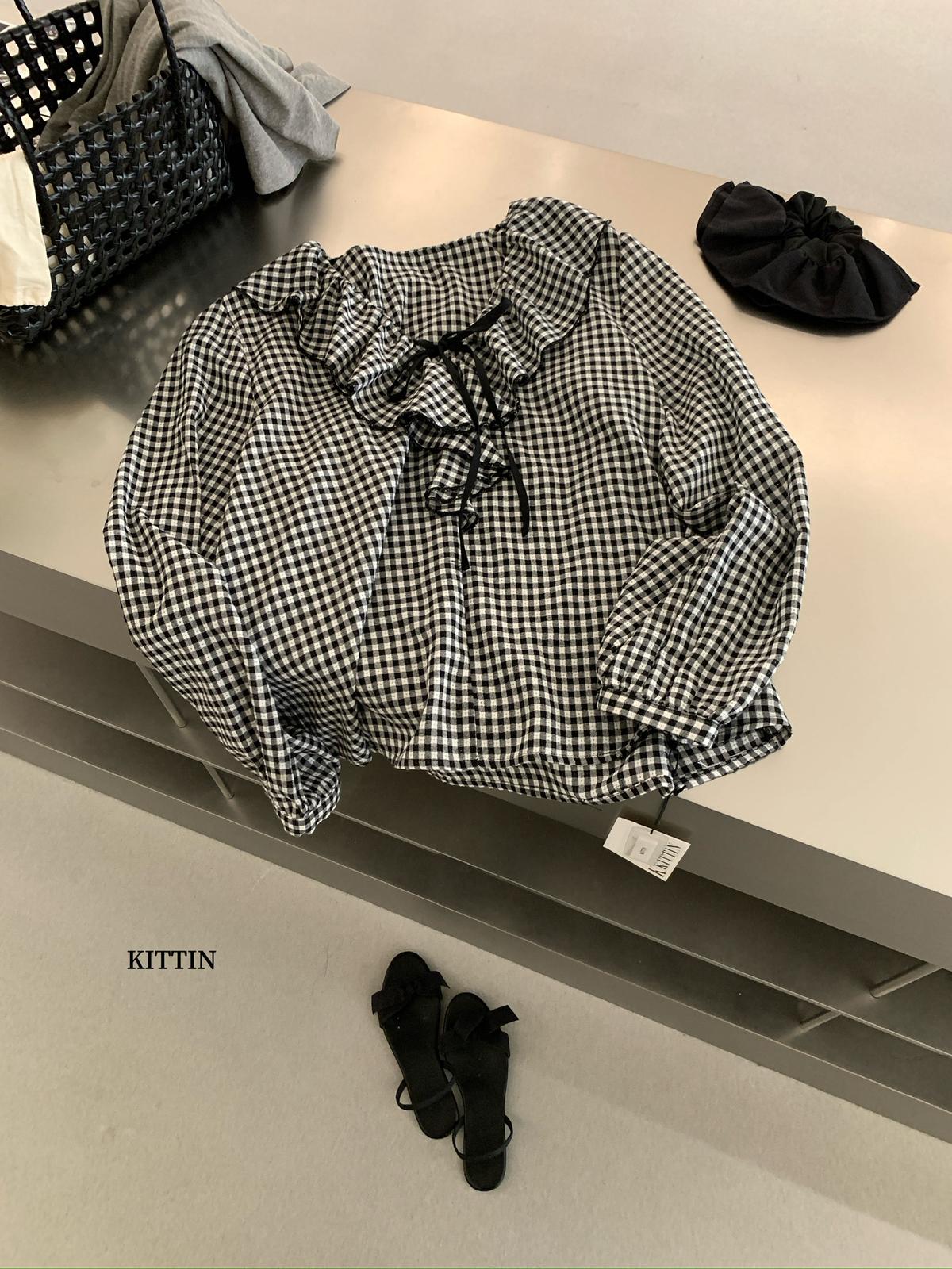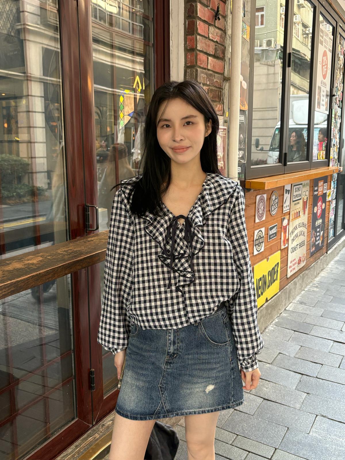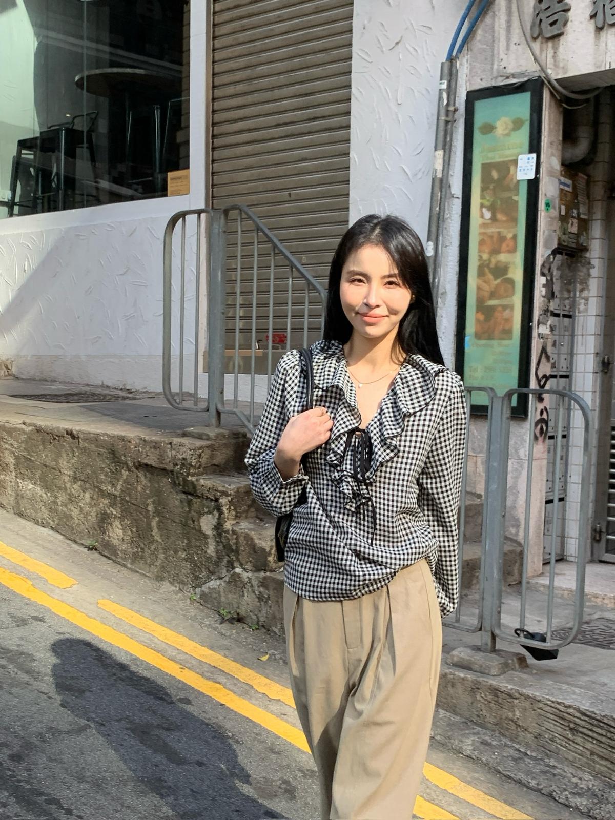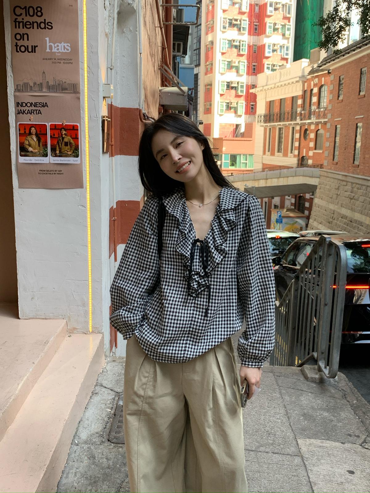 【C8681】法式復古荷葉領精緻細格紋小衫