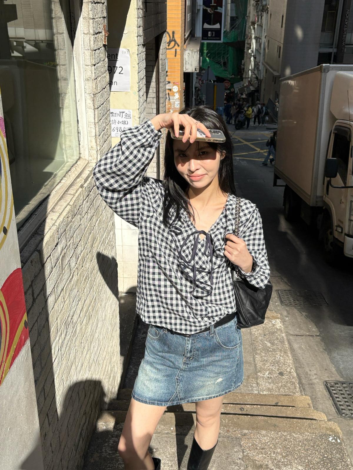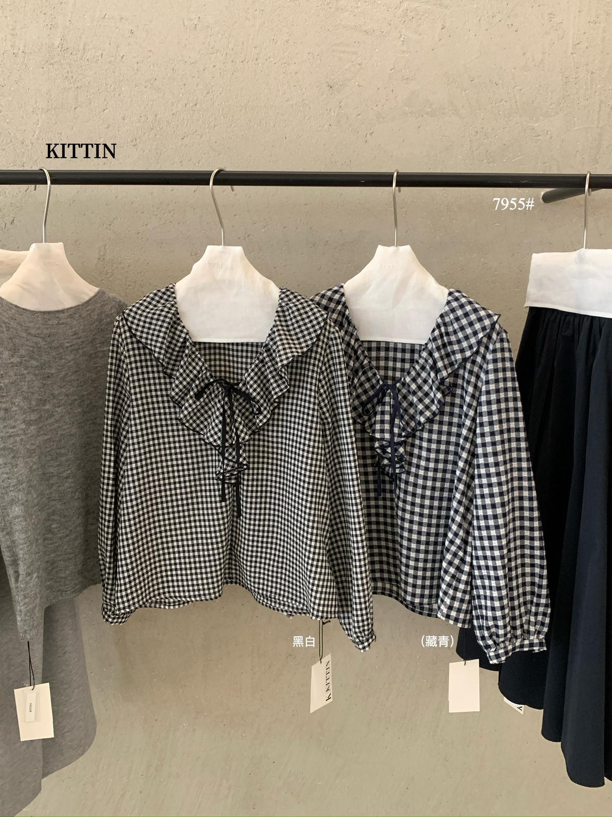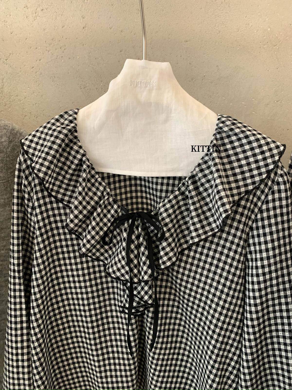 【C8681】法式復古荷葉領精緻細格紋小衫