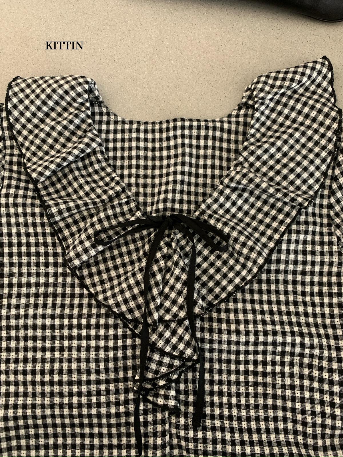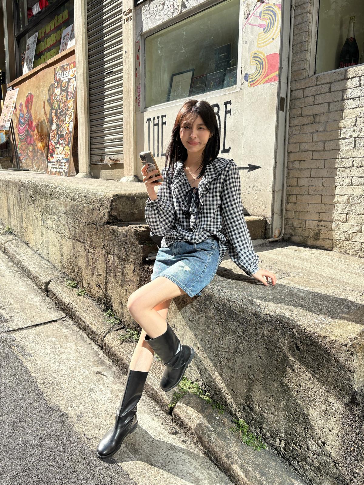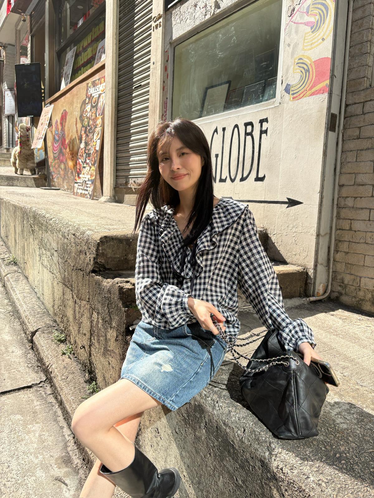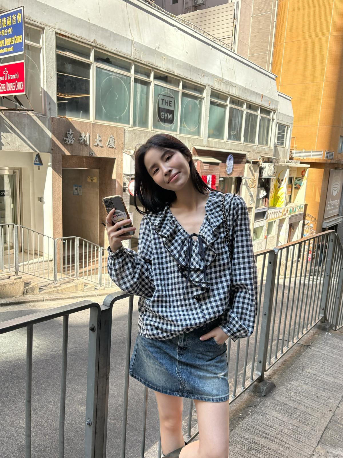 【C8681】法式復古荷葉領精緻細格紋小衫
