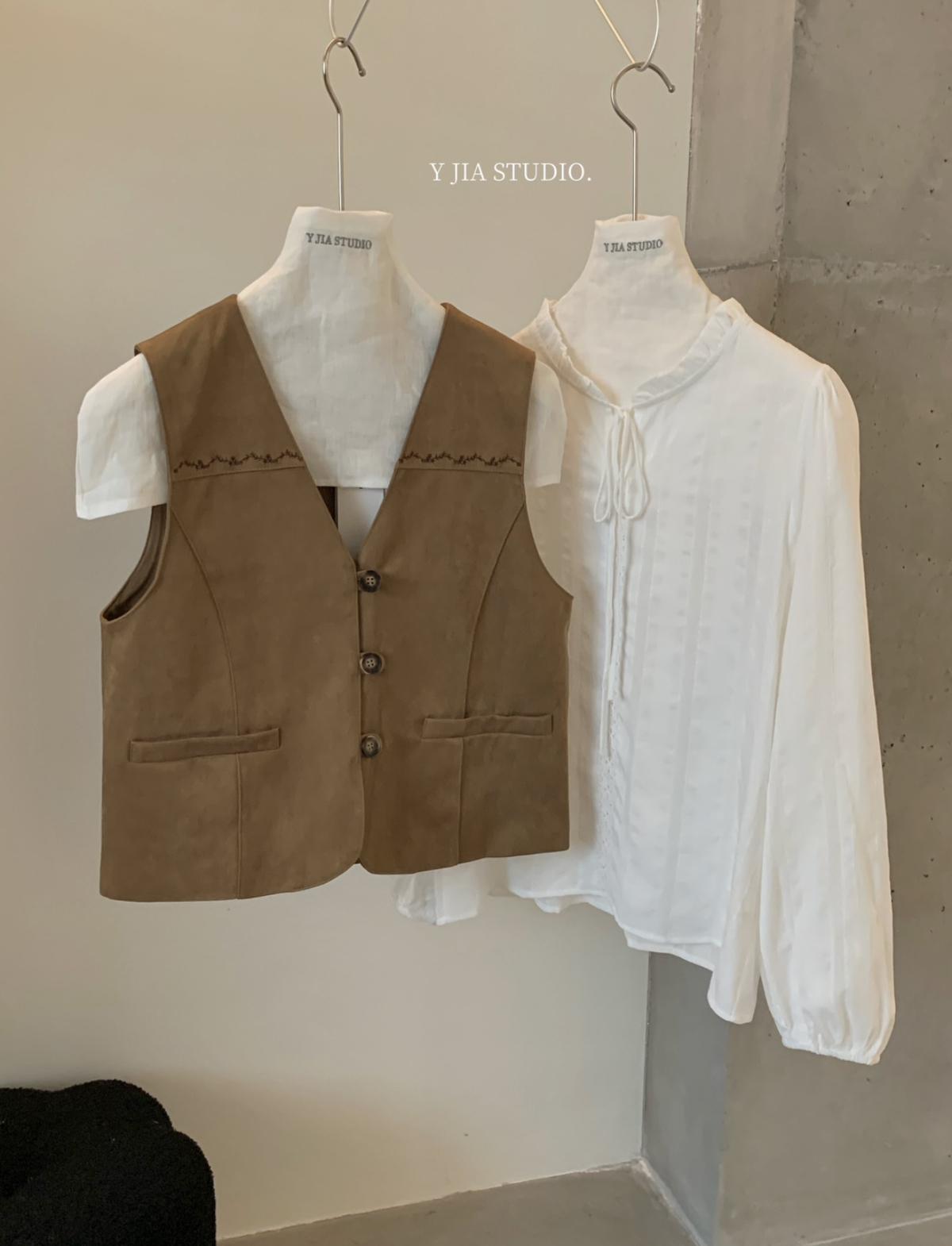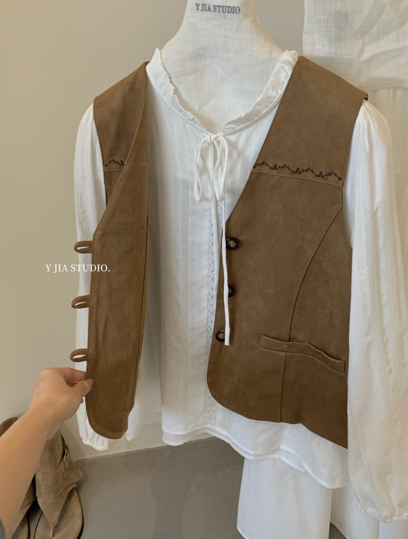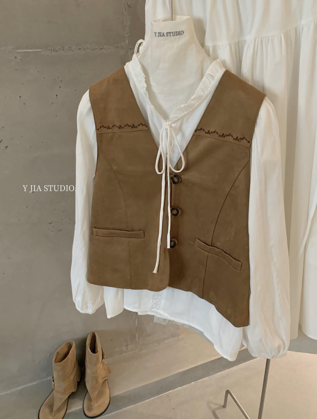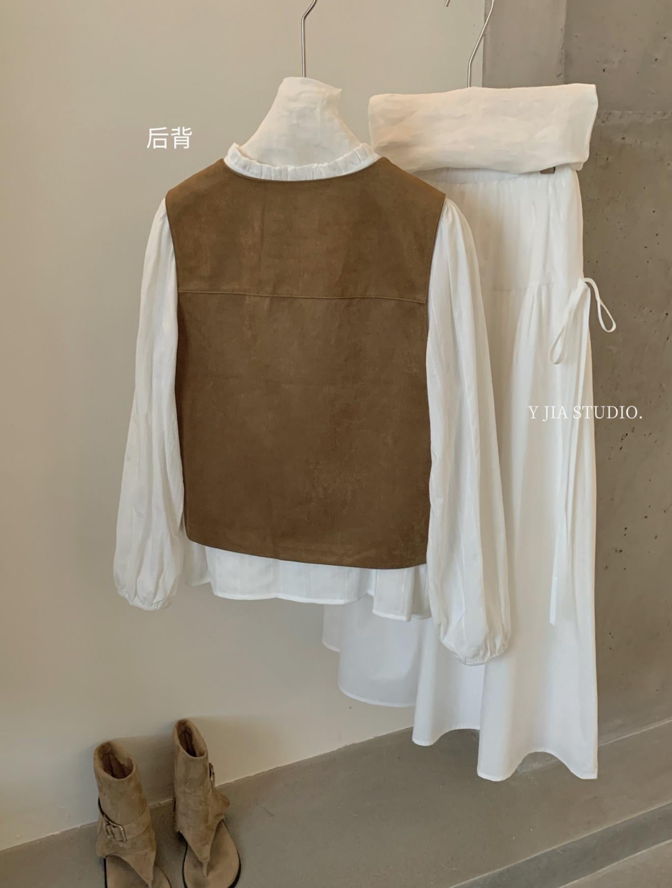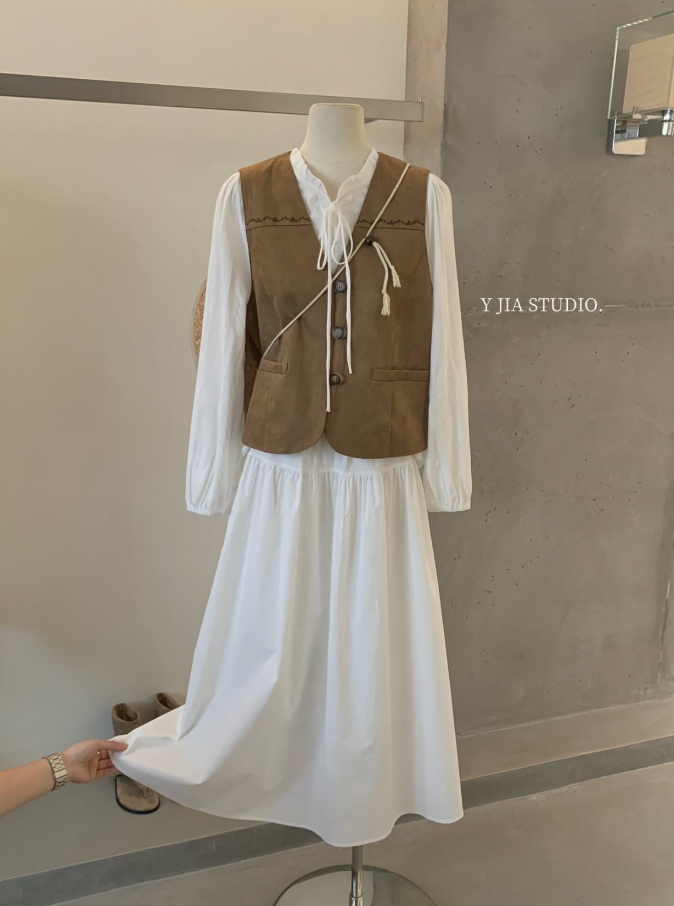 【C8684】重工麂皮絨刺繡馬甲+溫柔襯衣+半身裙3件套套裝