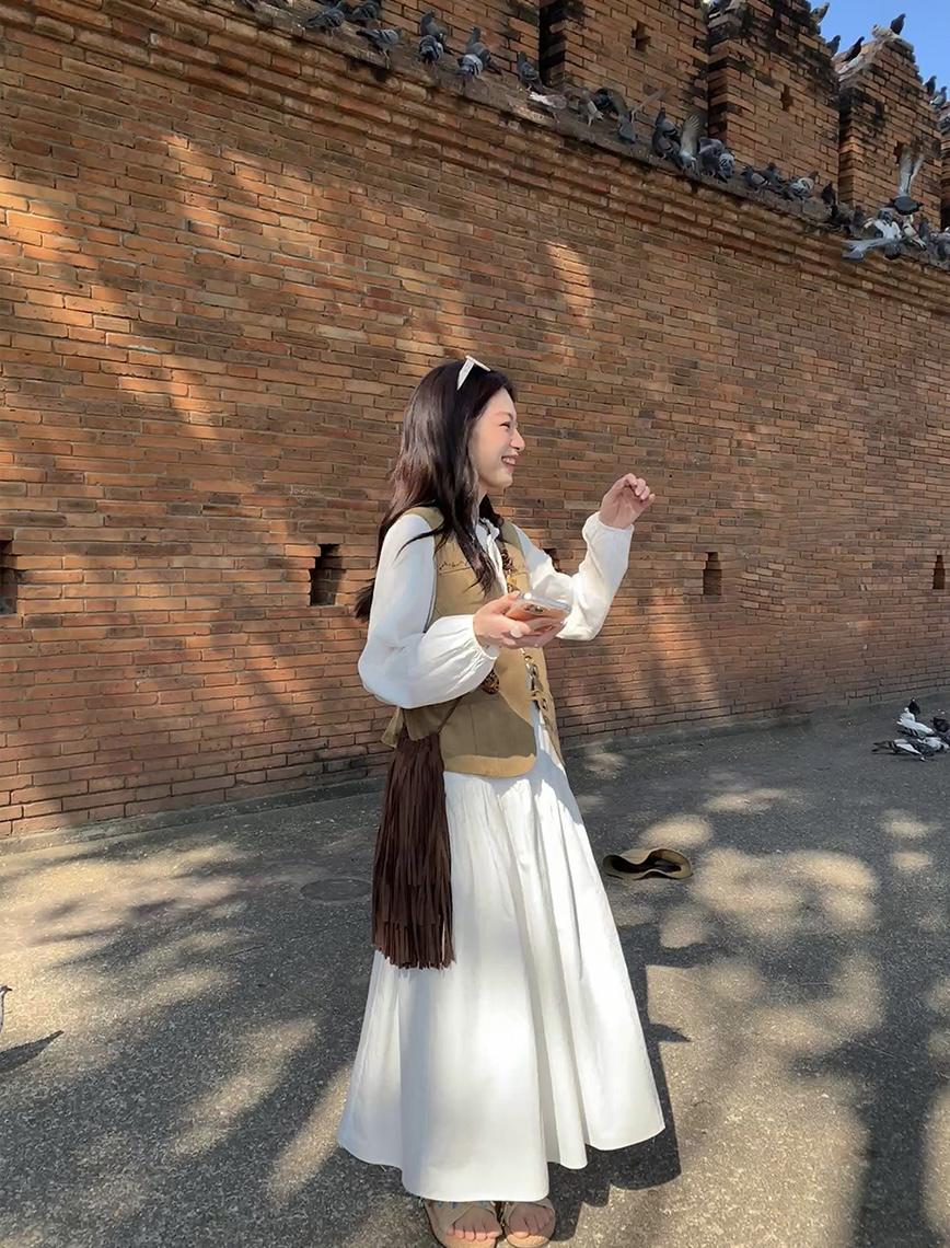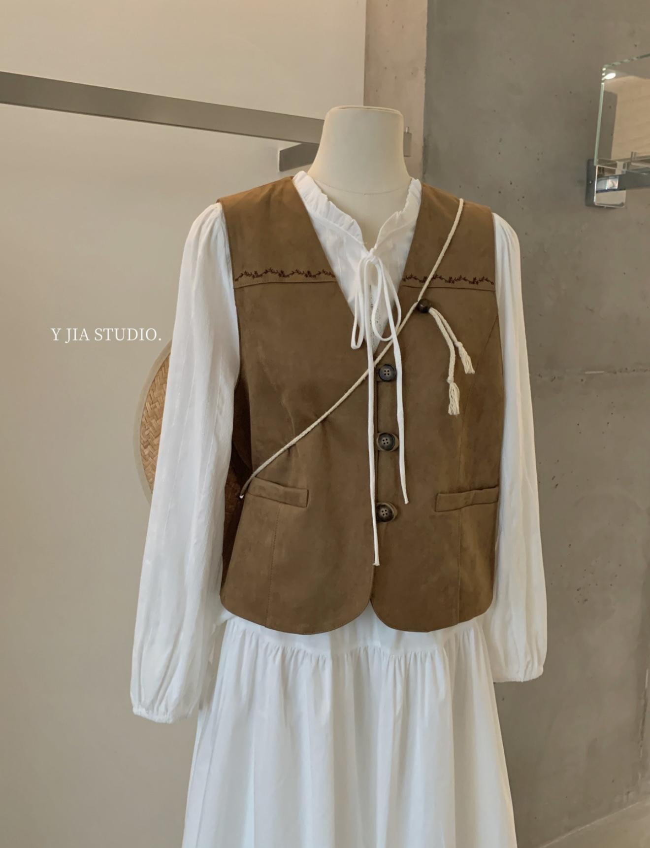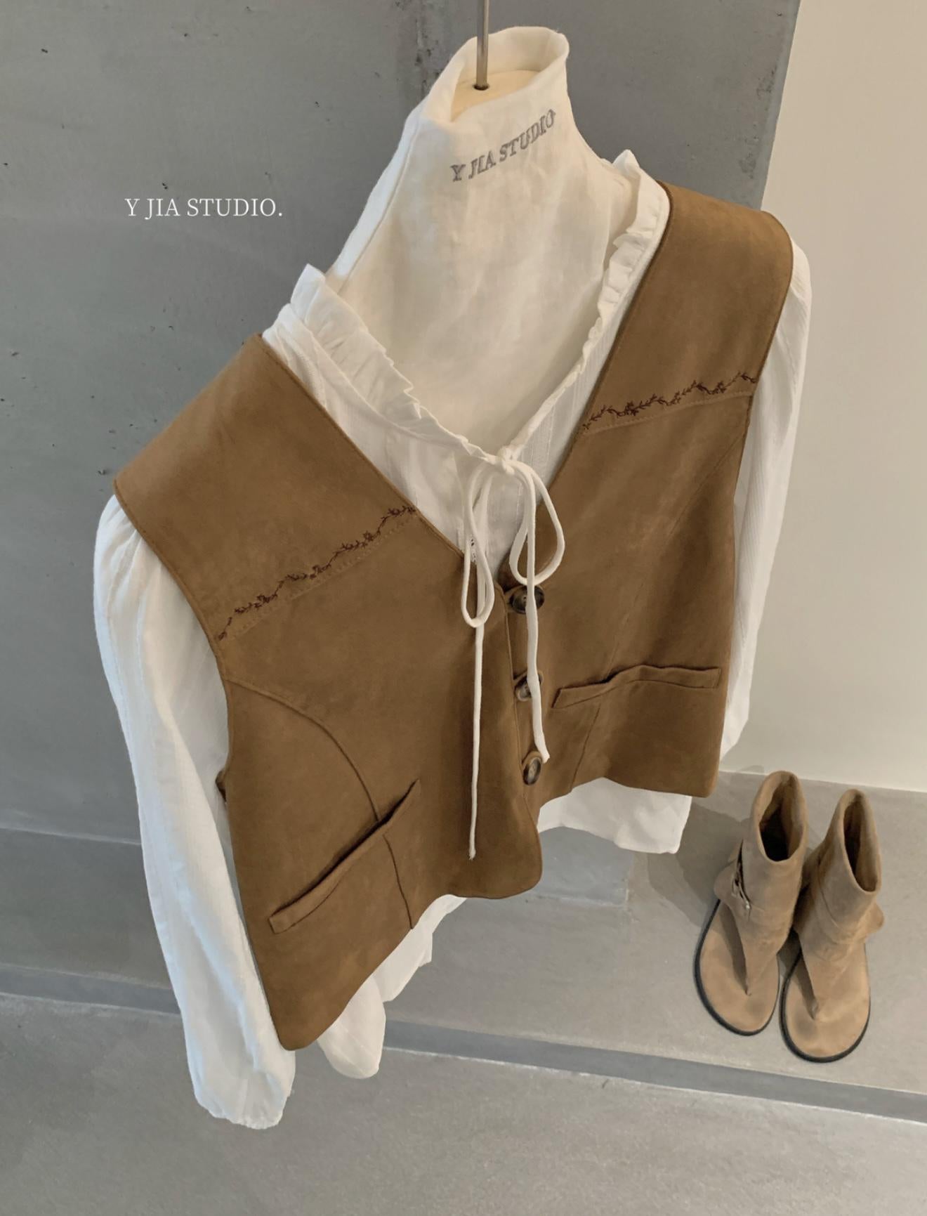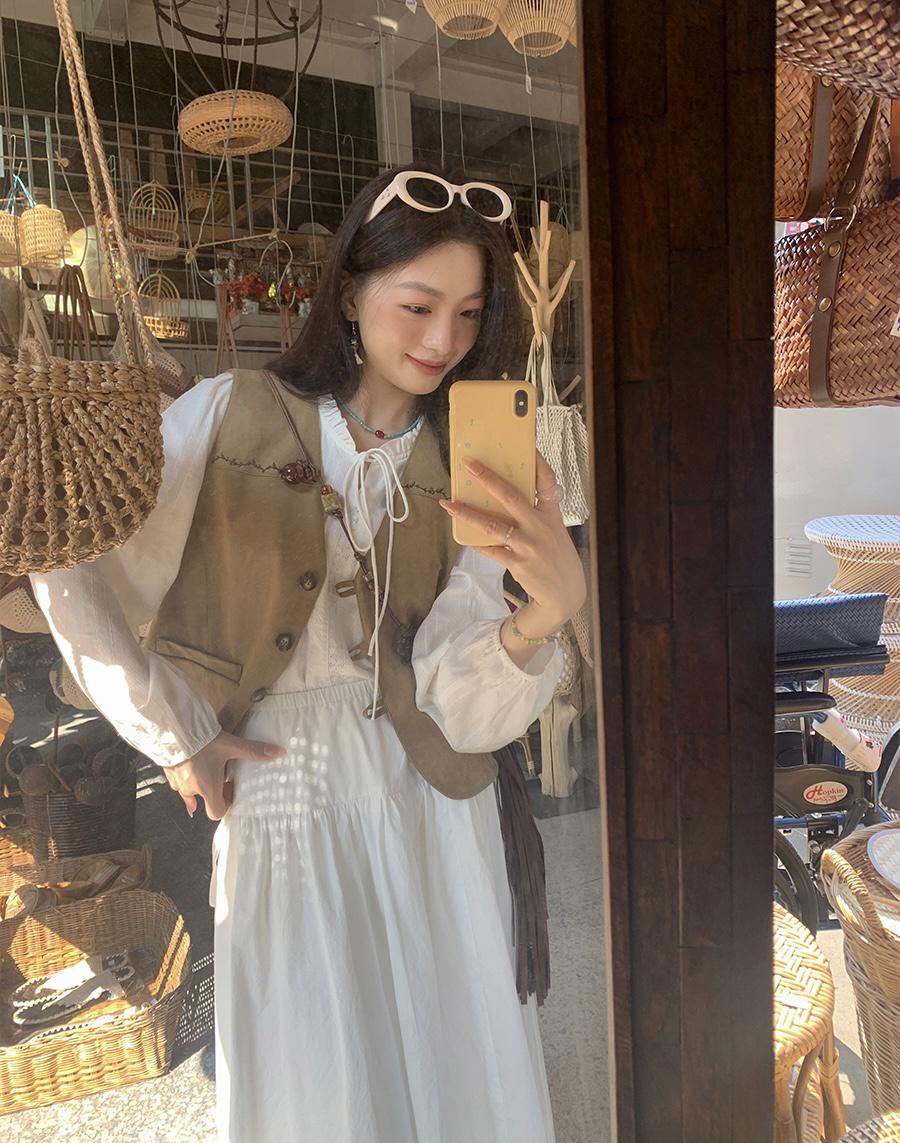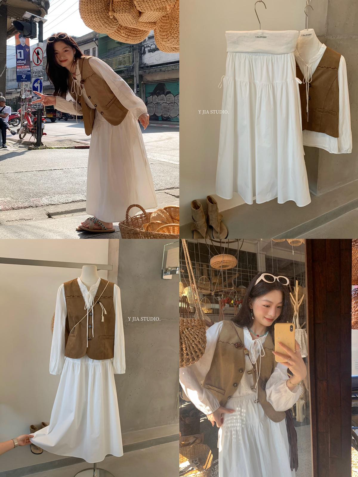 【C8684】重工麂皮絨刺繡馬甲+溫柔襯衣+半身裙3件套套裝