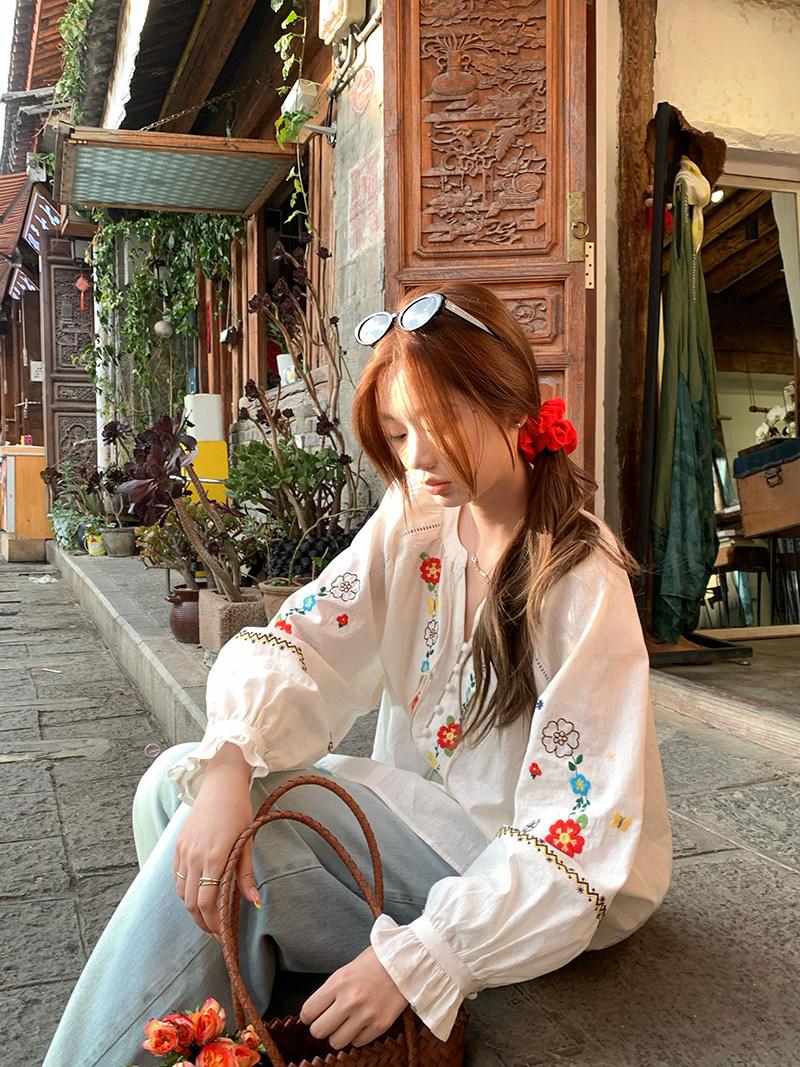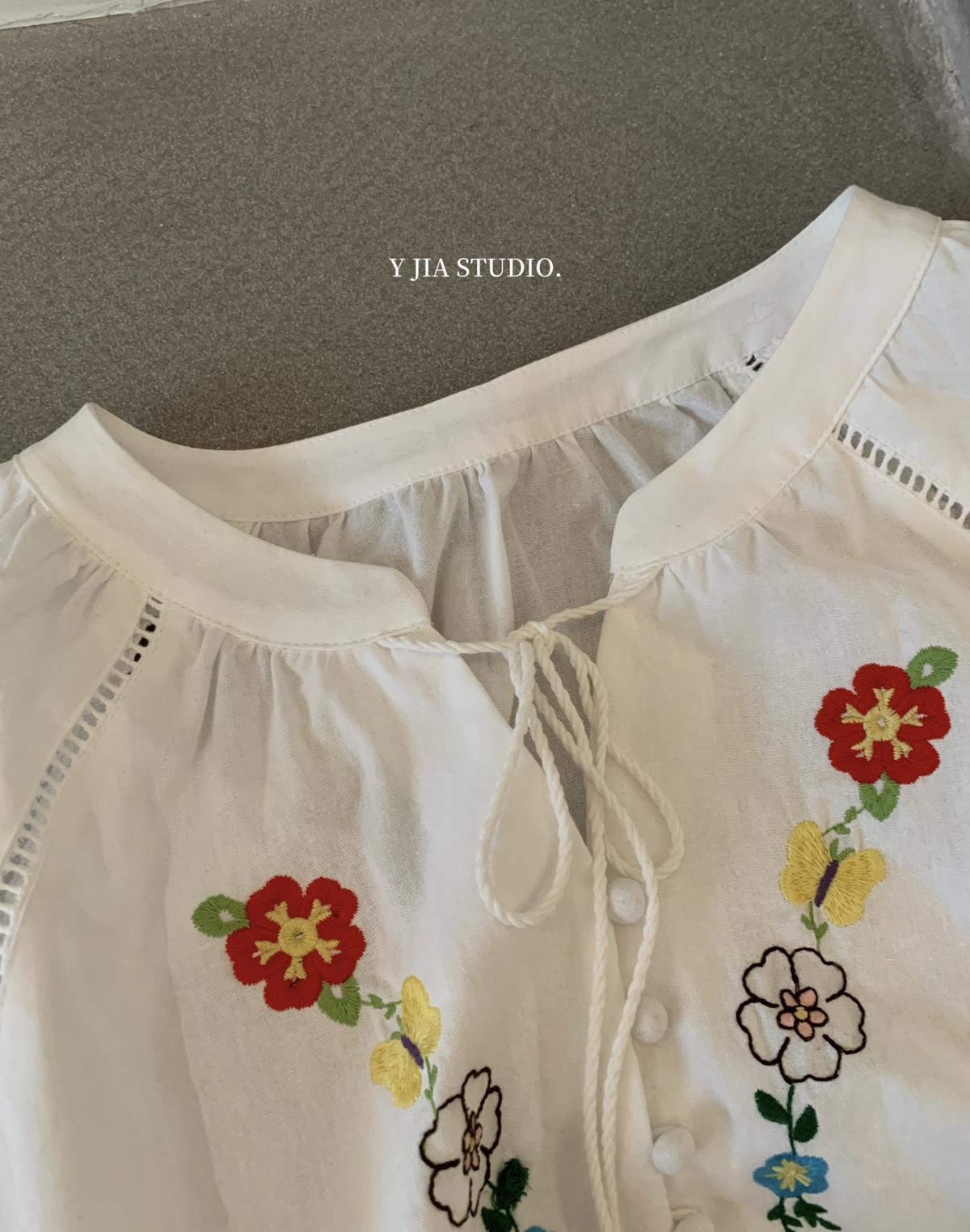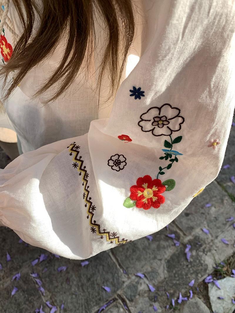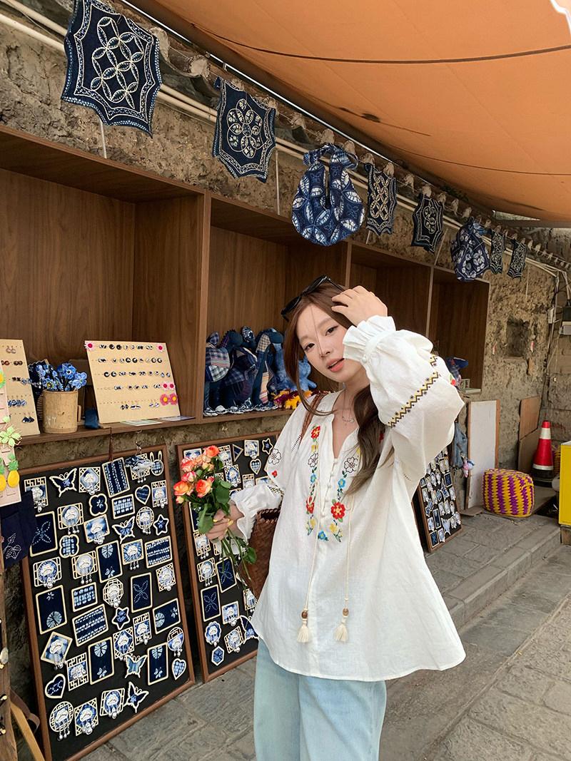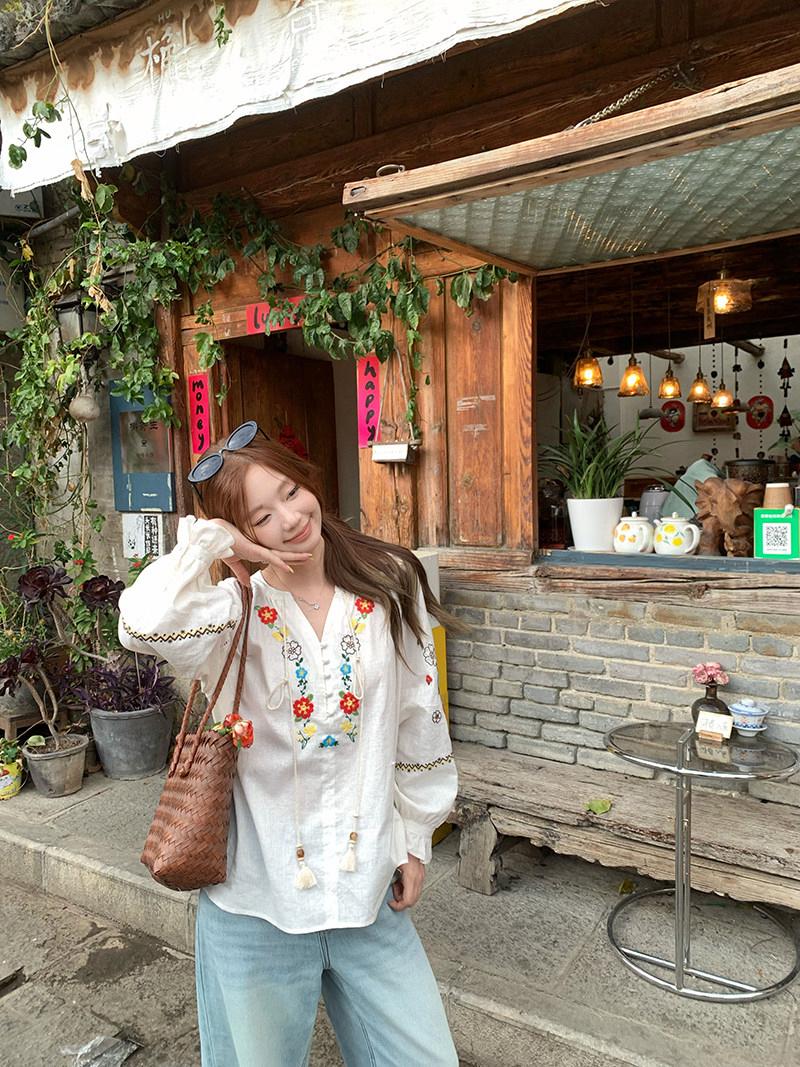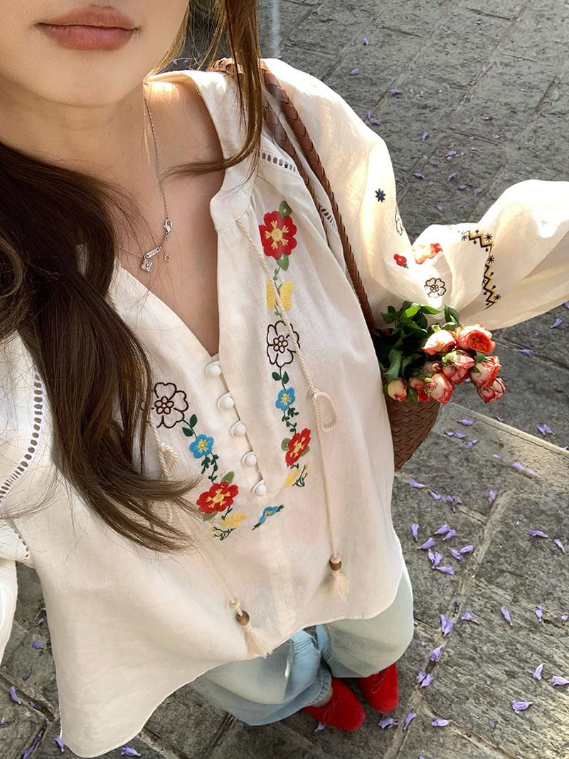 【C8683】V領重工花朵刺繡亞麻娃娃衫小衫
