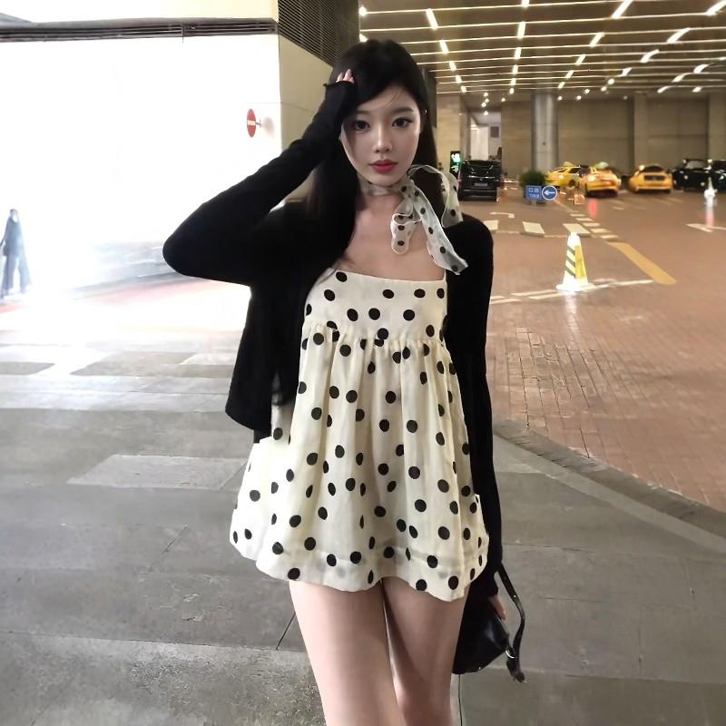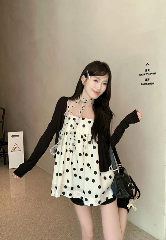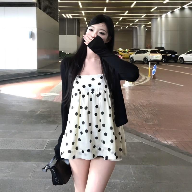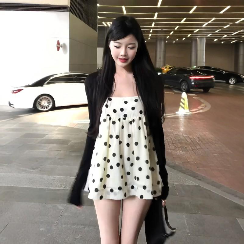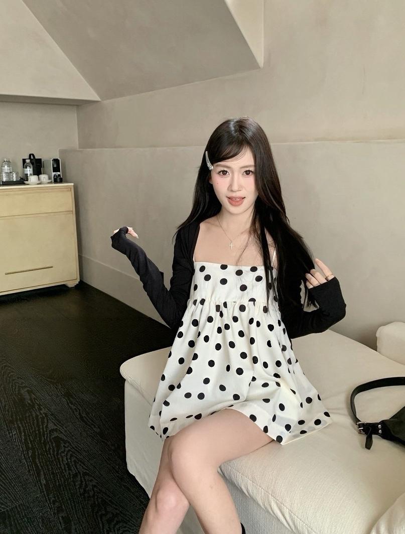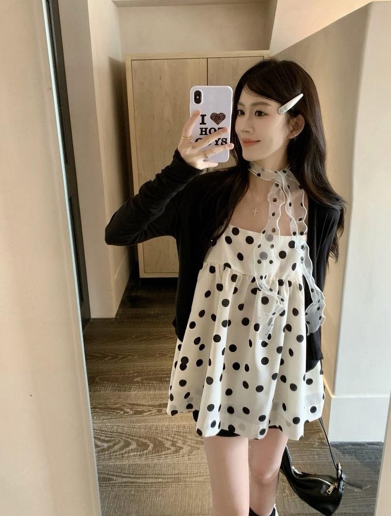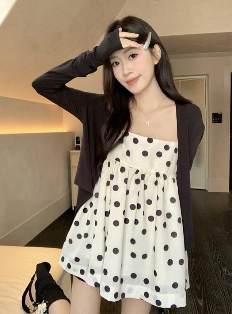 【C8687】黑糖波波純欲少女感波點吊帶裙連衣裙+薄款針織開衫套裝
