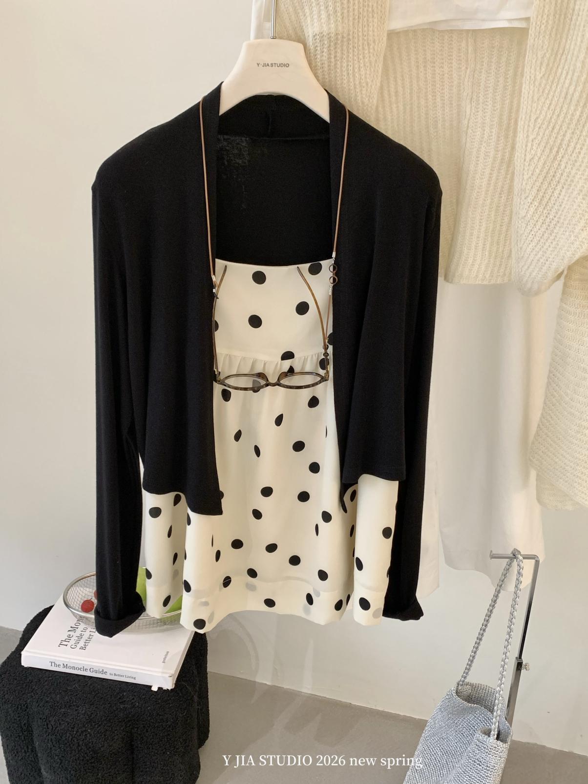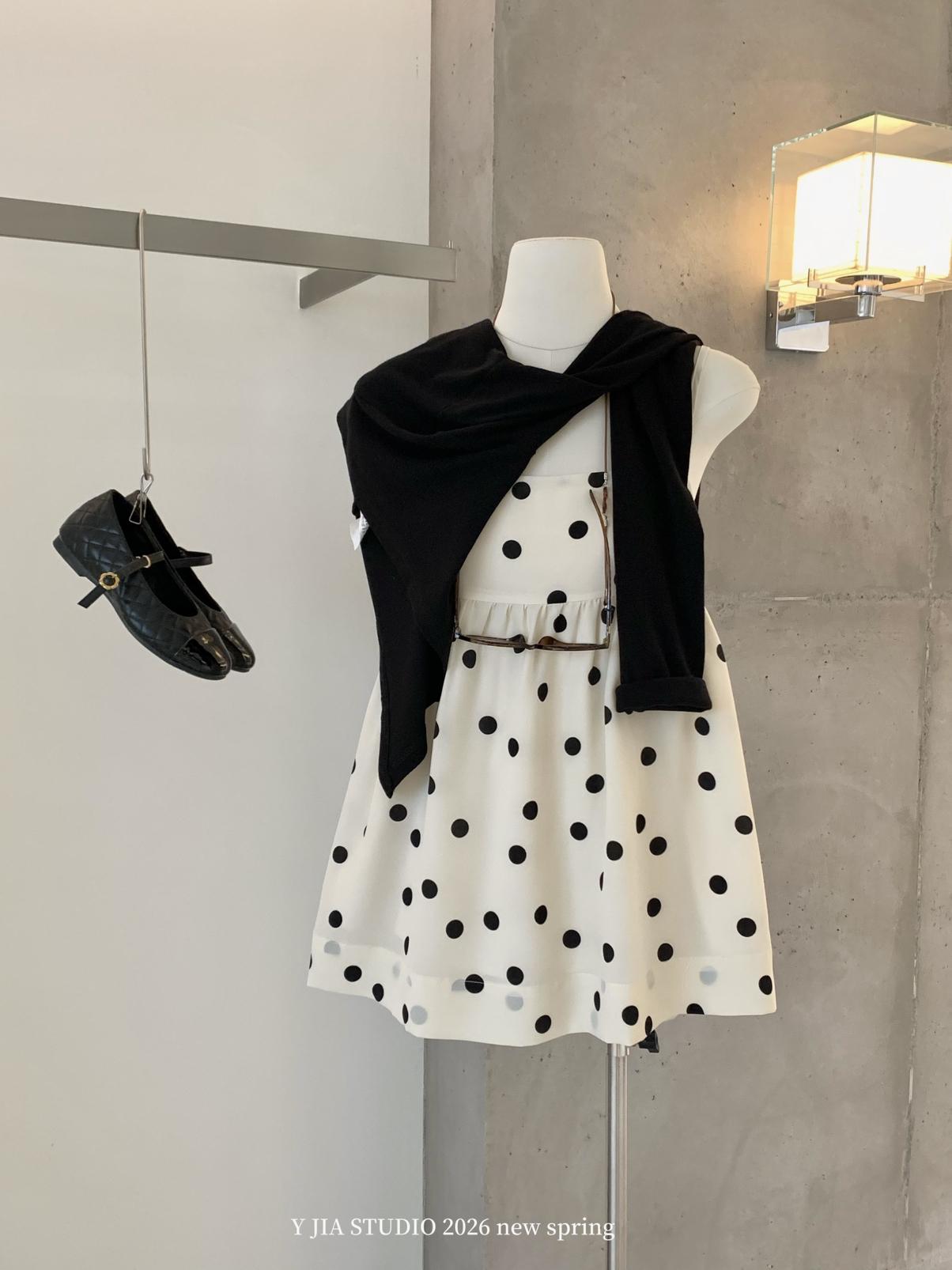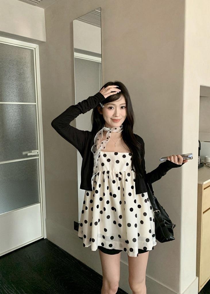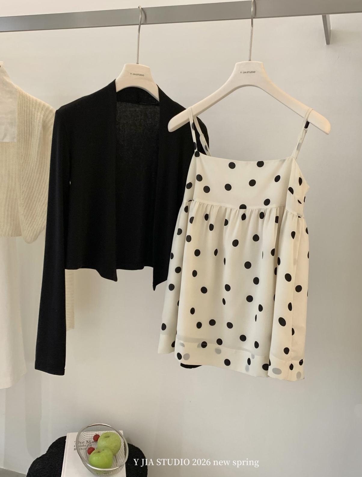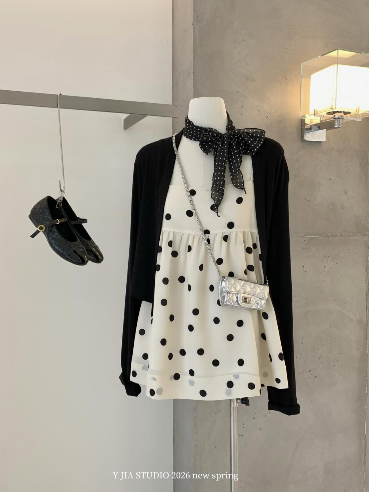 【C8687】黑糖波波純欲少女感波點吊帶裙連衣裙+薄款針織開衫套裝