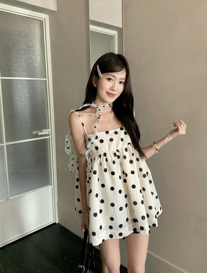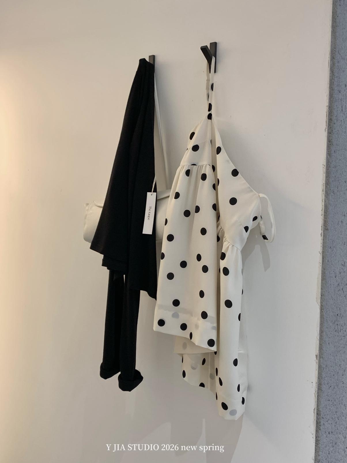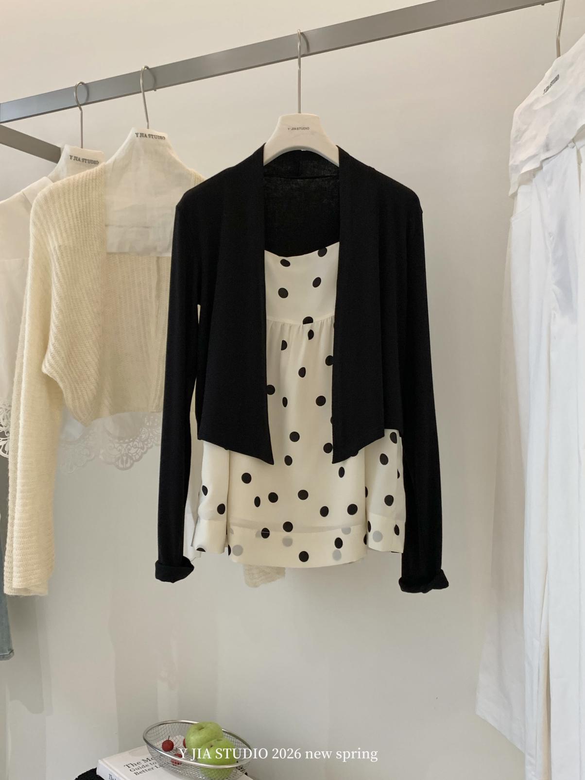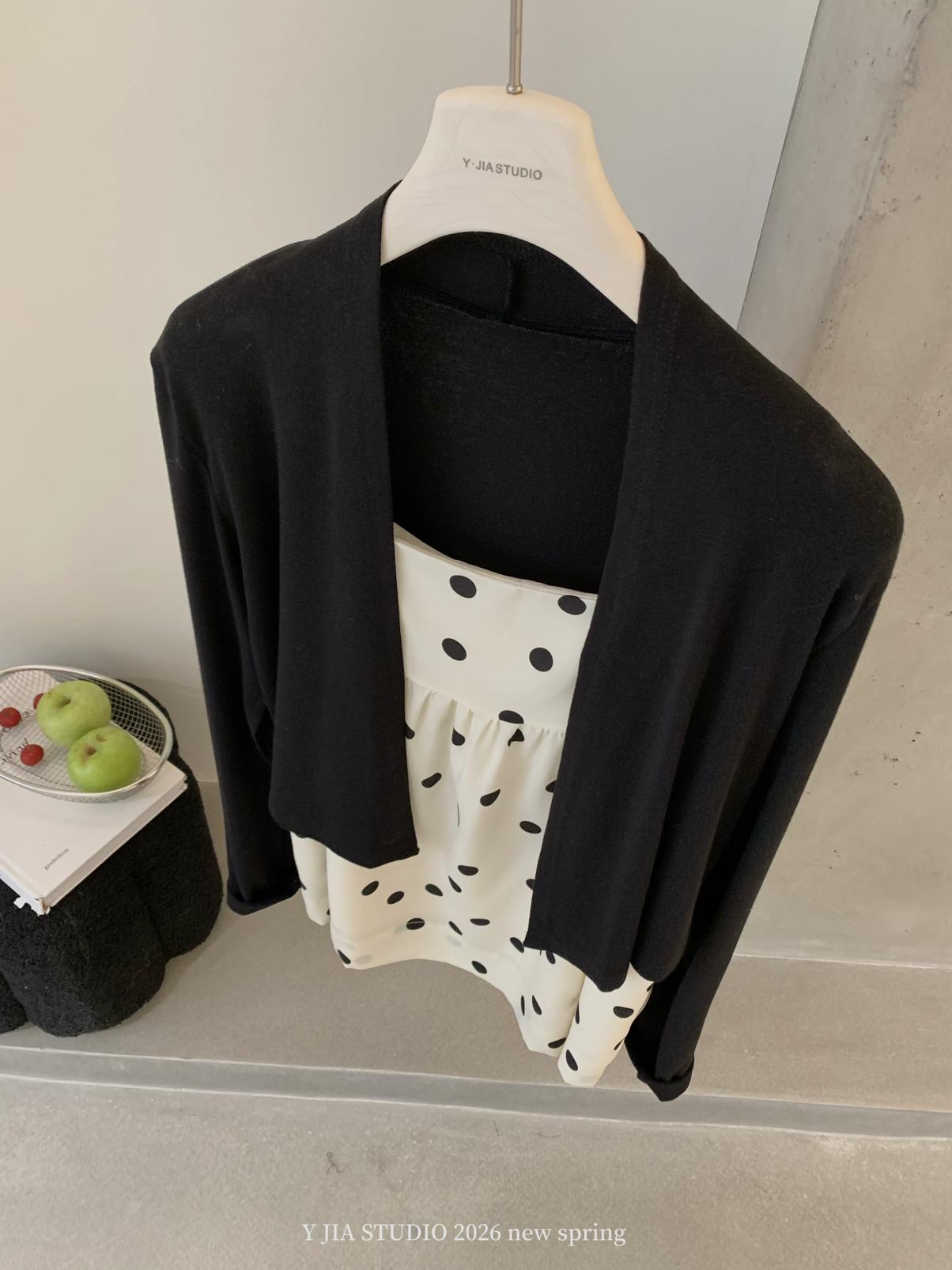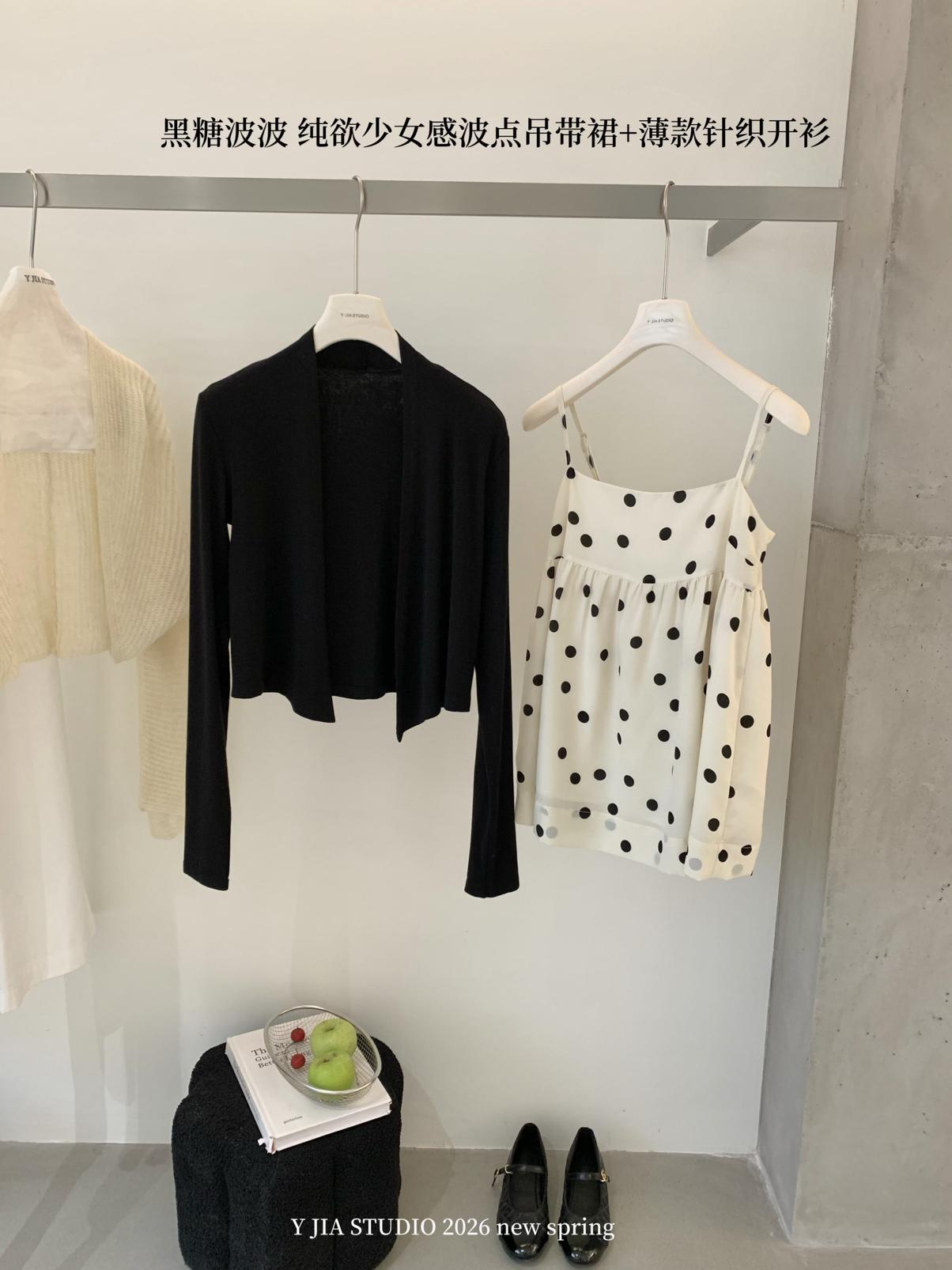 【C8687】黑糖波波純欲少女感波點吊帶裙連衣裙+薄款針織開衫套裝