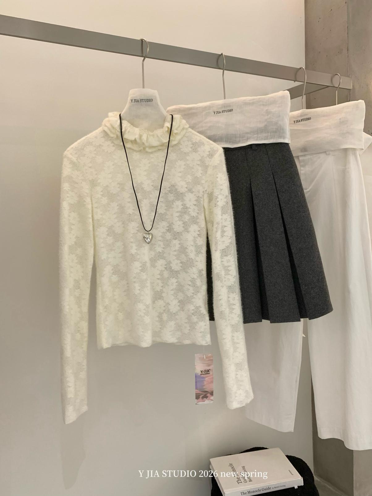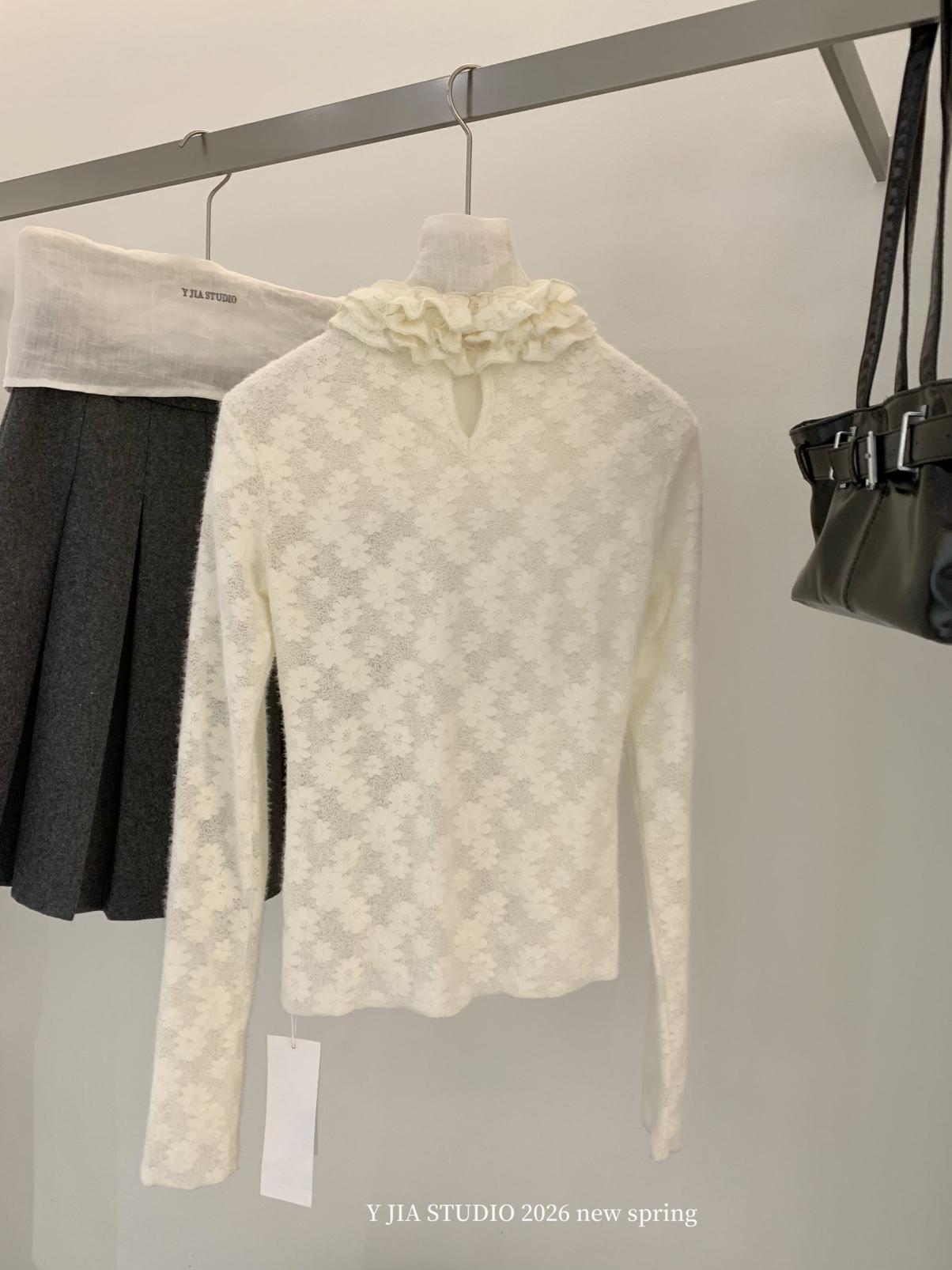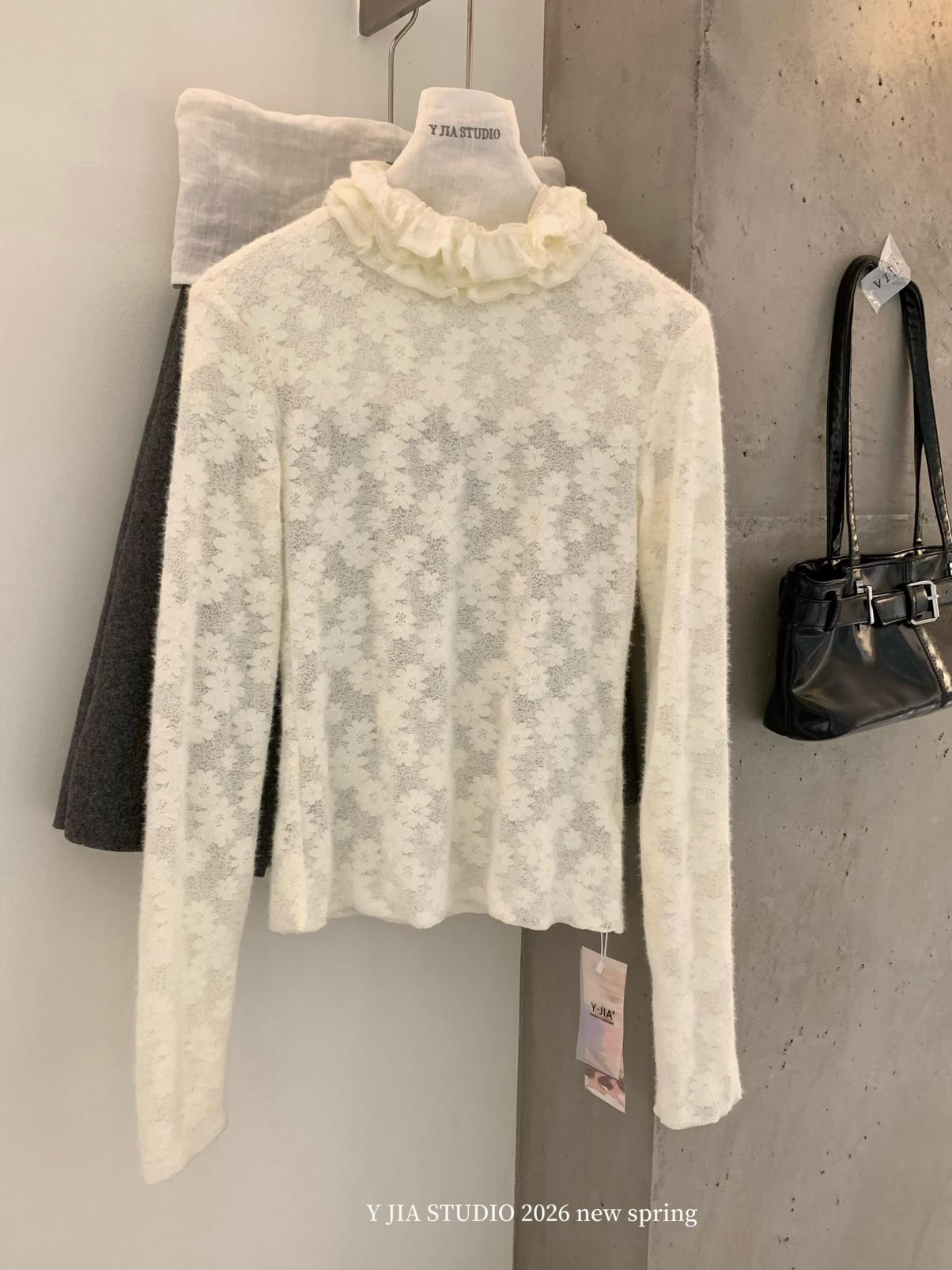 【C8689】少女情懷~雛菊蕾絲高領波浪設計內搭打底衫小衫