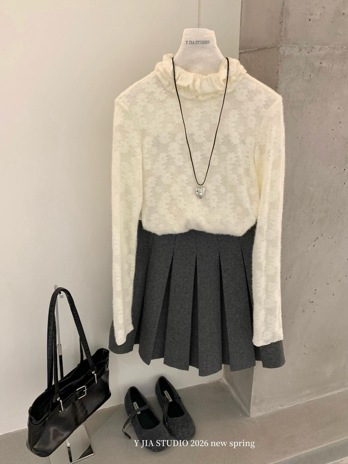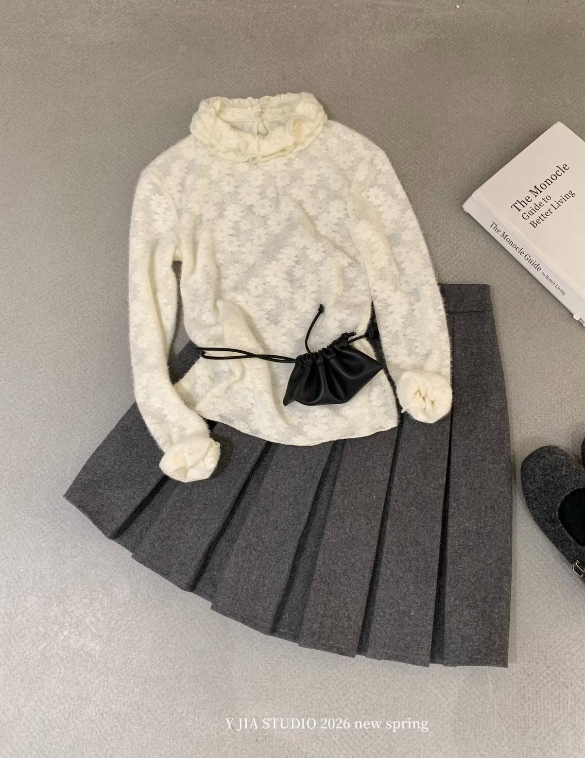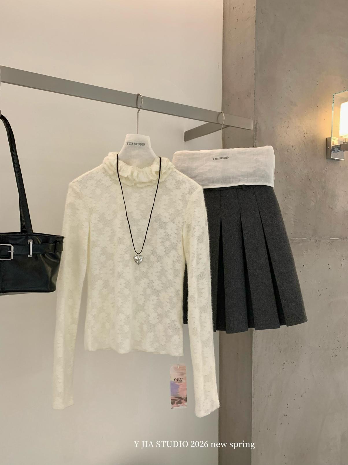 【C8689】少女情懷~雛菊蕾絲高領波浪設計內搭打底衫小衫