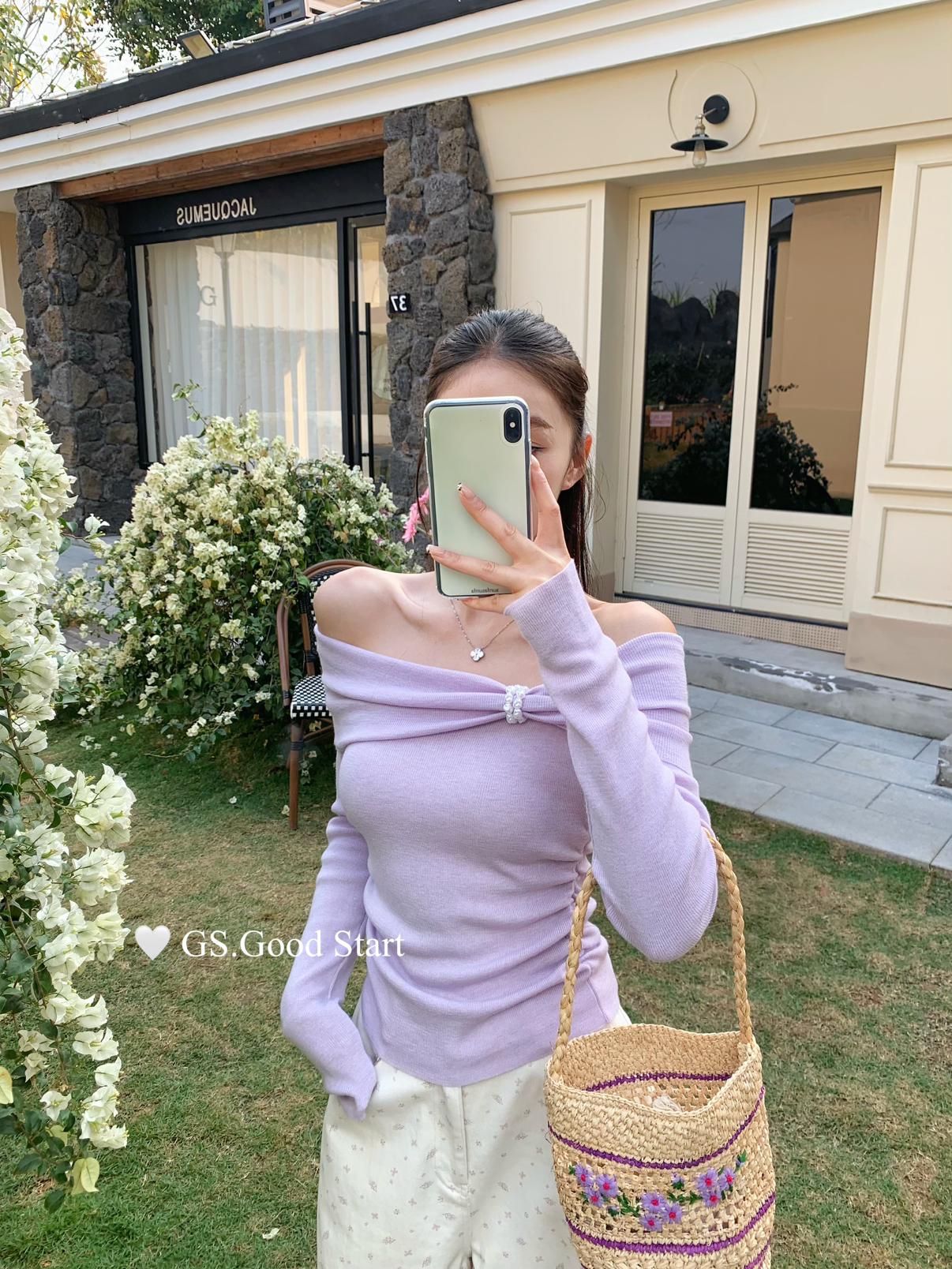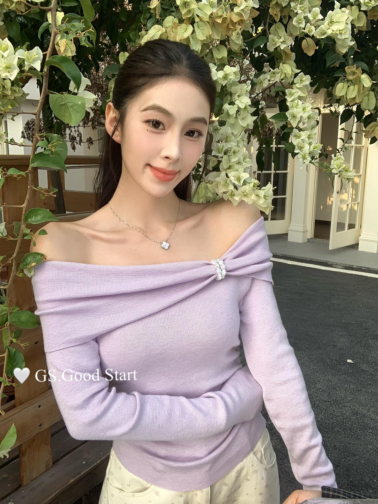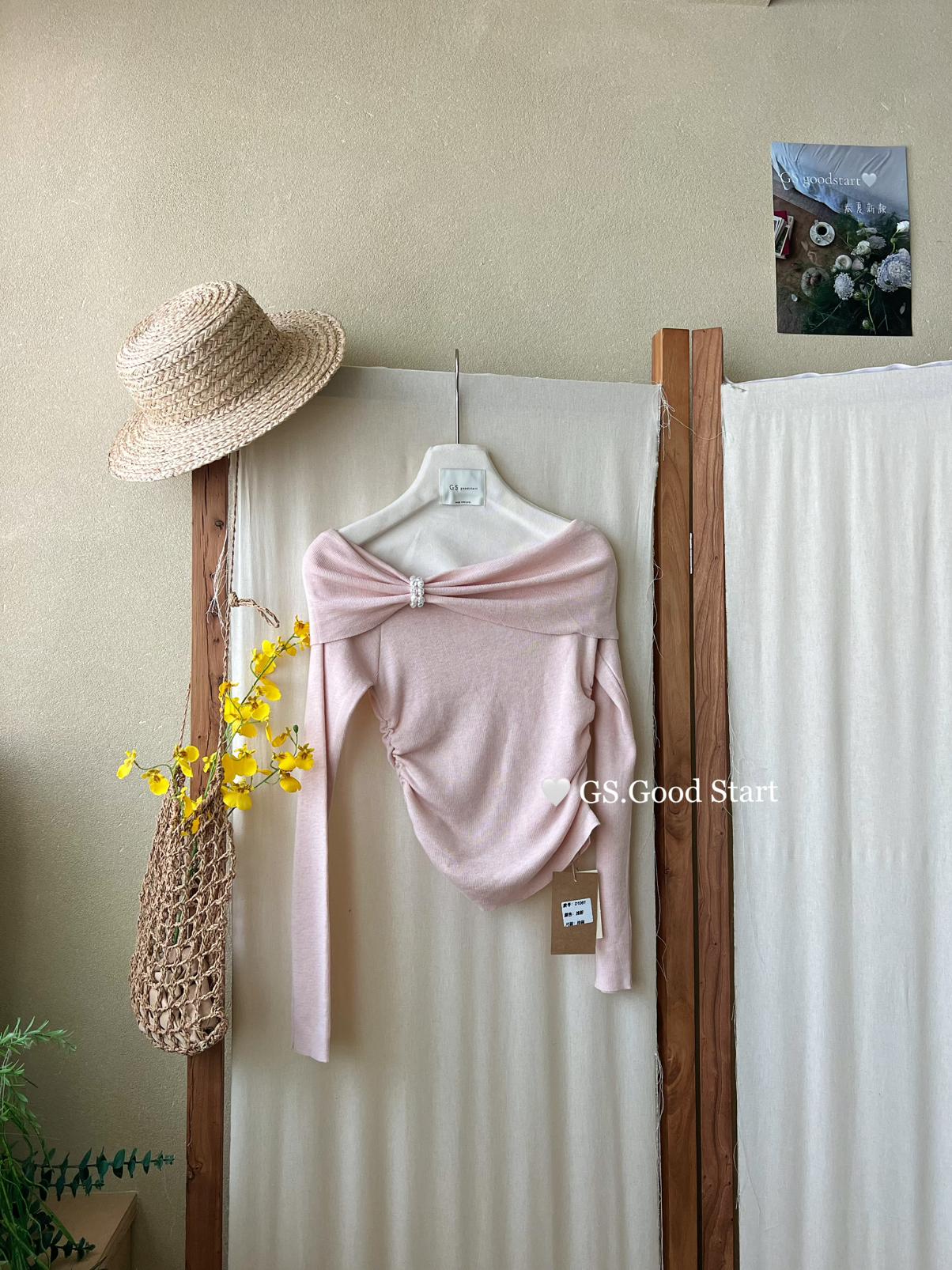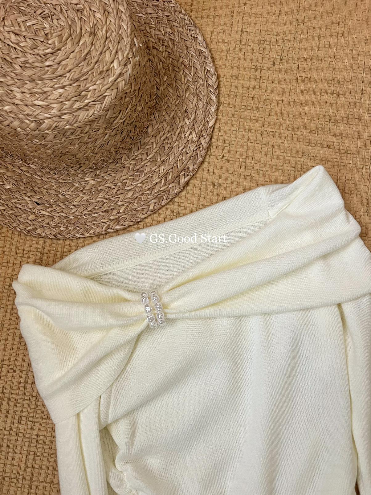 【C8691】‘珍珠少女’浪漫的季節~熱賣不停!春季氣質溫柔一字肩修身針織衫