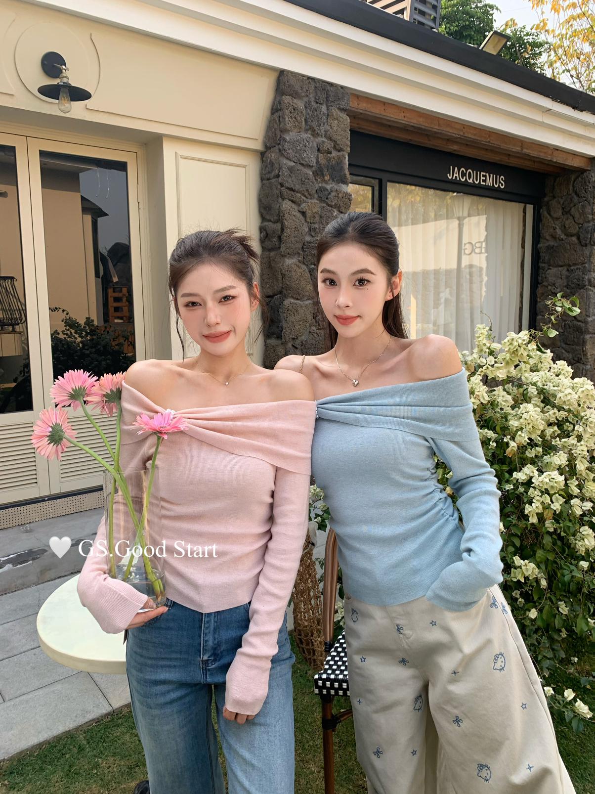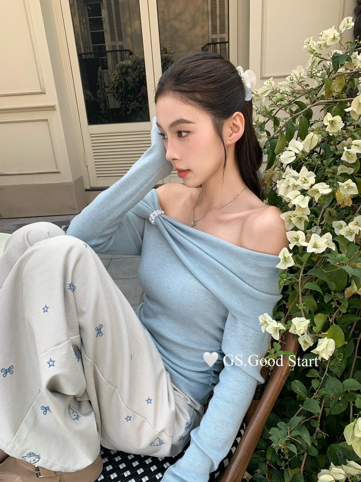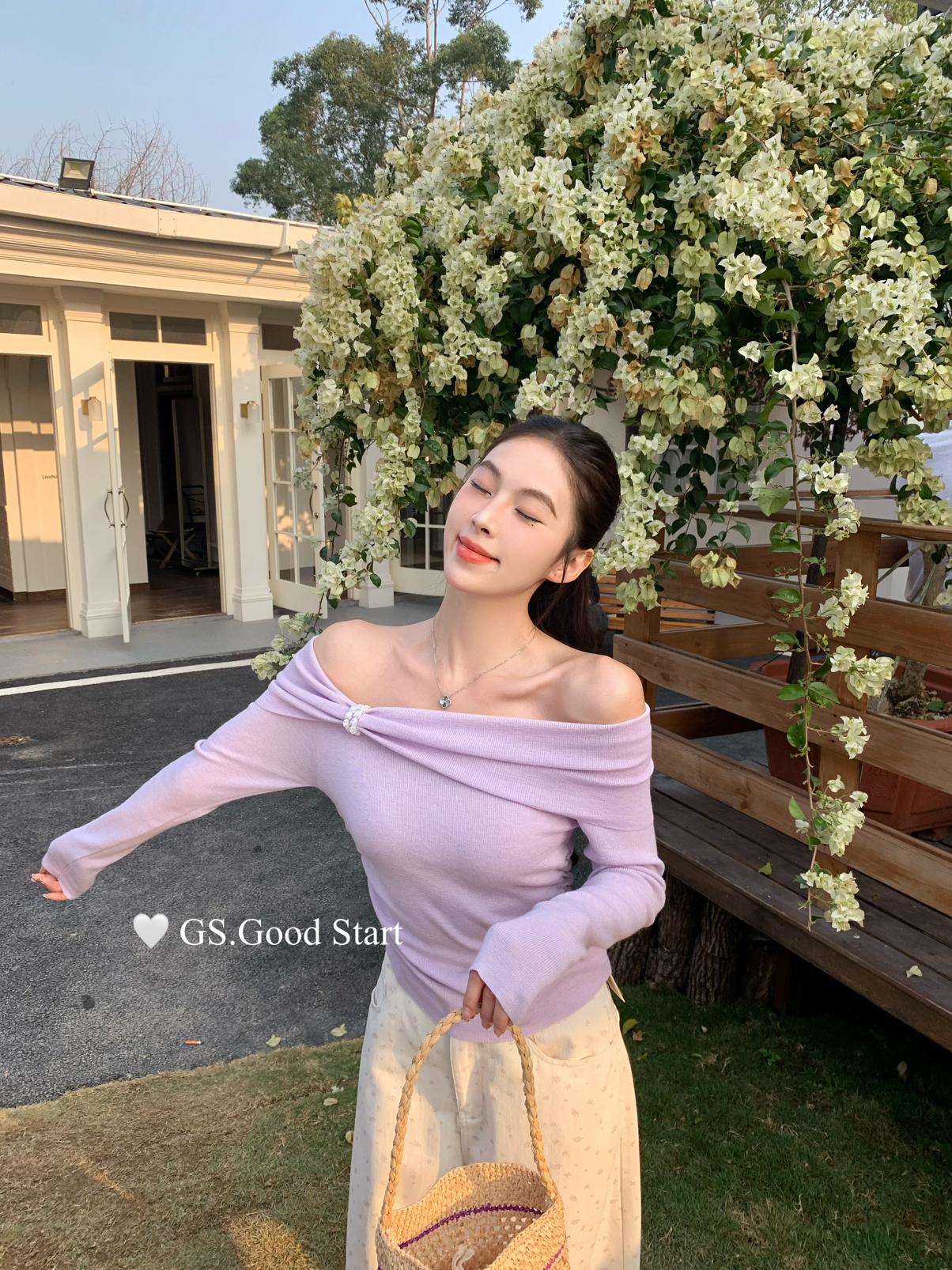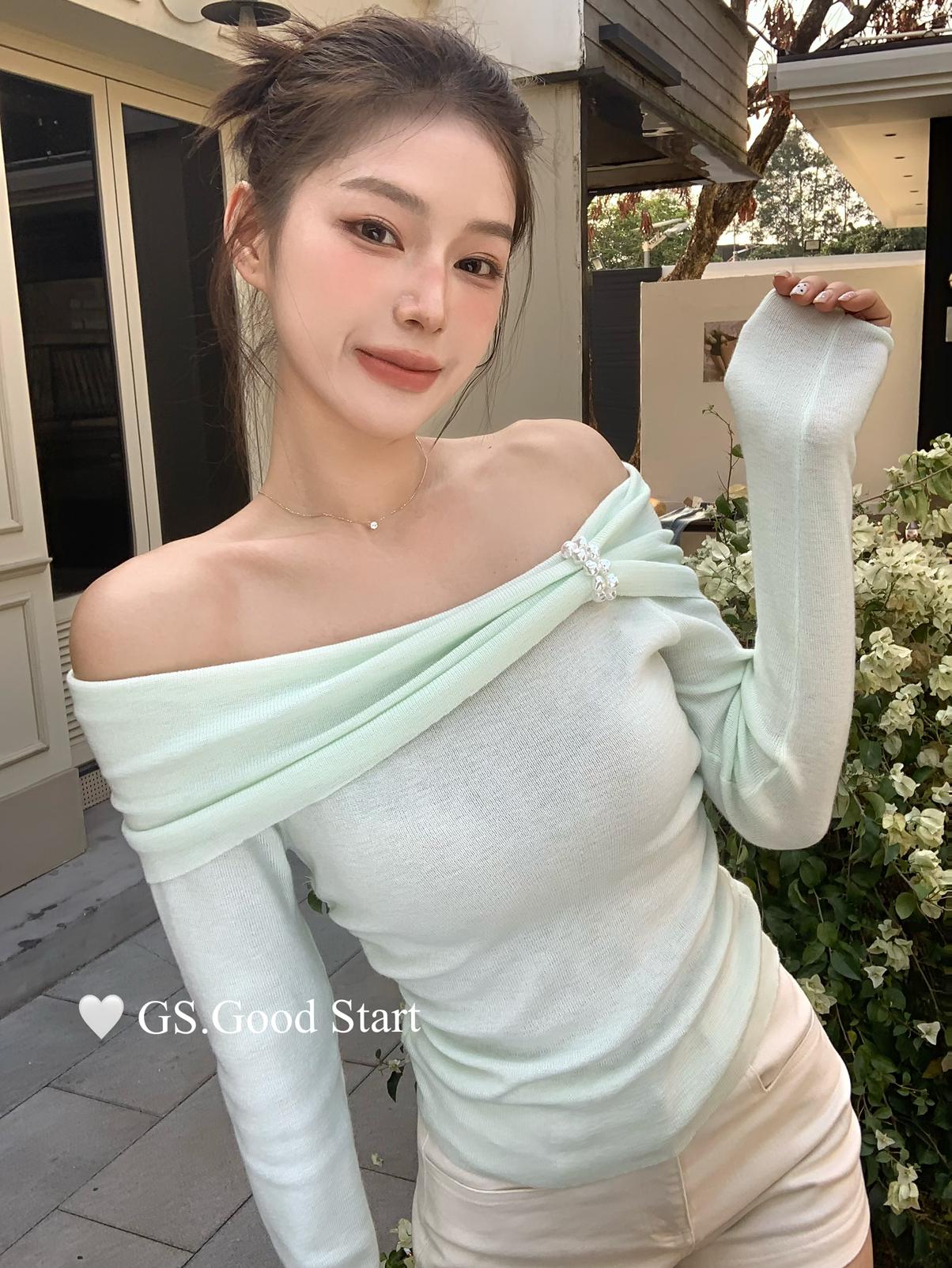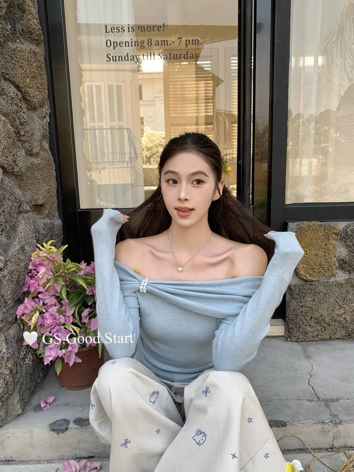 【C8691】‘珍珠少女’浪漫的季節~熱賣不停!春季氣質溫柔一字肩修身針織衫