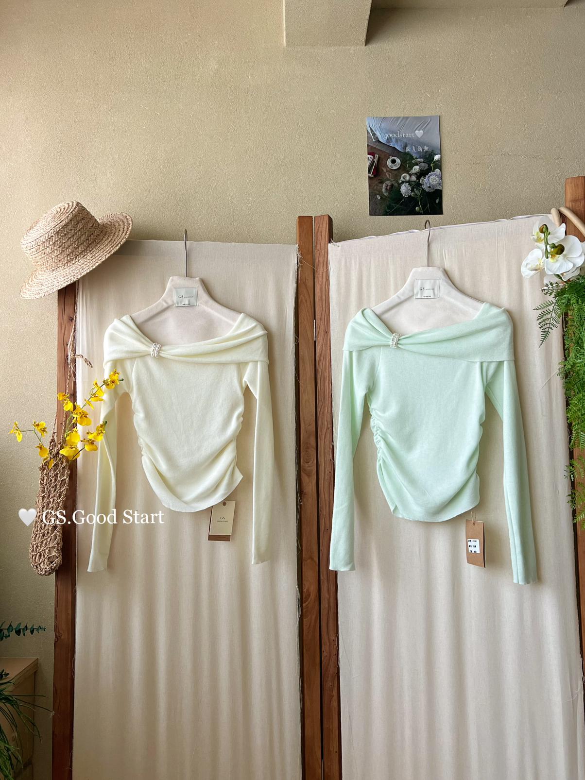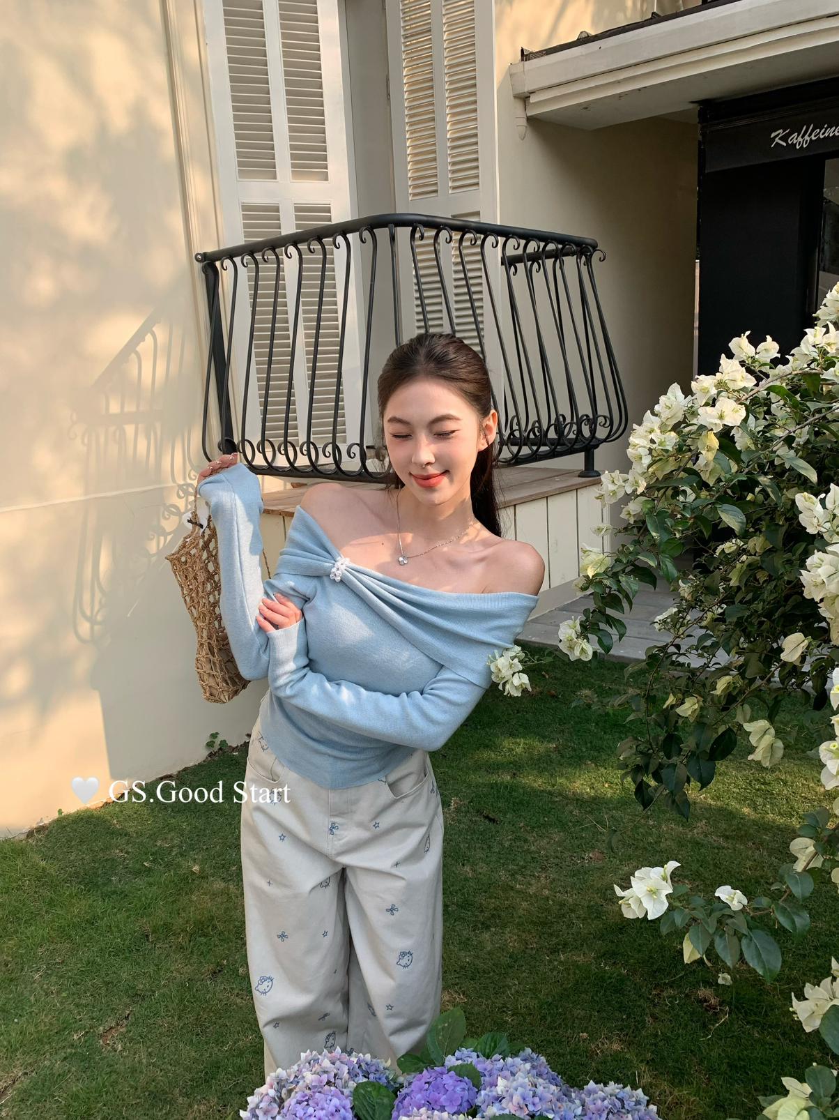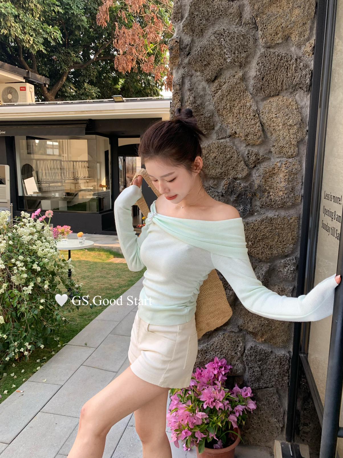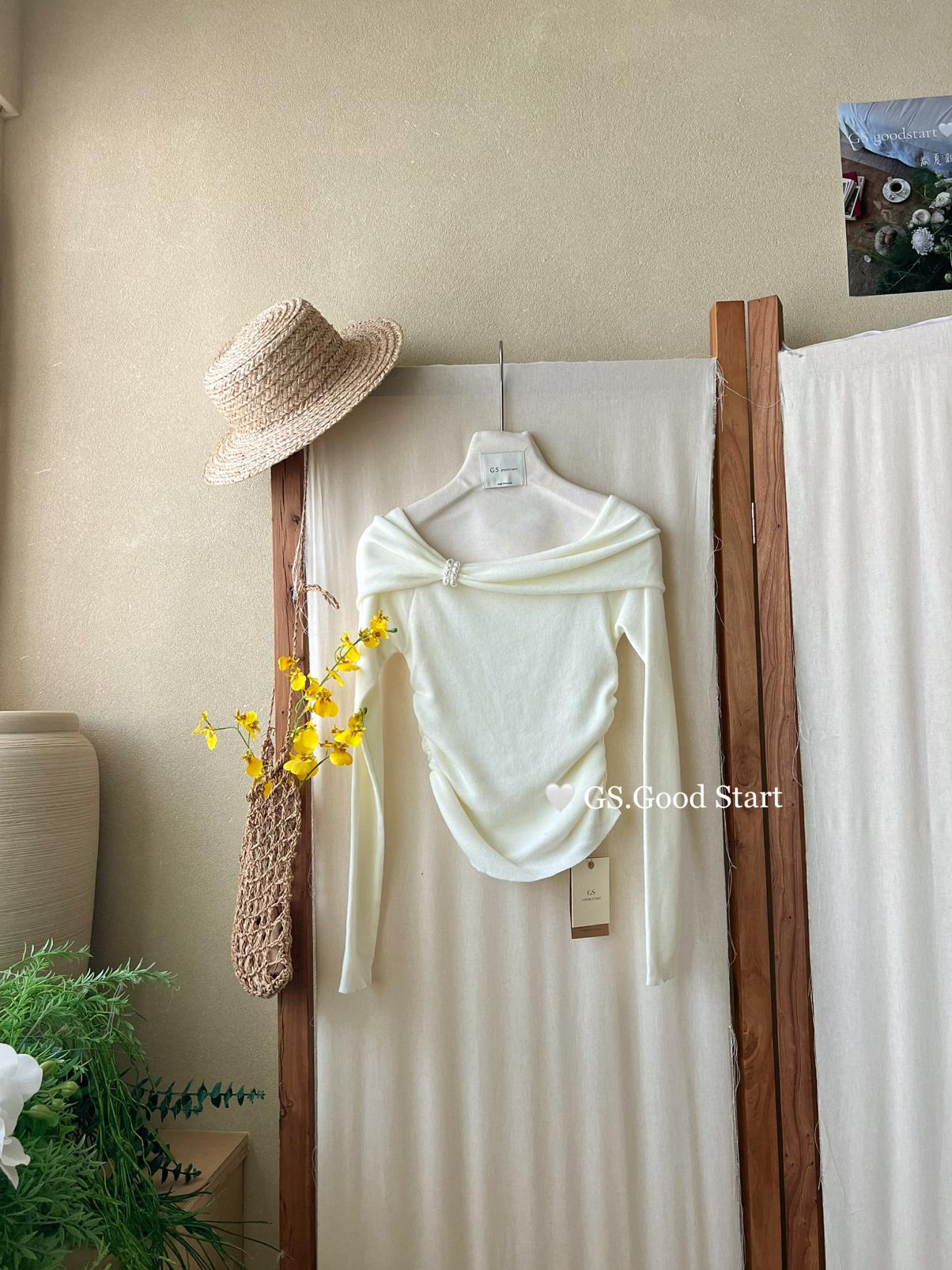 【C8691】‘珍珠少女’浪漫的季節~熱賣不停!春季氣質溫柔一字肩修身針織衫