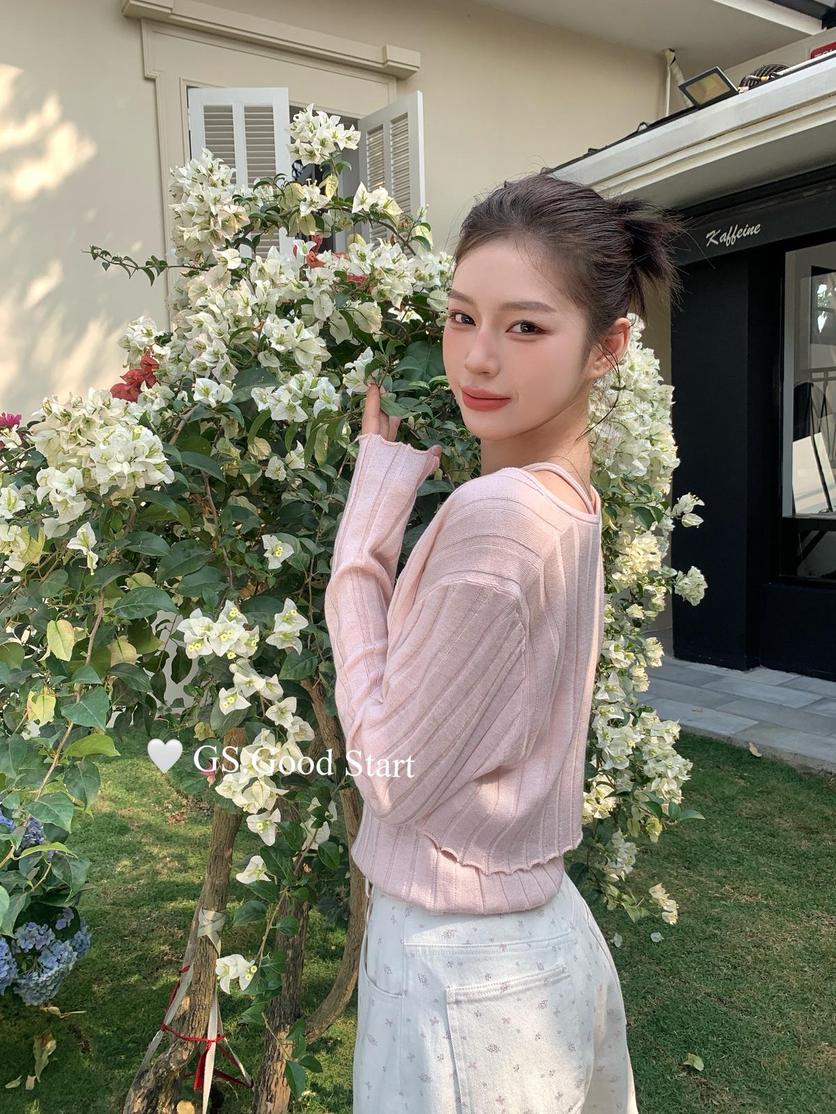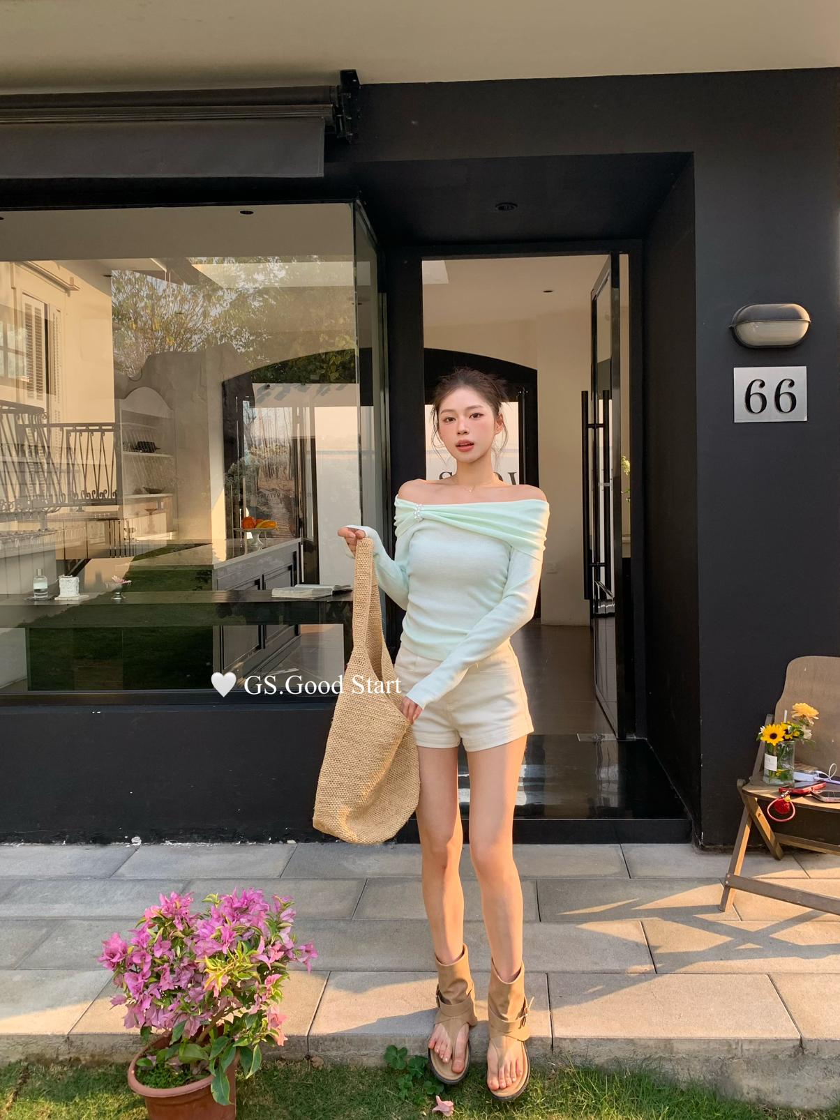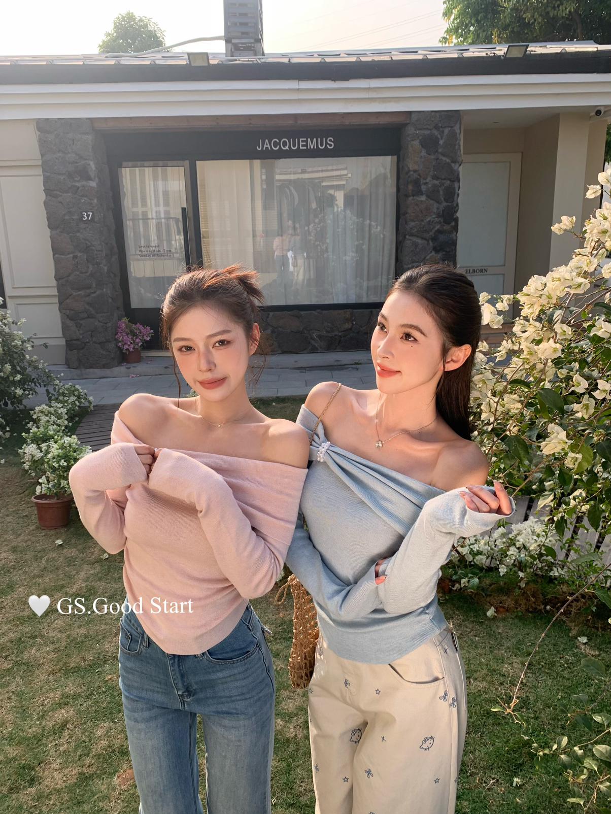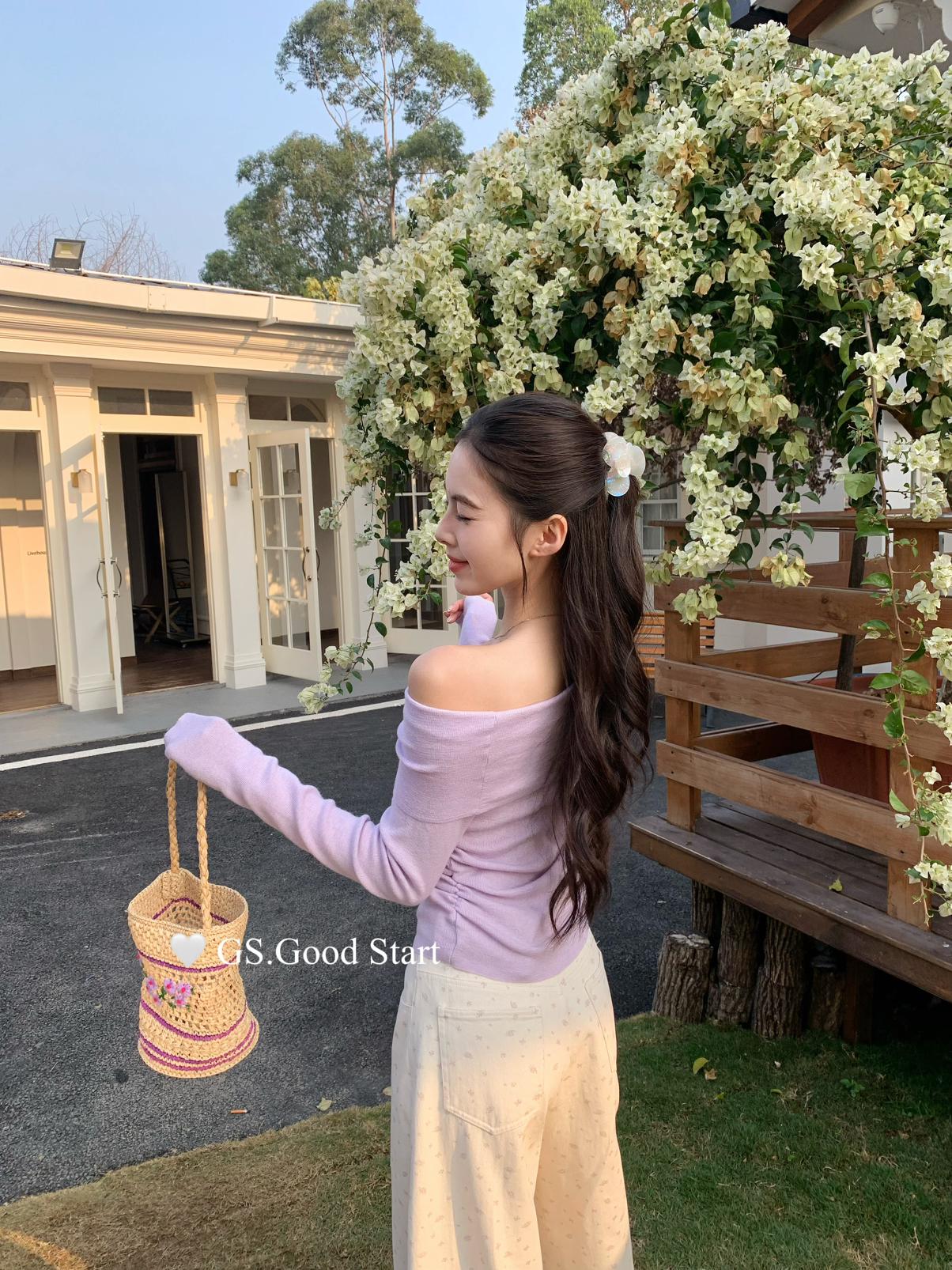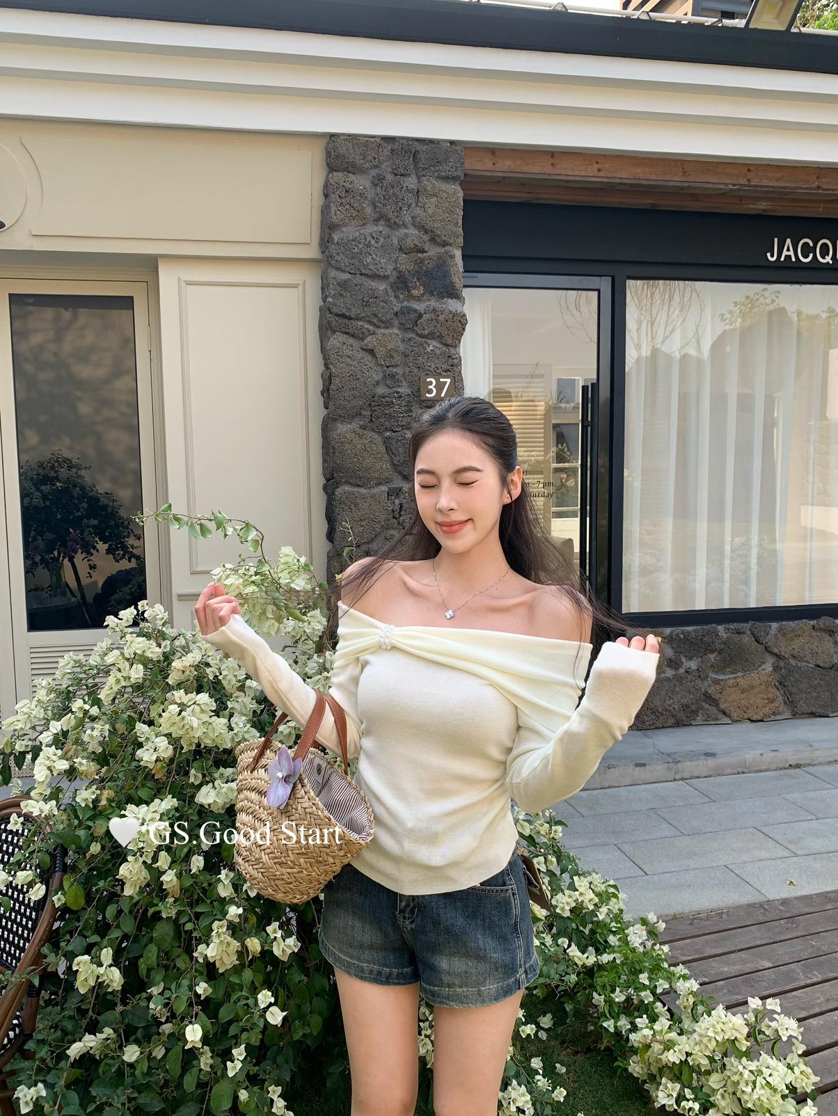 【C8691】‘珍珠少女’浪漫的季節~熱賣不停!春季氣質溫柔一字肩修身針織衫