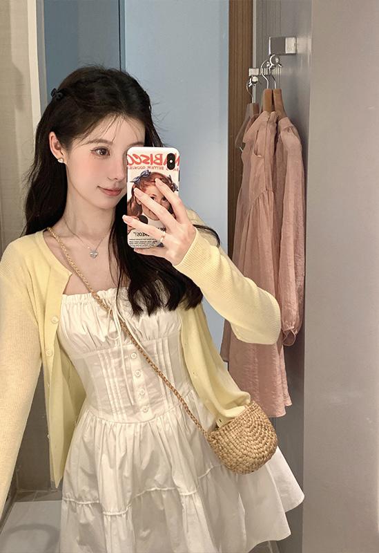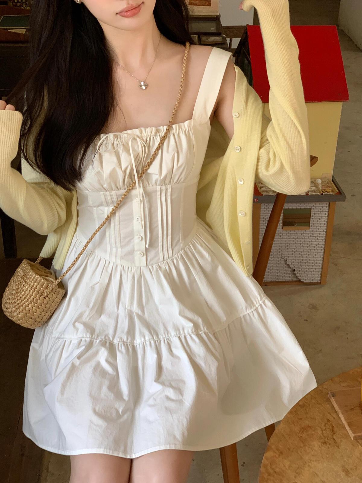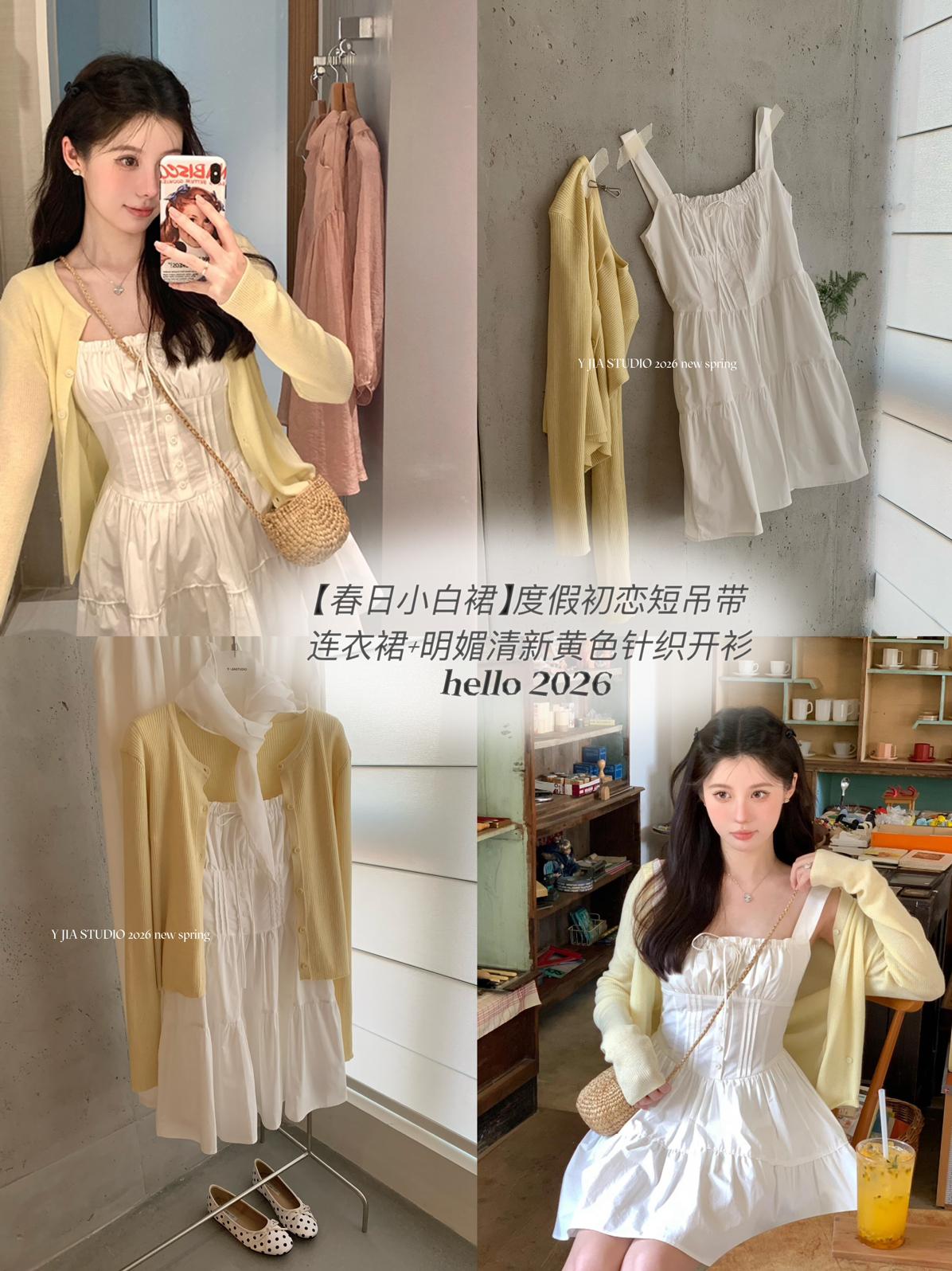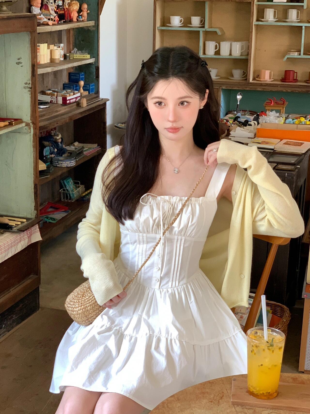 【C8724】“春日小白裙”度假初戀短吊帶連衣裙+明媚清新黃色針織開衫套裝(不配圍脖)