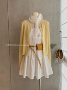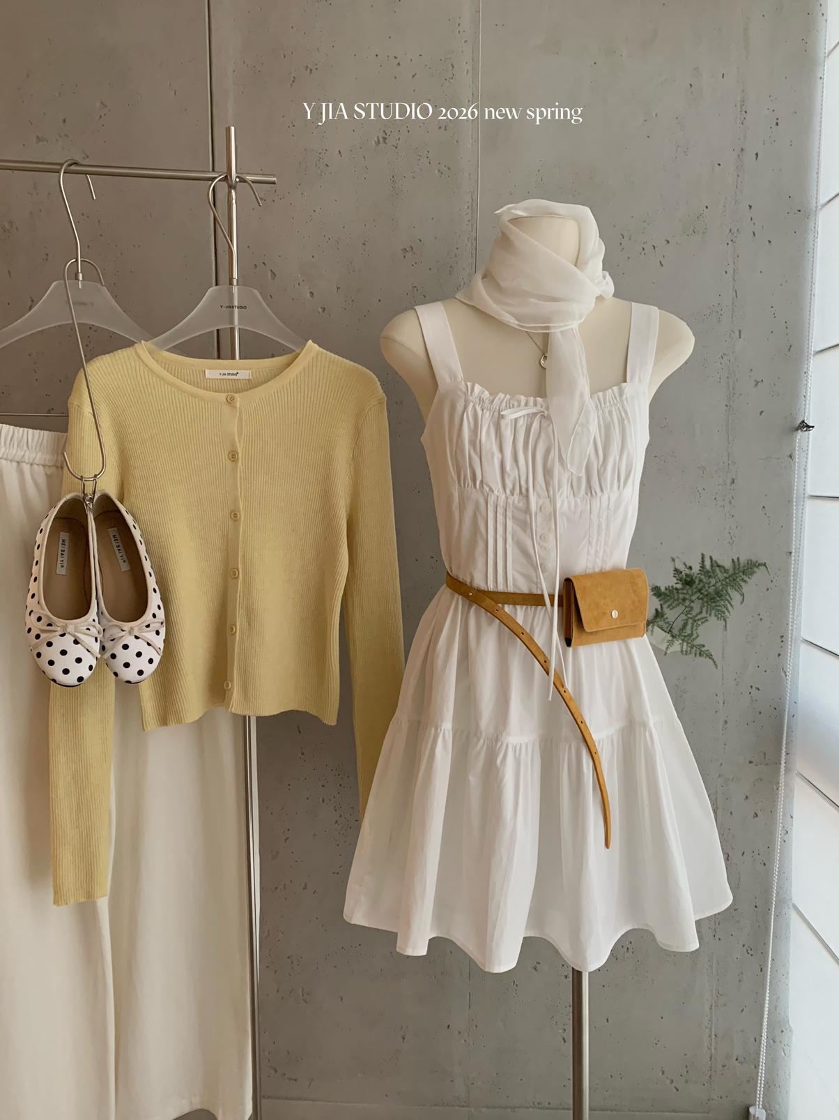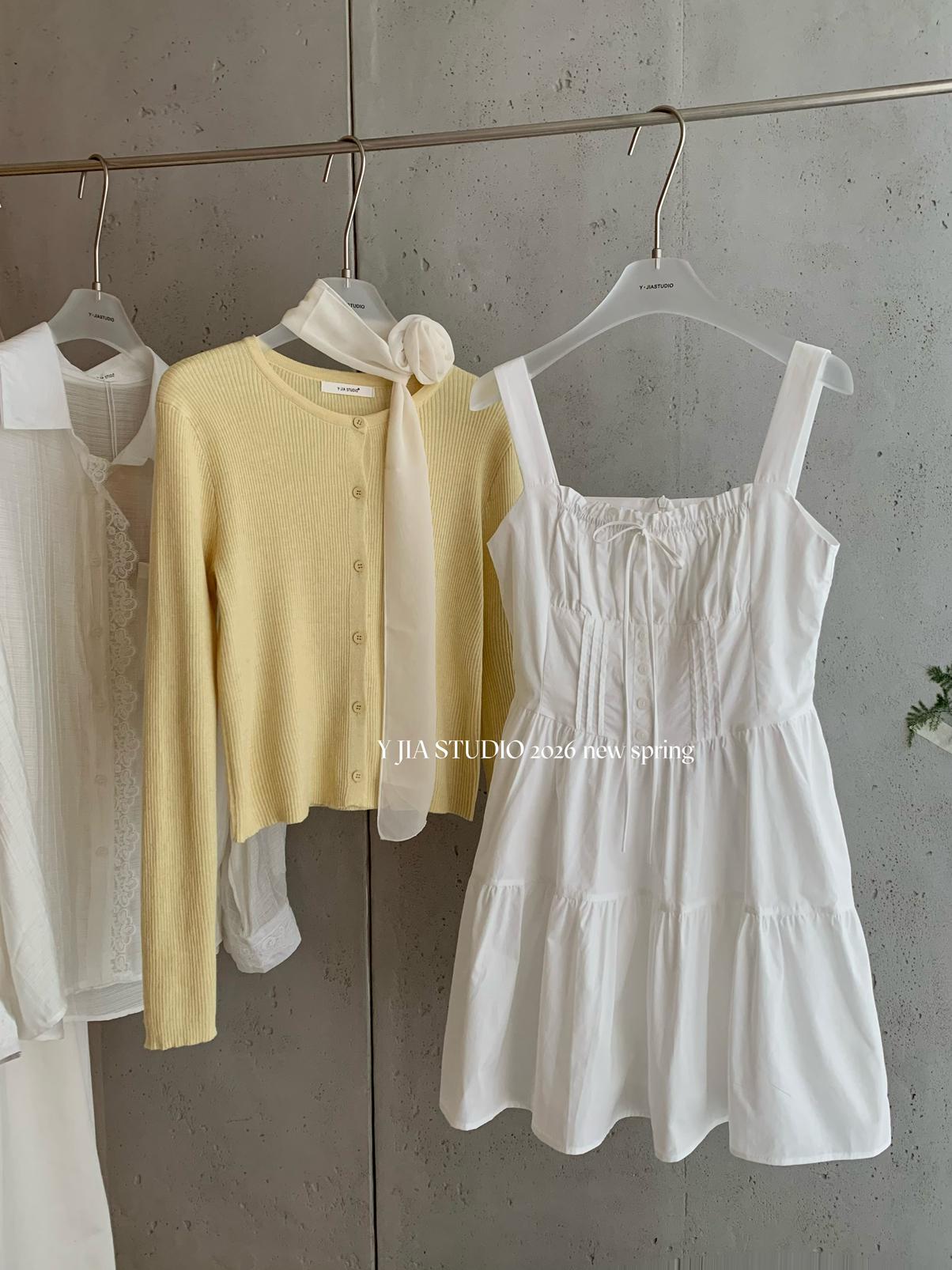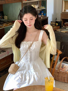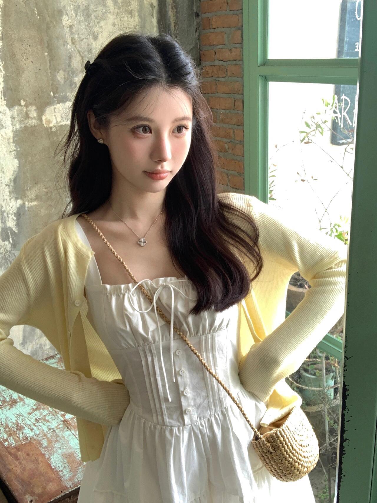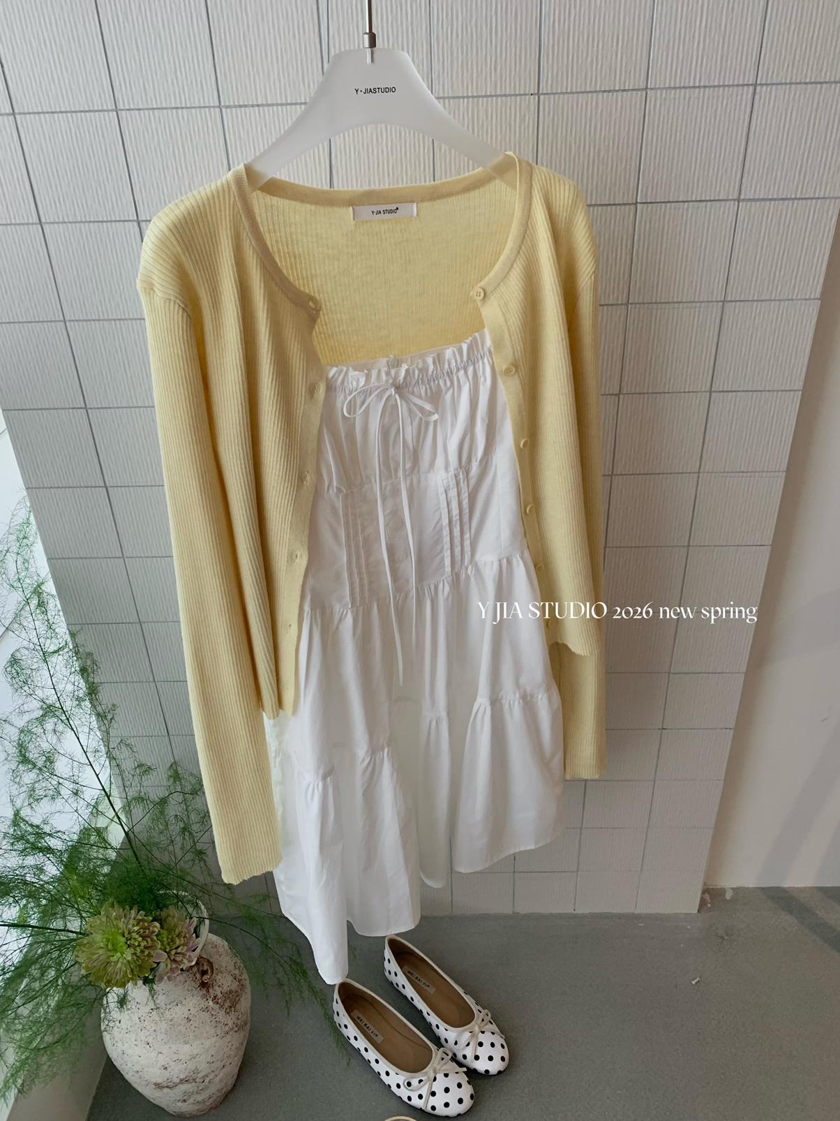 【C8724】“春日小白裙”度假初戀短吊帶連衣裙+明媚清新黃色針織開衫套裝(不配圍脖)