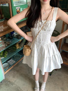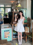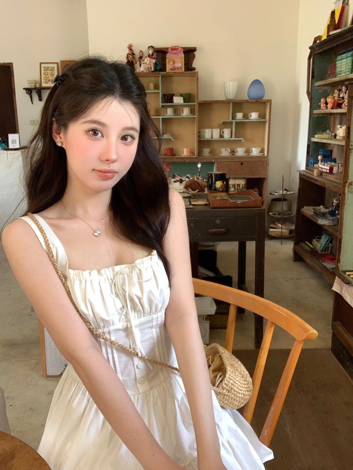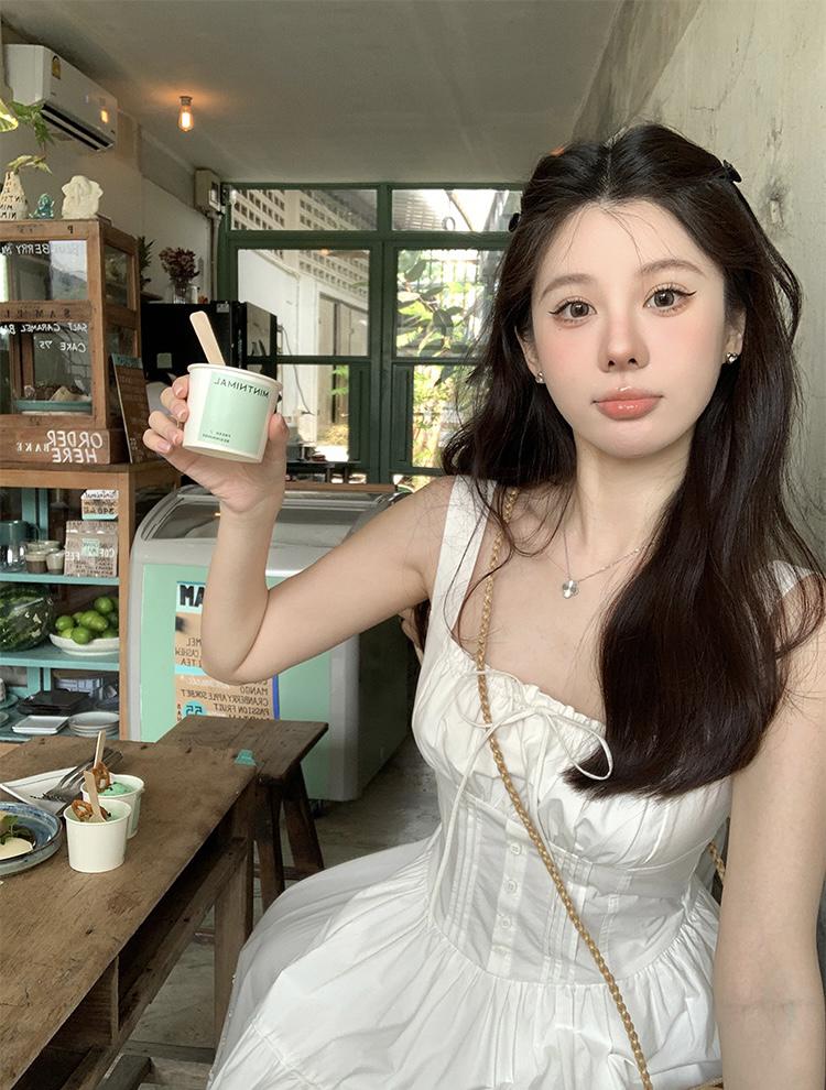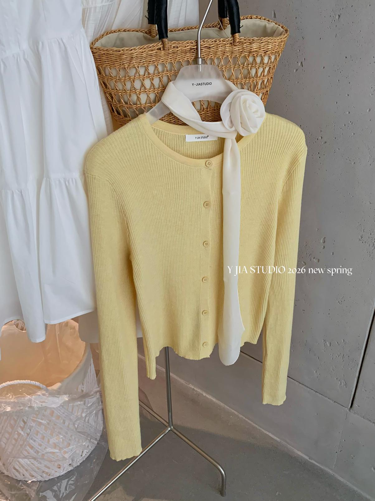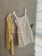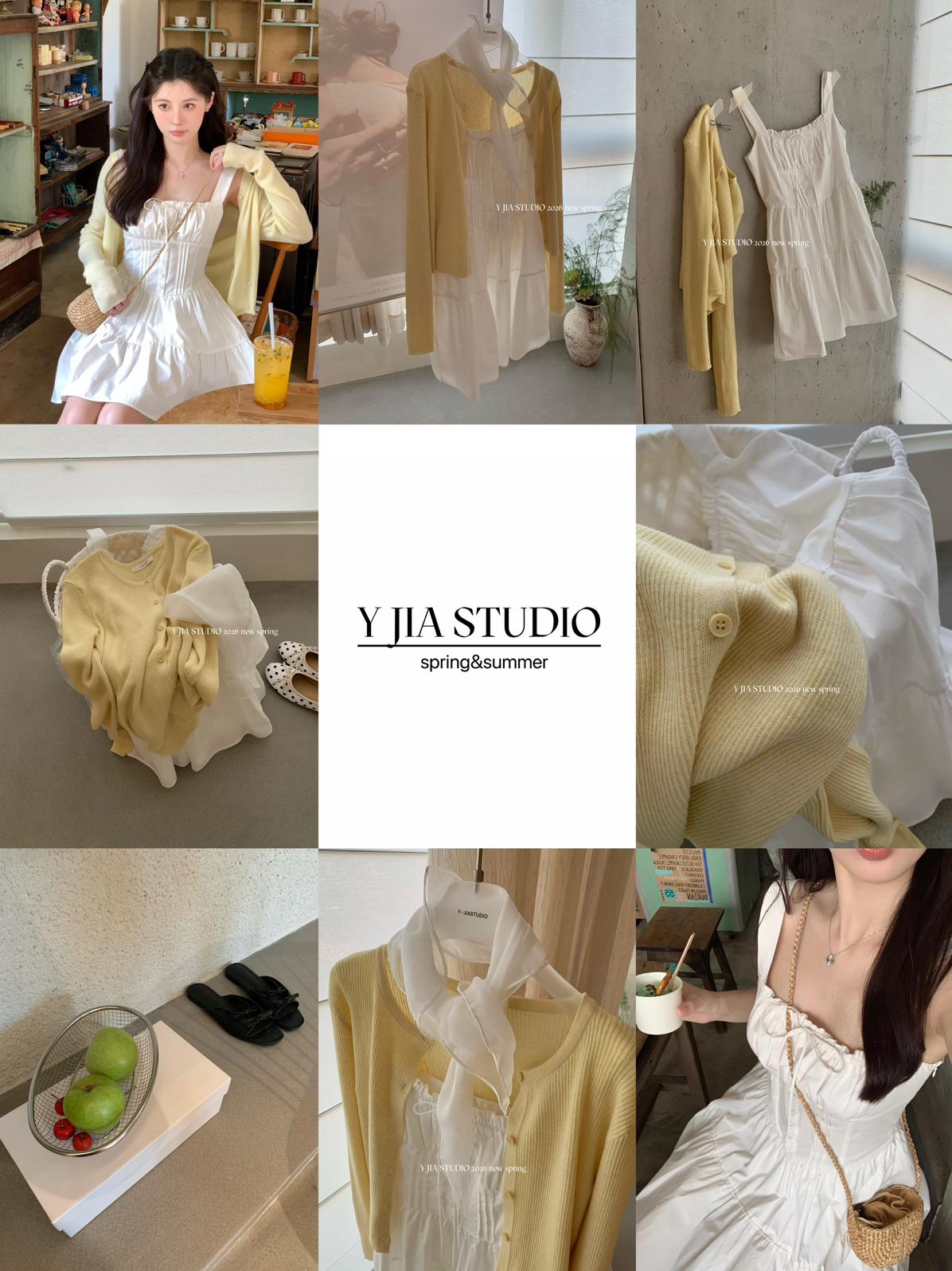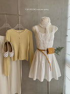 【C8724】“春日小白裙”度假初戀短吊帶連衣裙+明媚清新黃色針織開衫套裝(不配圍脖)