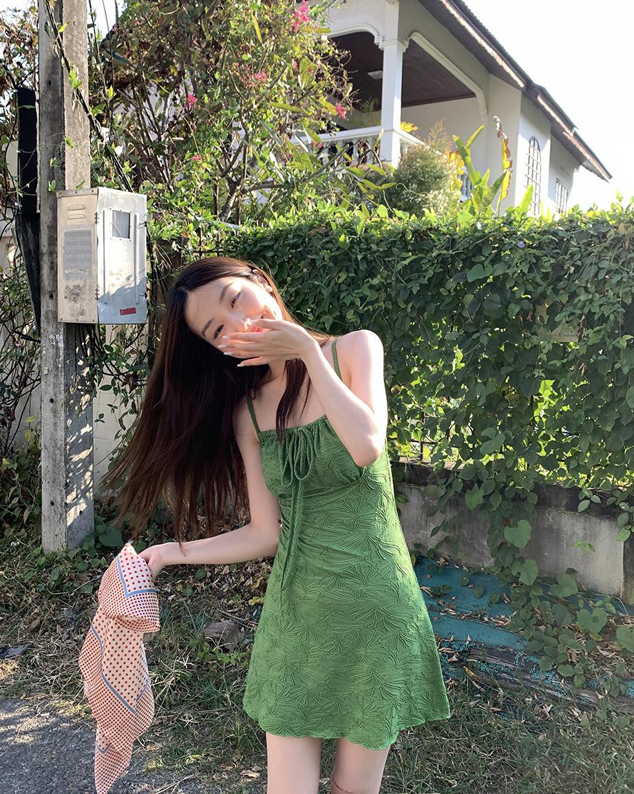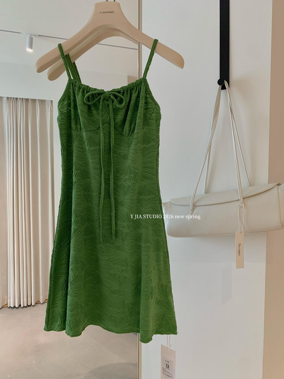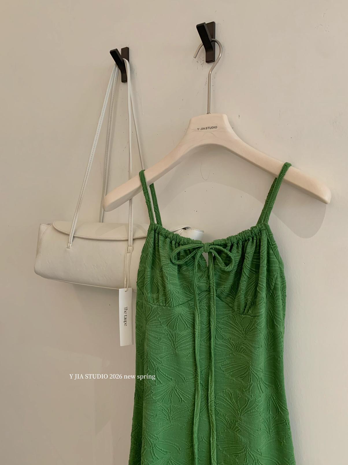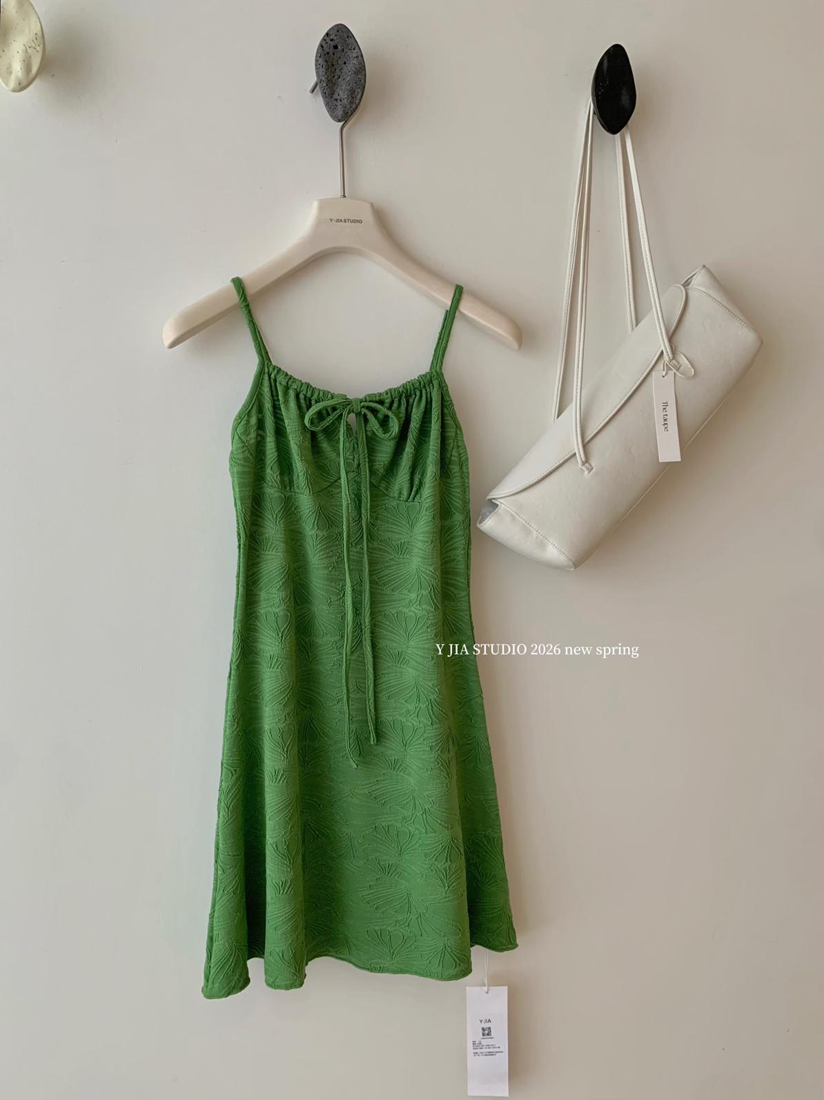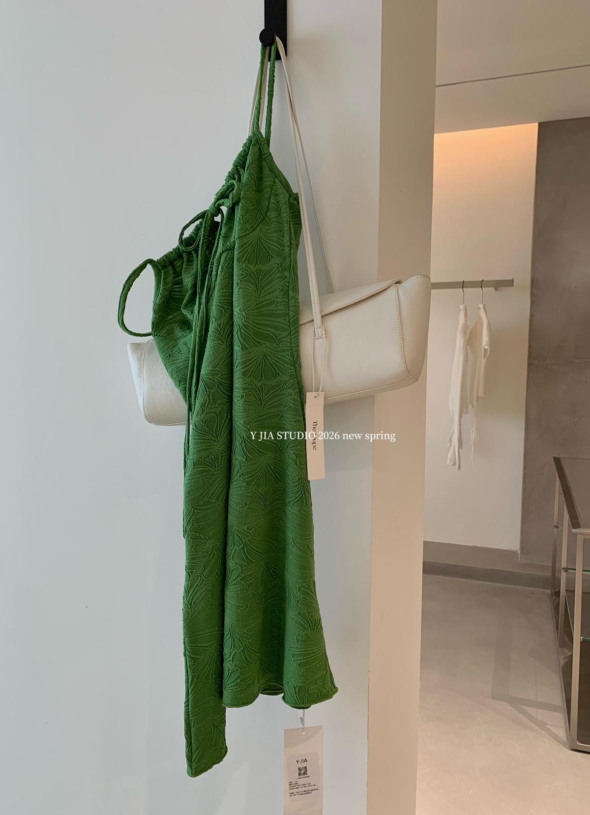 3. 【C8835】度假風抽繩繫帶方領提花吊帶連衣裙