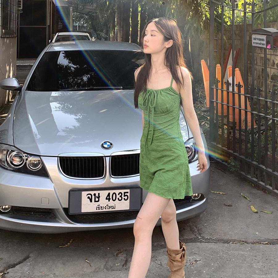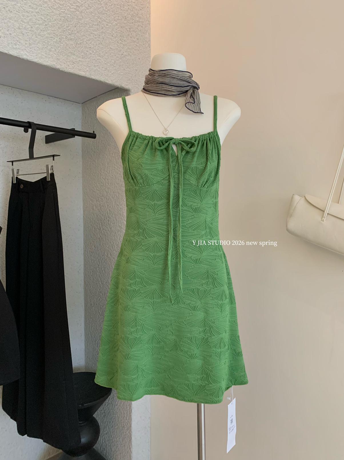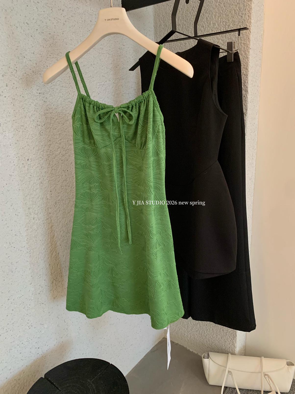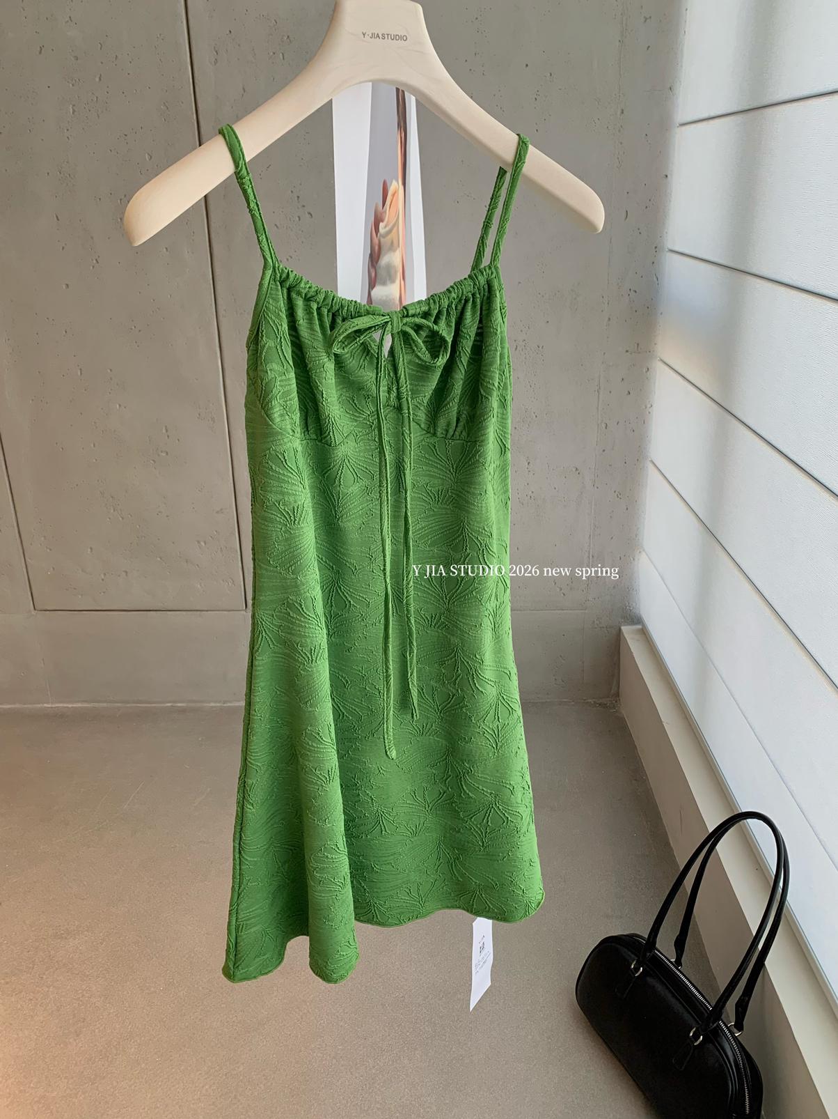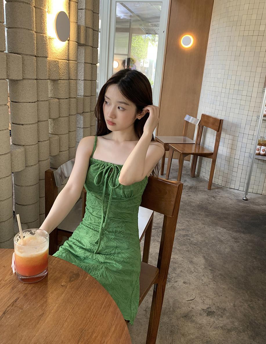 3. 【C8835】度假風抽繩繫帶方領提花吊帶連衣裙
