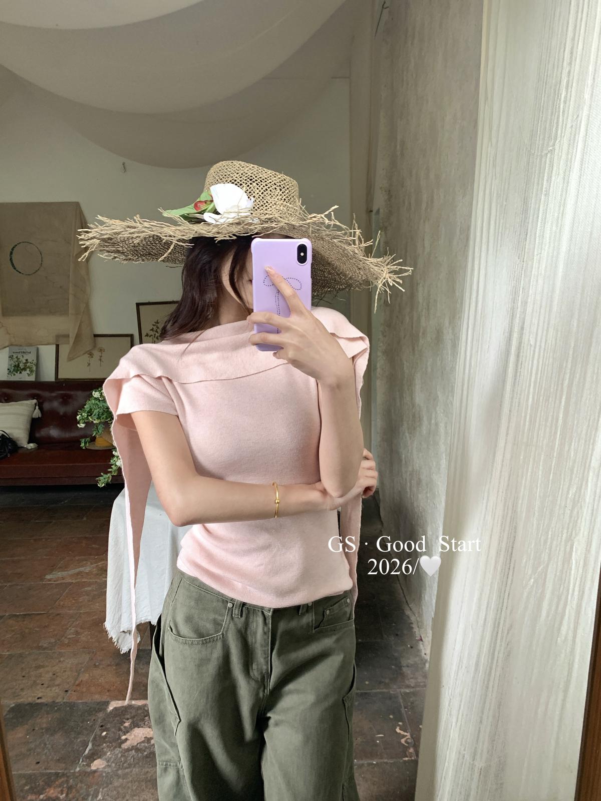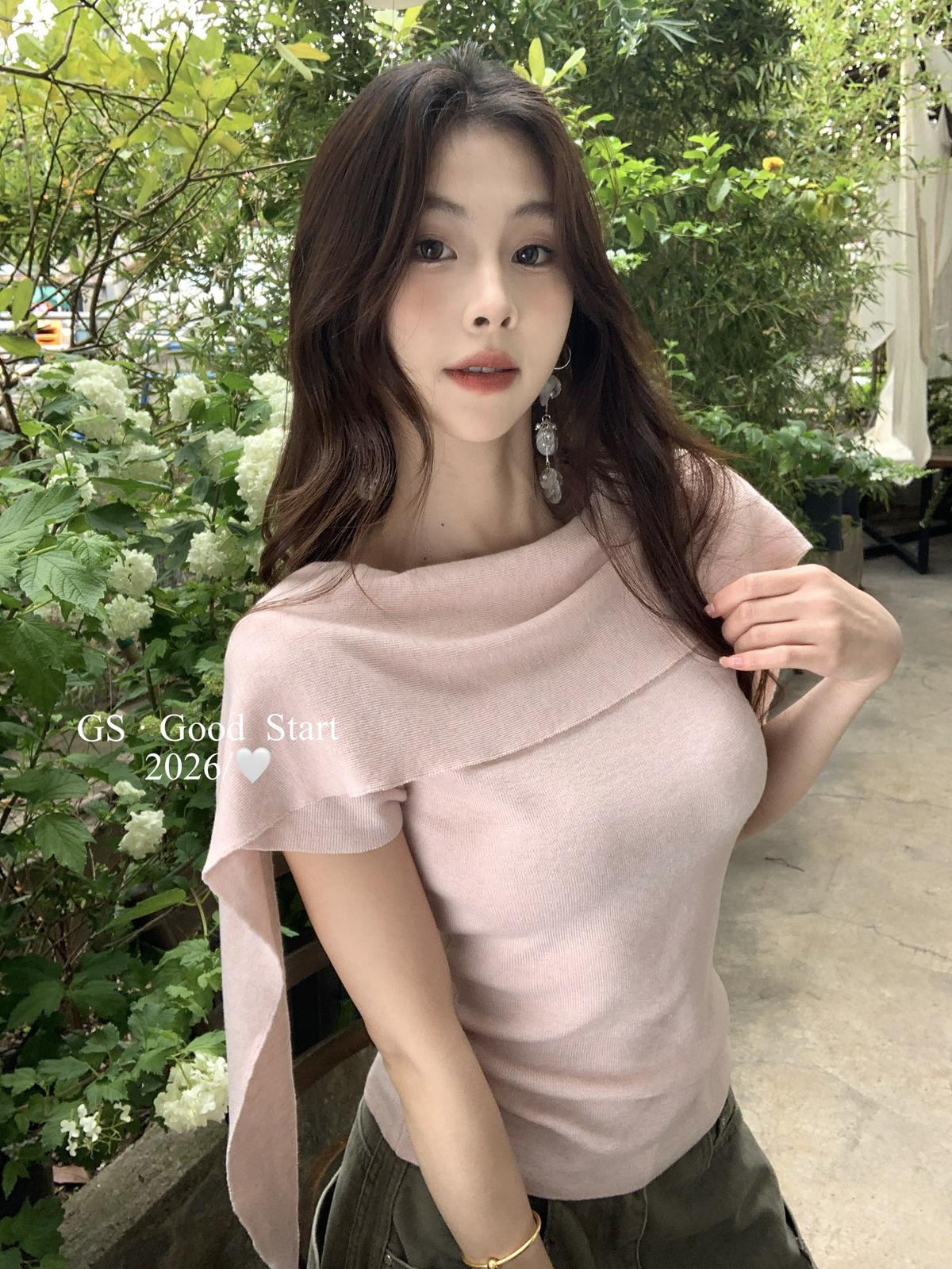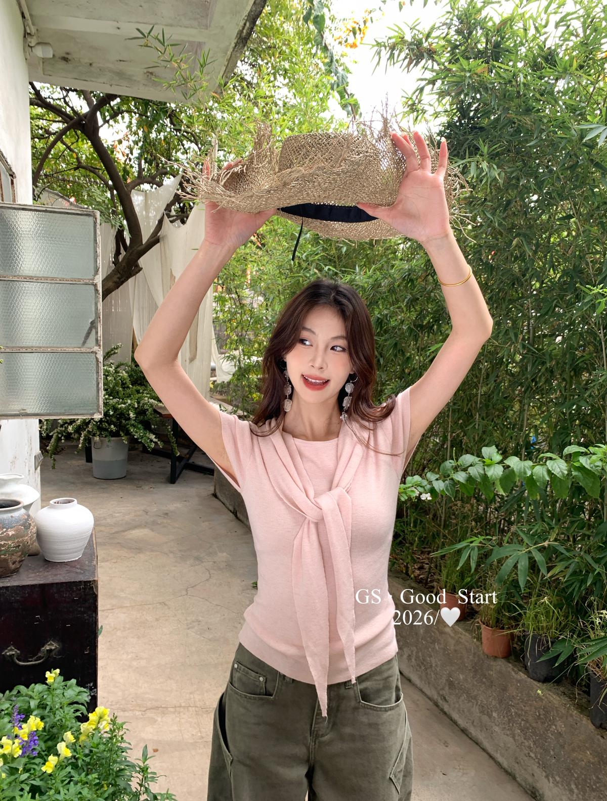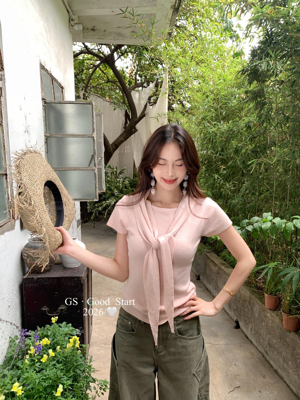 3. 【C8850】碼住!正反兩穿*hen顯好身材_夏氣質飄帶設計感修身短袖針織小衫(配可拆卸披肩)(含6%羊毛)