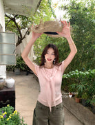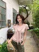 【C8850】碼住!正反兩穿*hen顯好身材_夏氣質飄帶設計感修身短袖針織小衫(配可拆卸披肩)(含6%羊毛)