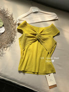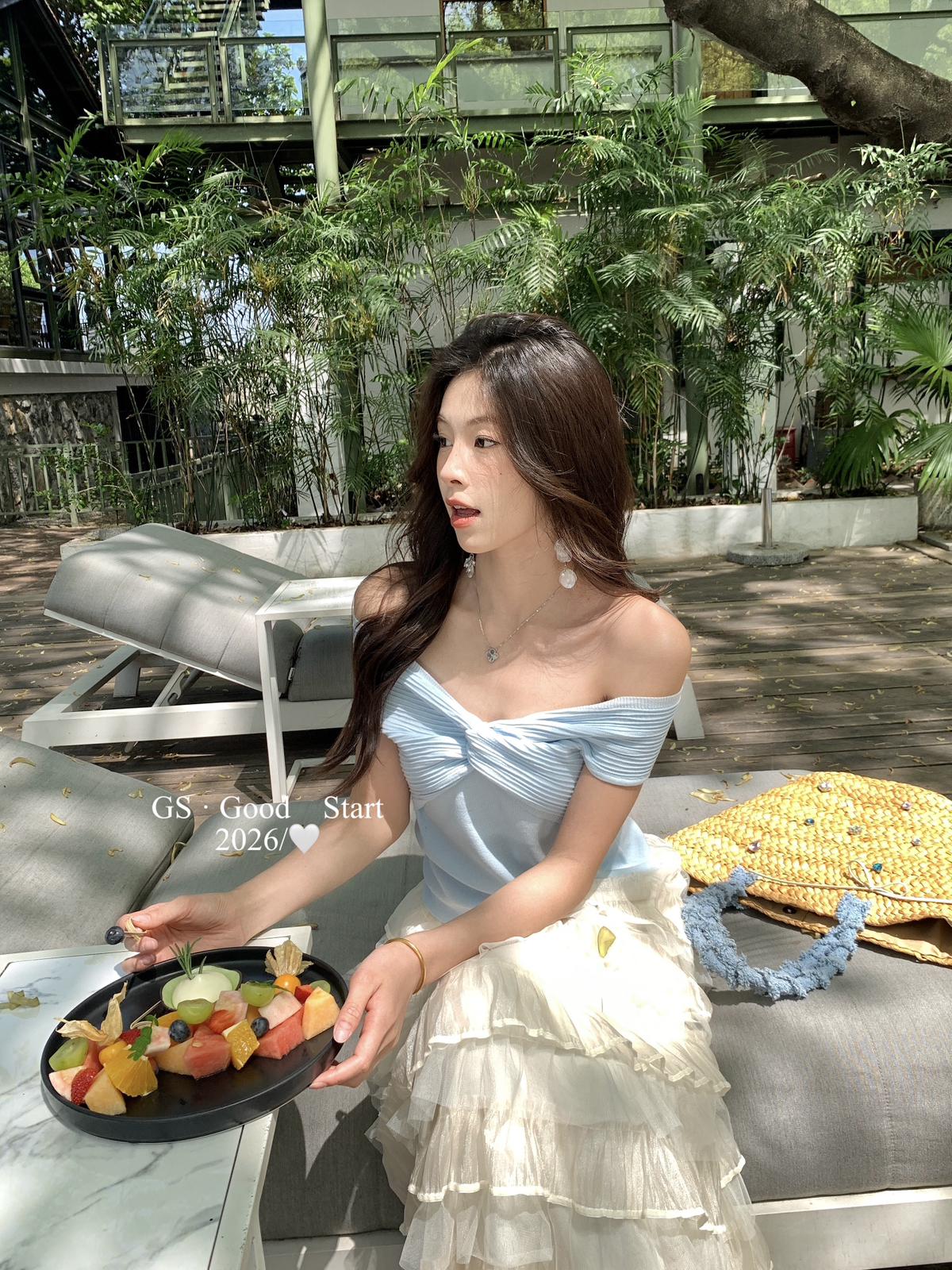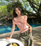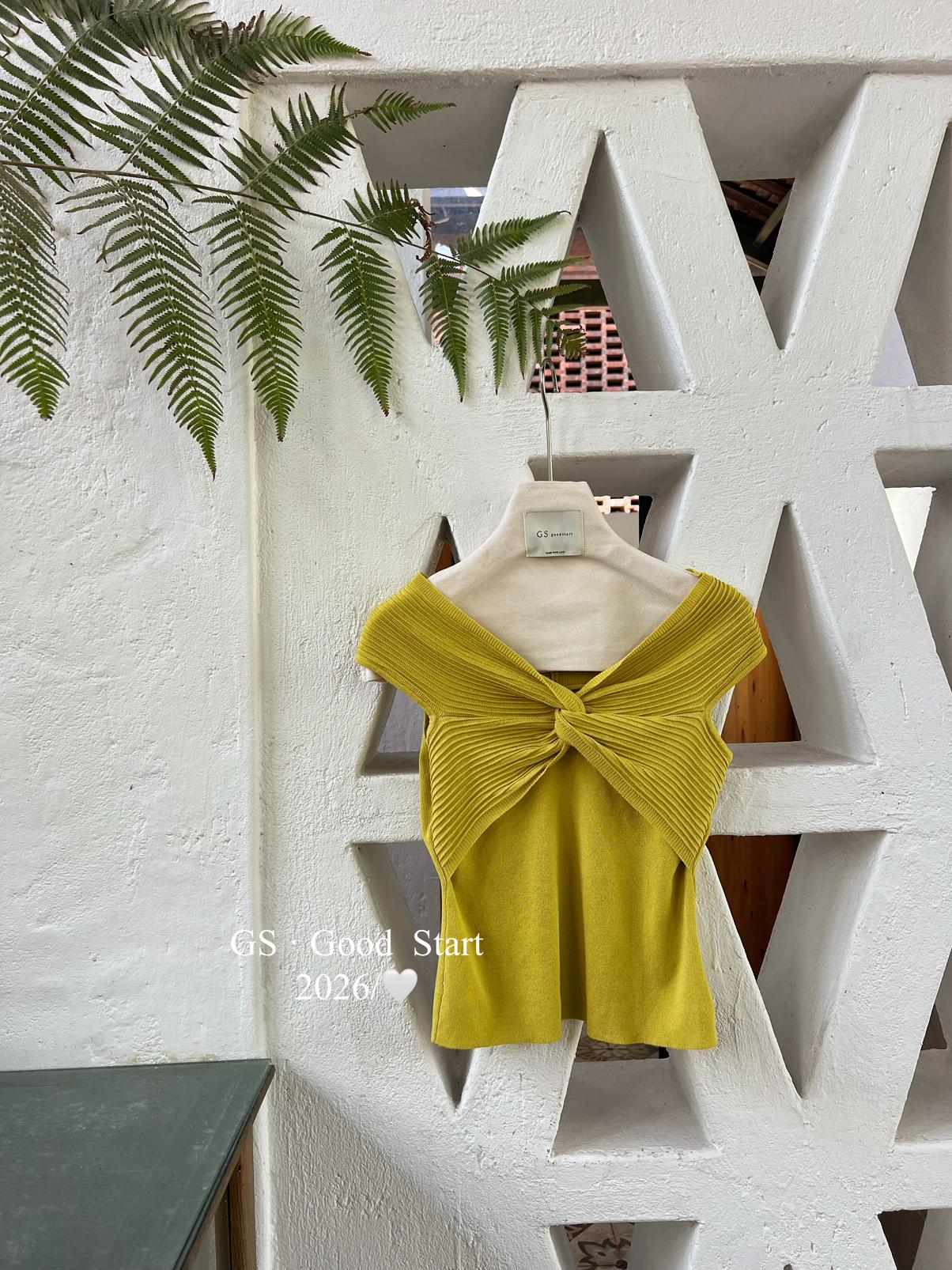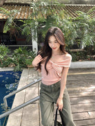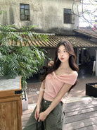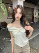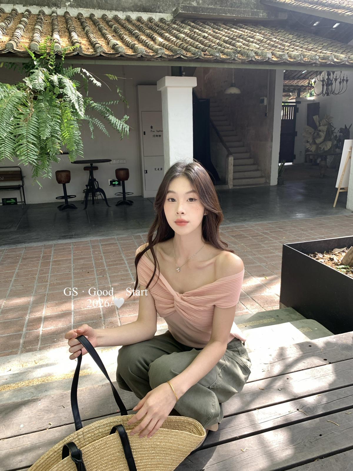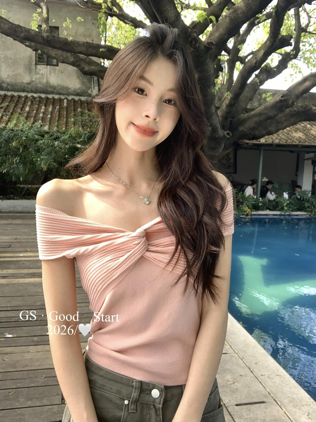 【C8879】紙片人歐尼*純純欲動~補單王!夏季氣質溫柔紐結一字肩顯瘦針織小衫