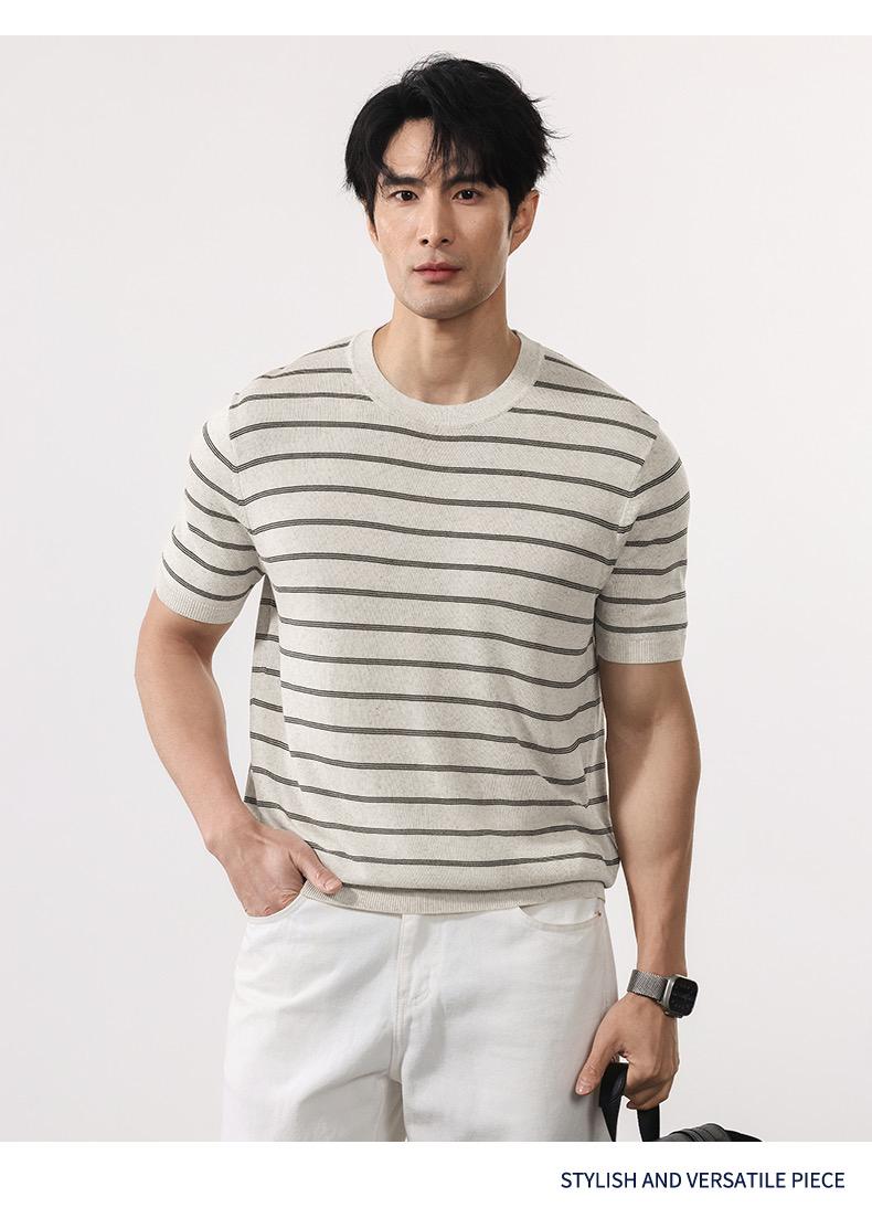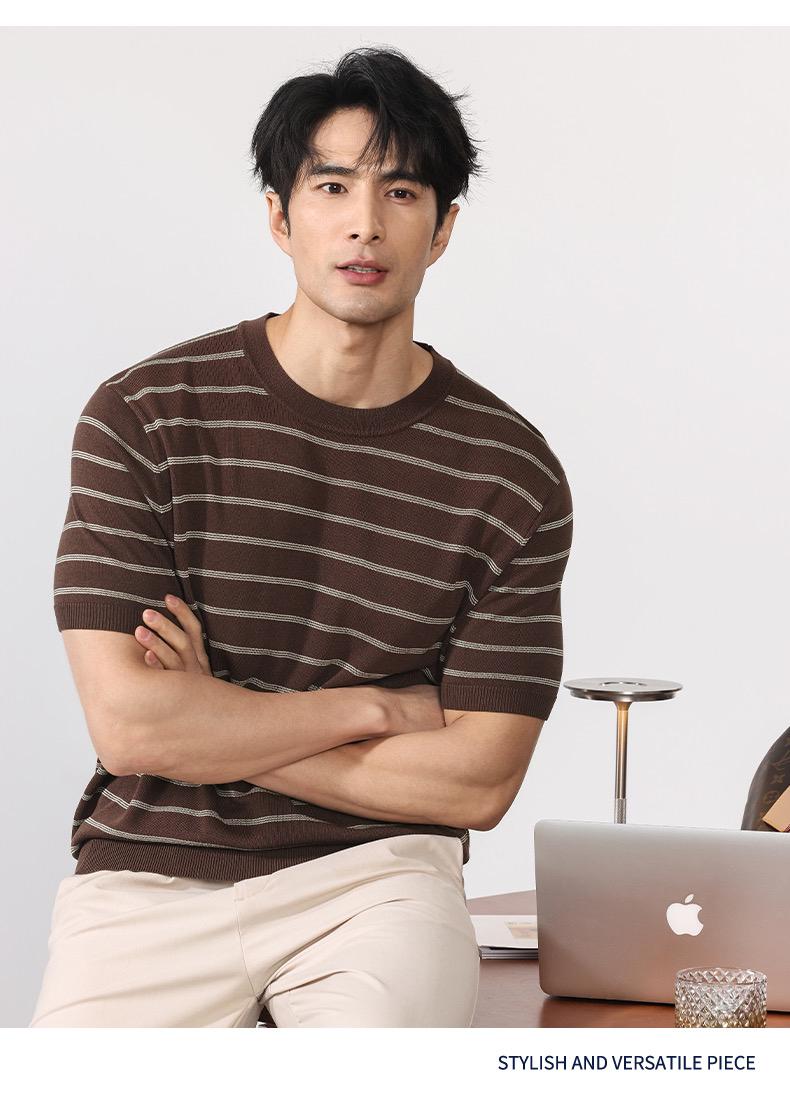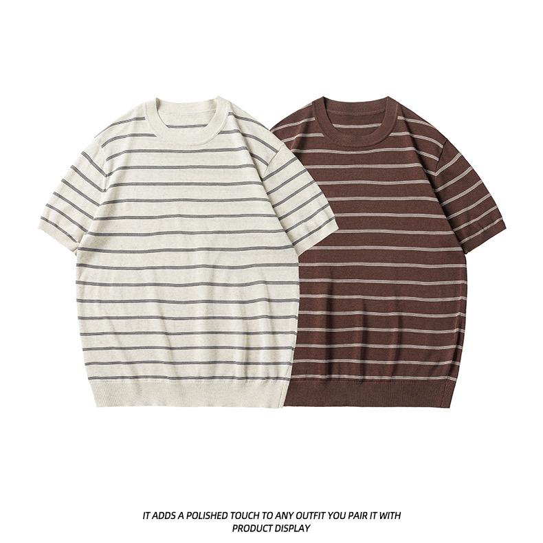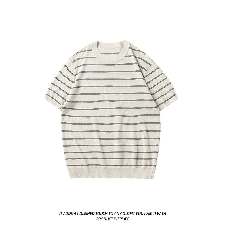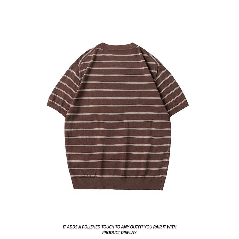 【YS2914】高端品質老錢風短袖T恤男士條紋針織衫體恤衫日系復短袖T恤