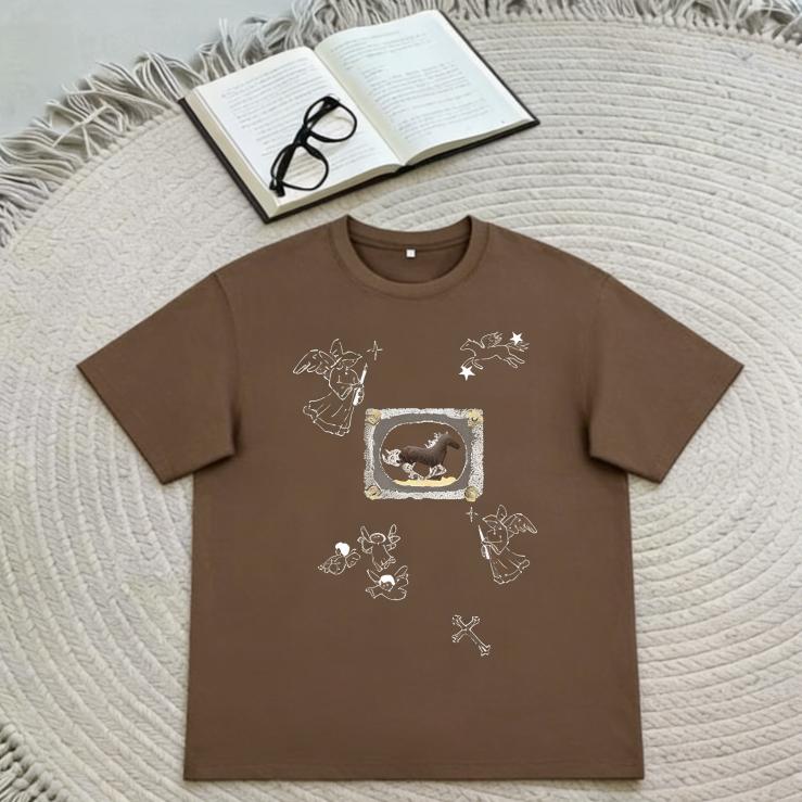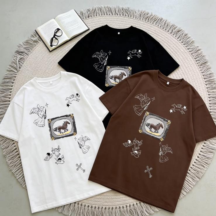 【YS2917】落肩寬鬆版型舒適上衣手繪塗鴉飛馬印花短袖T恤