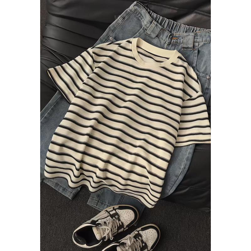 【YS2921】新款夏季男士大碼寬鬆港風潮流百搭休閒條紋圓領短袖T恤
