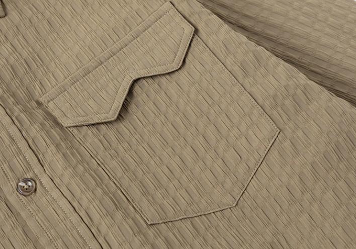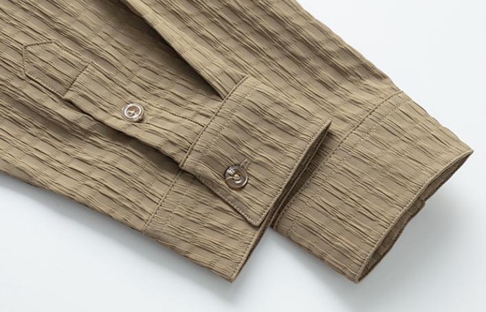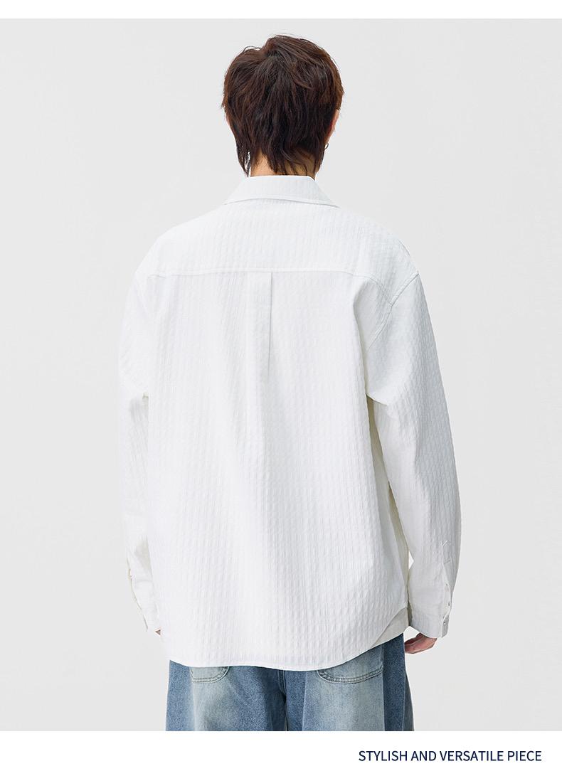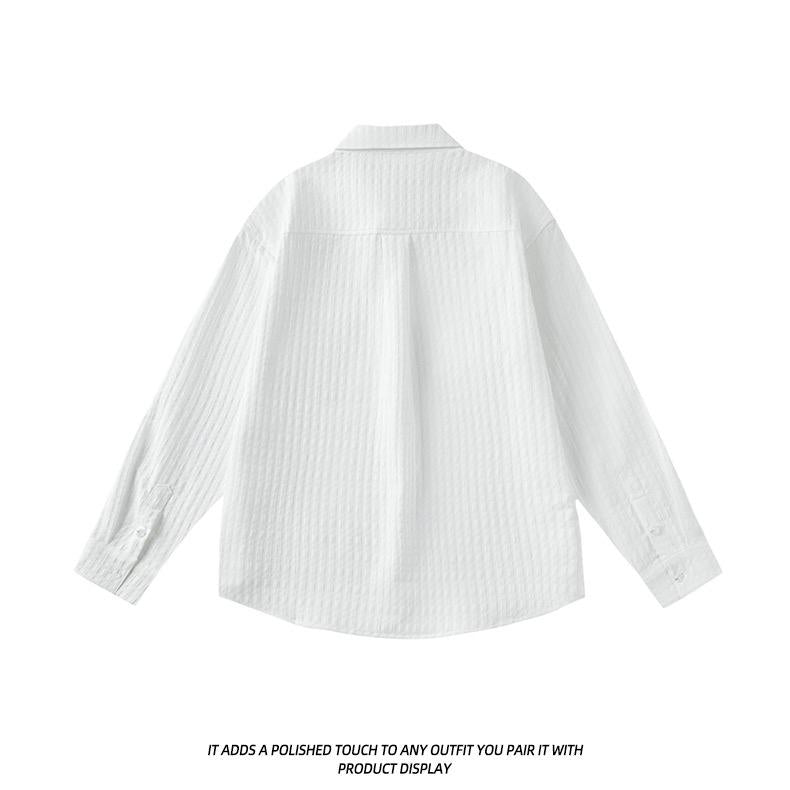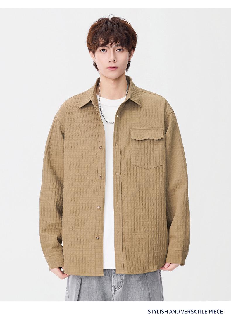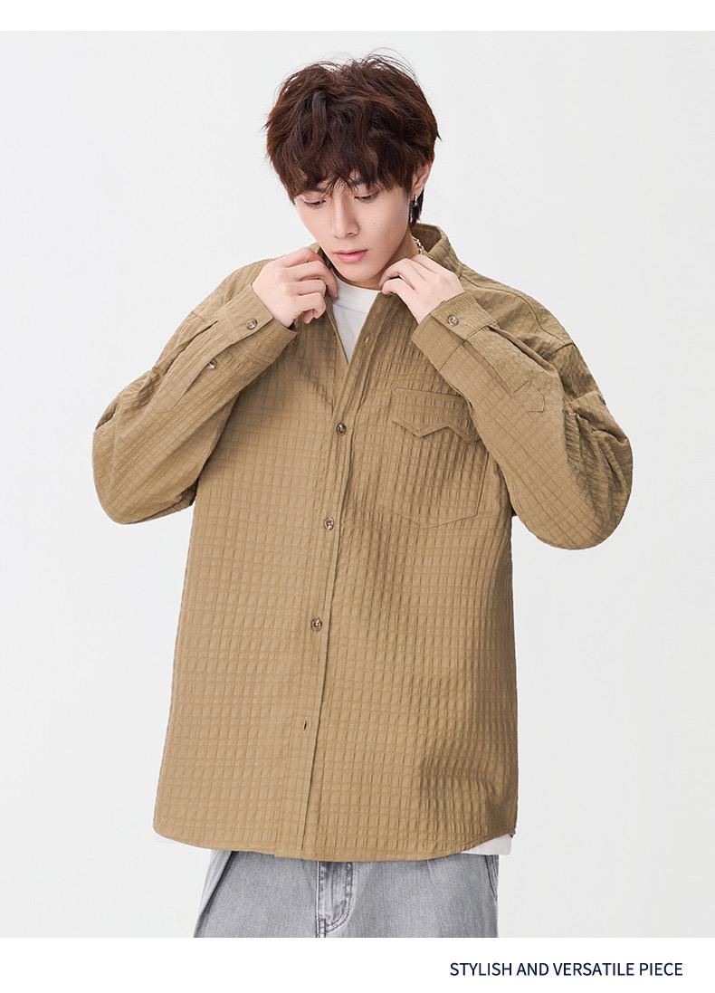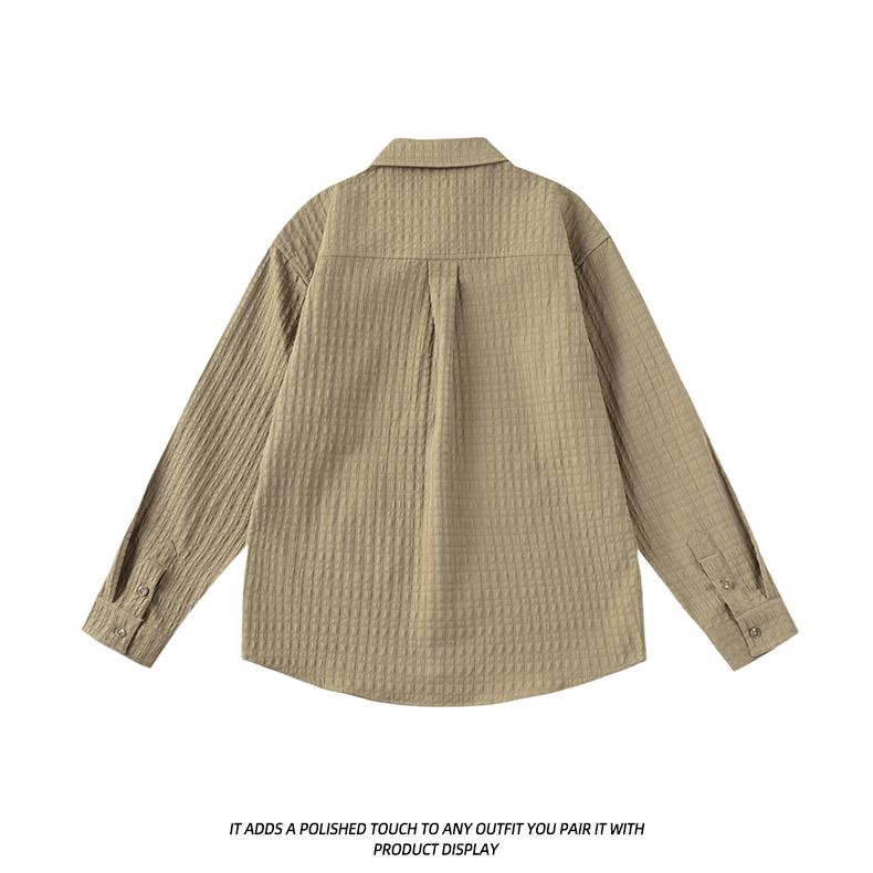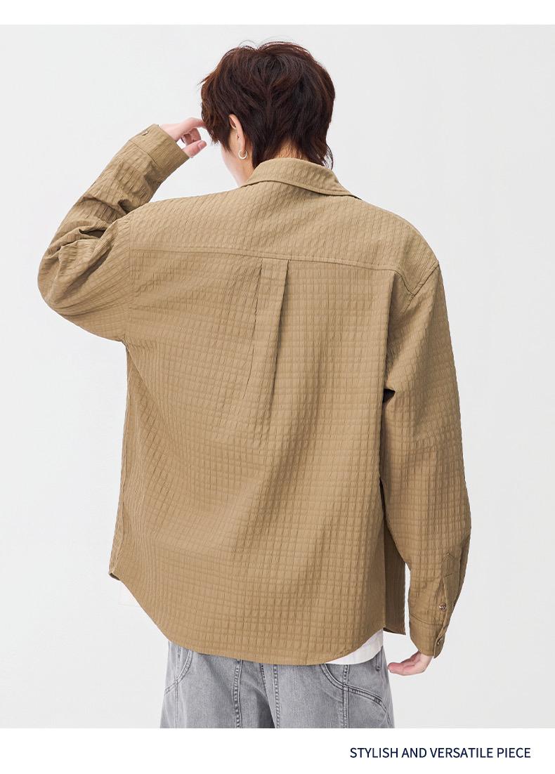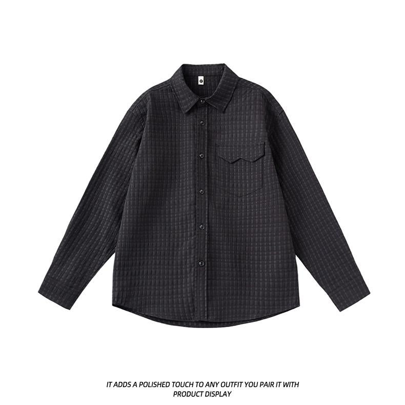 【YS2925】夏爆款乾爽肌理格紋長袖襯衫男士翻領寬鬆純色日系復古休閒襯衫