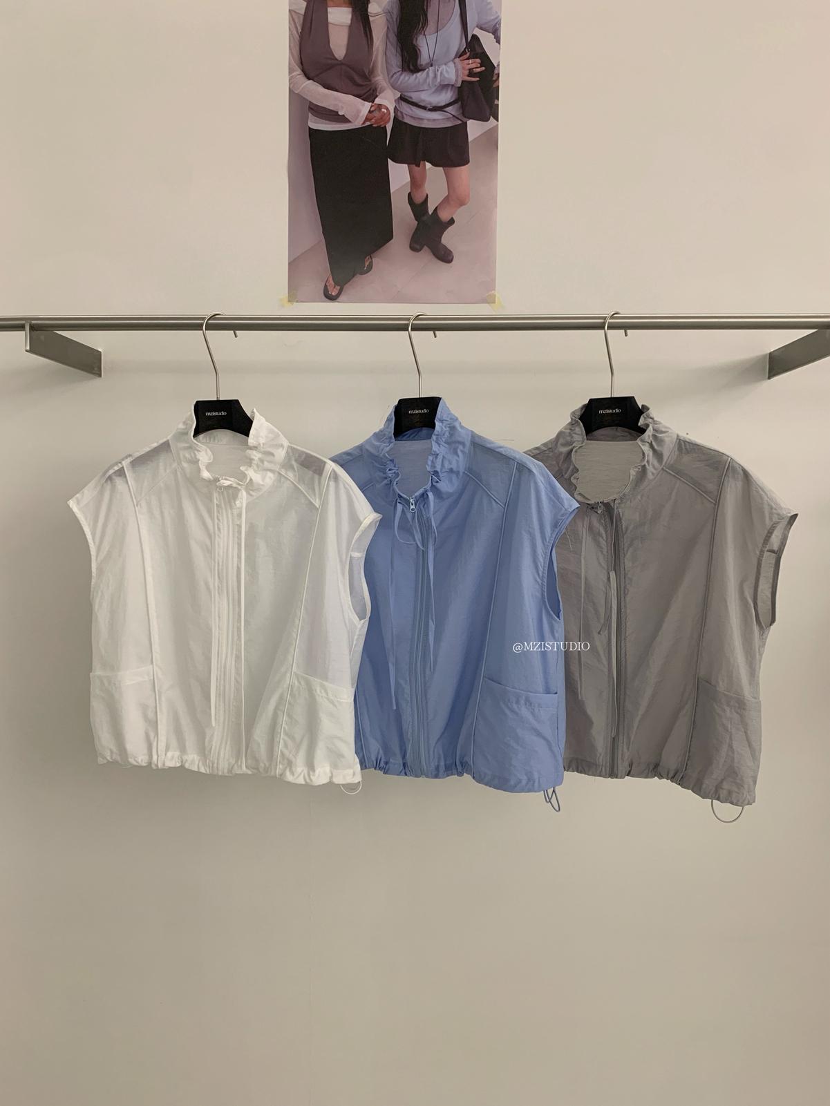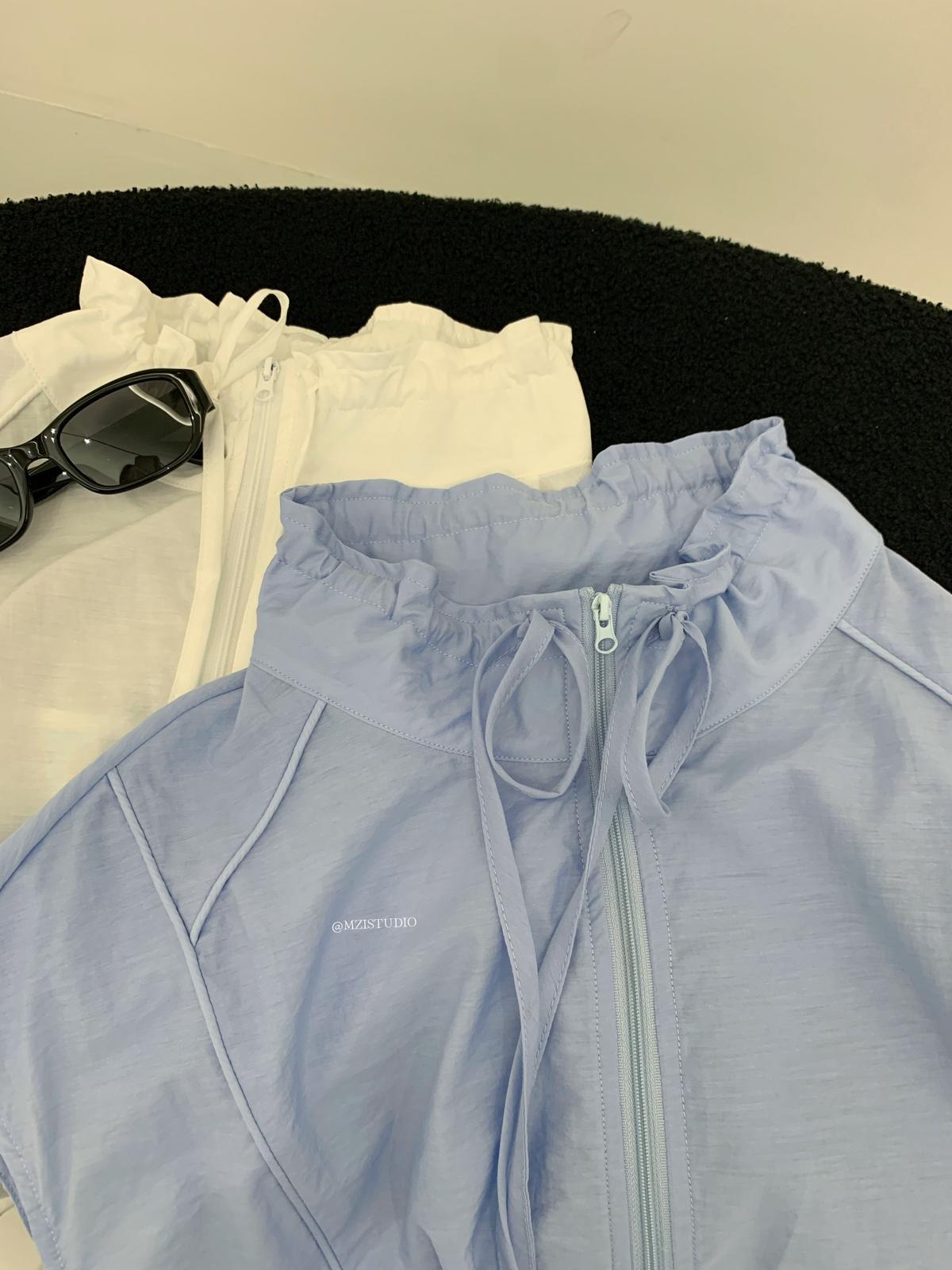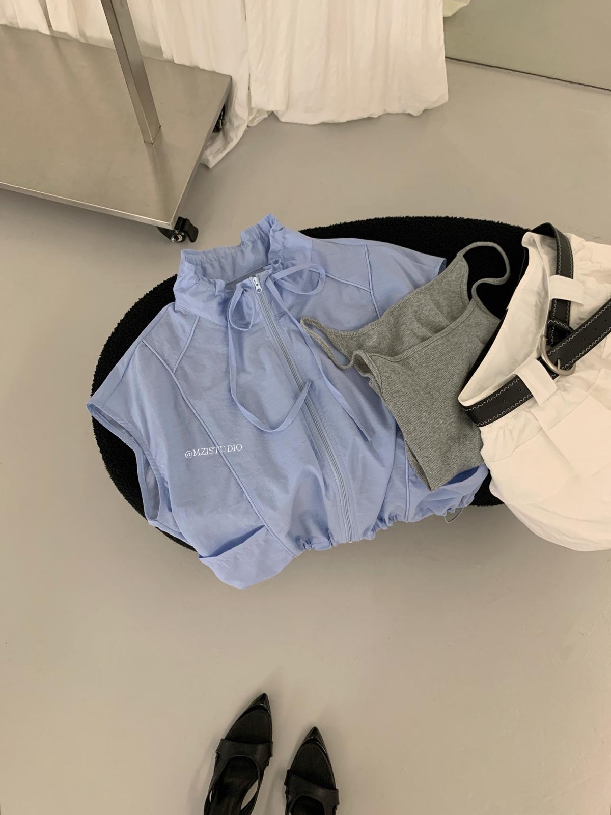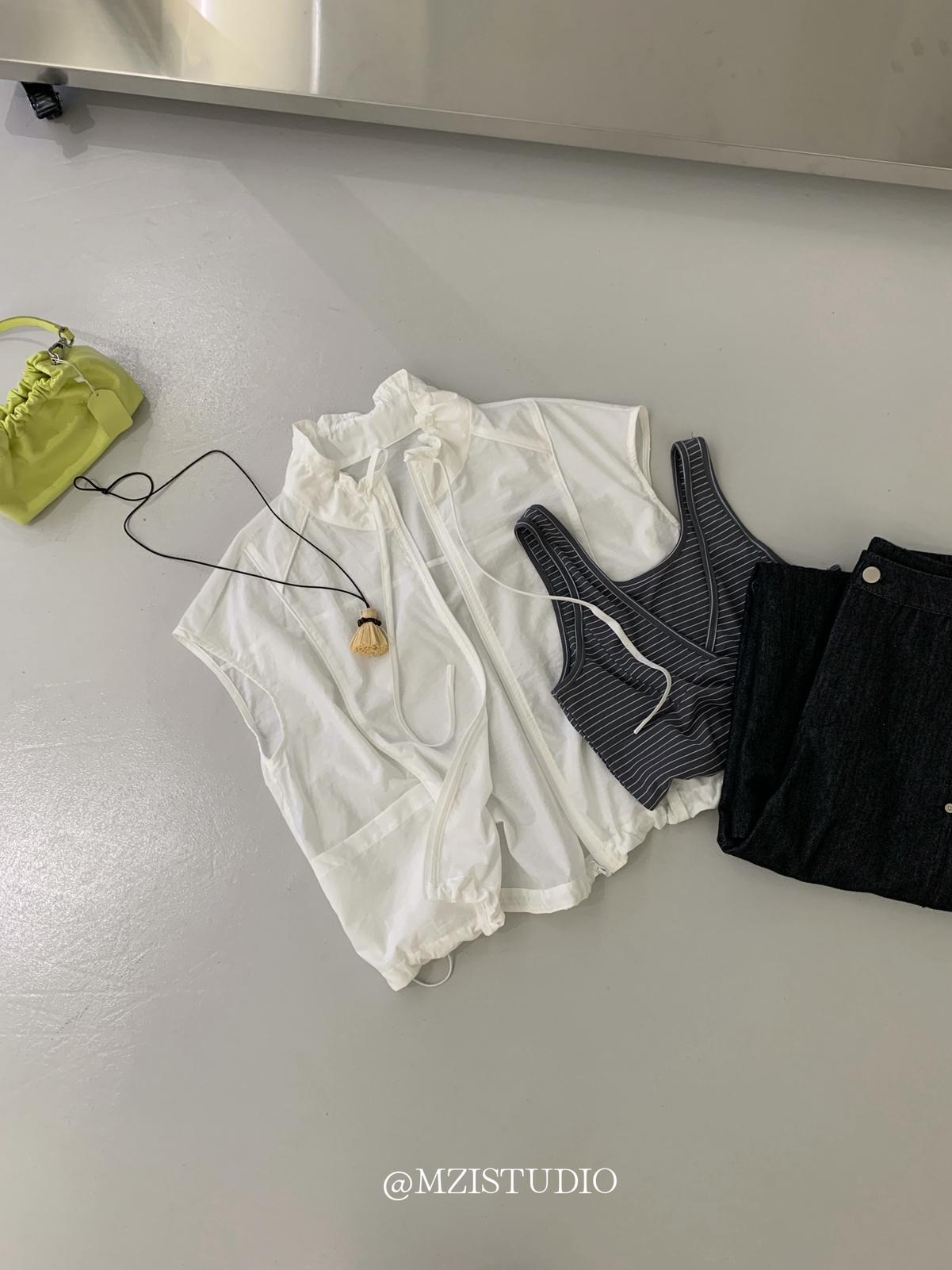 【C9056】原野自由韓調夏日透氣舒適疊穿抽繩立領拉鍊口袋小衫(只賣小衫/不含項鍊)