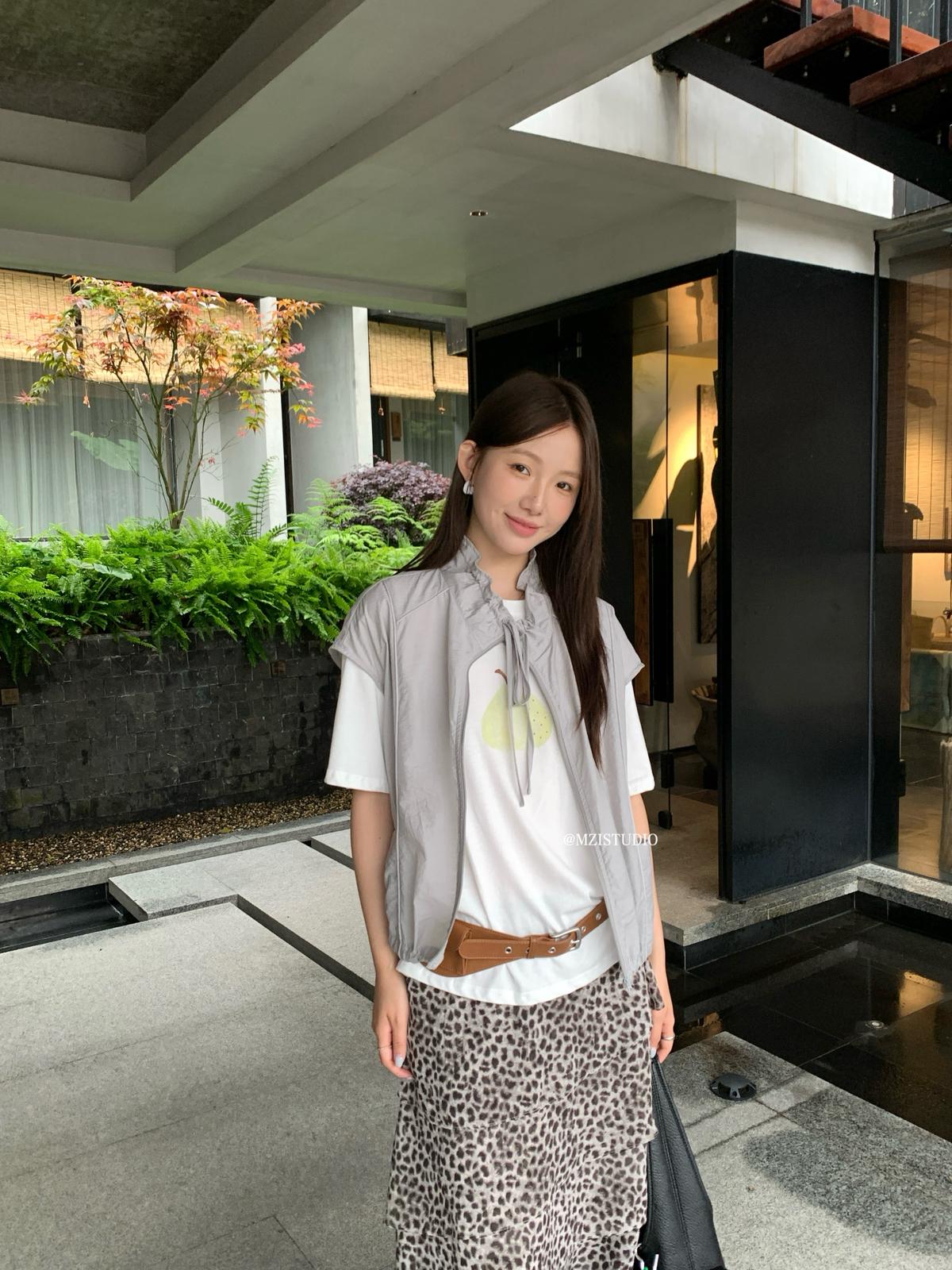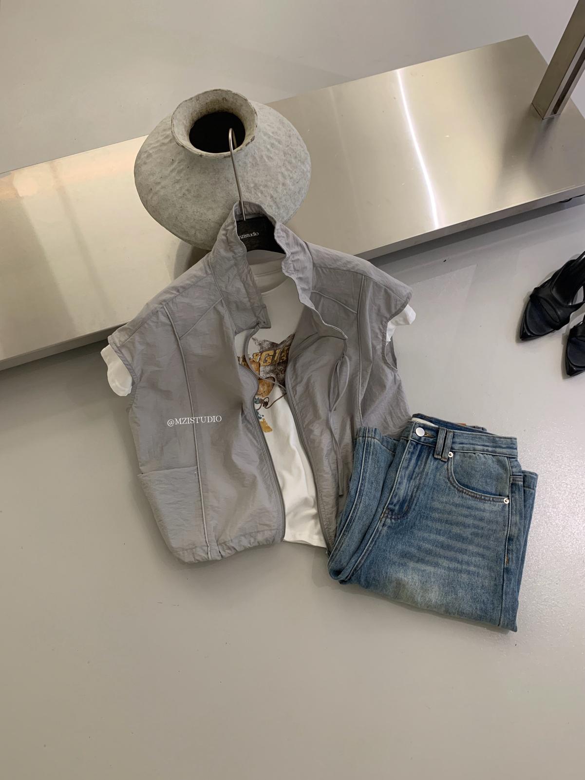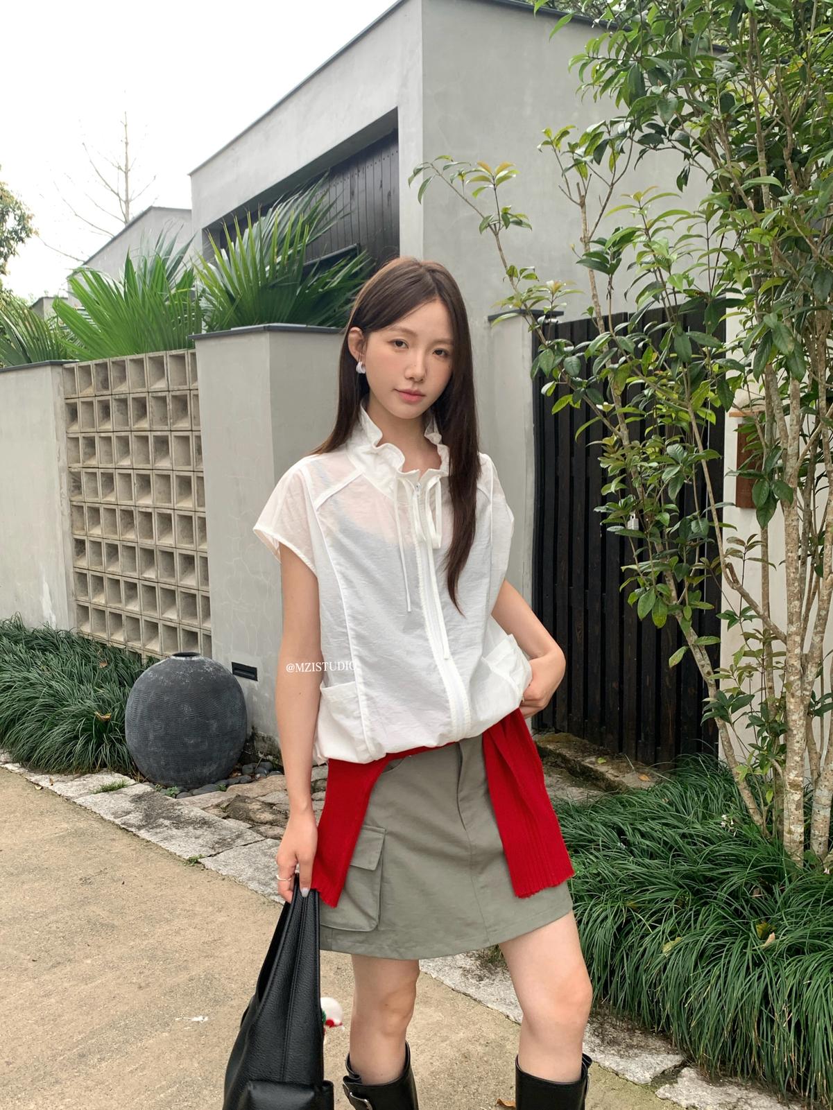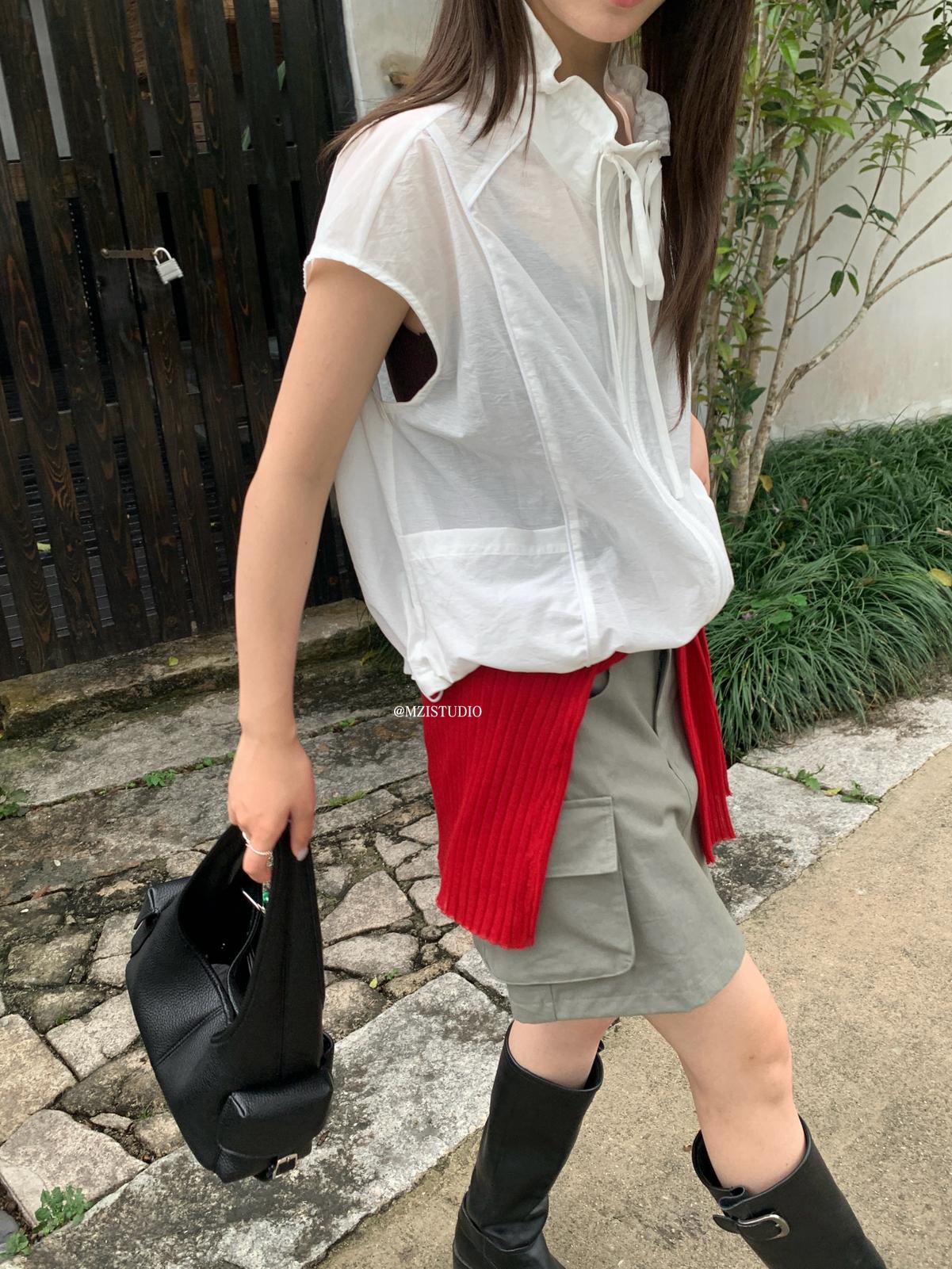【C9056】原野自由韓調夏日透氣舒適疊穿抽繩立領拉鍊口袋小衫(只賣小衫/不含項鍊)