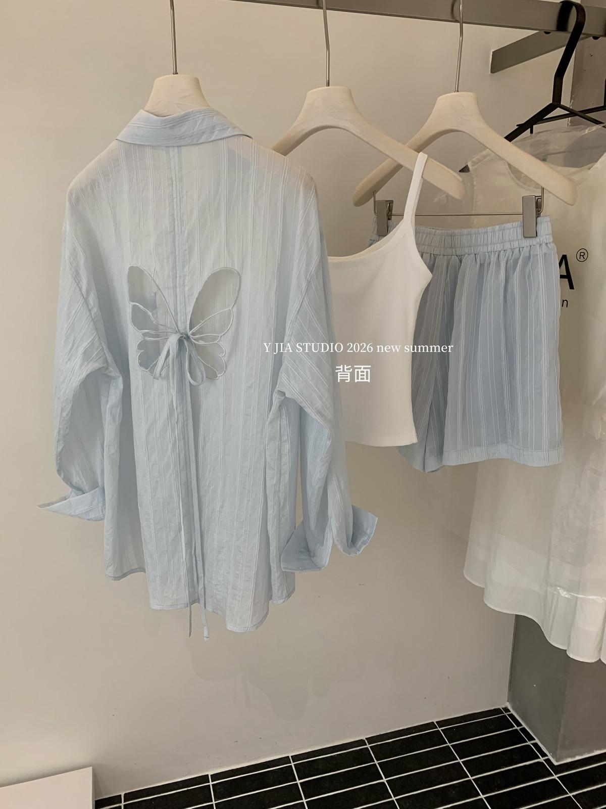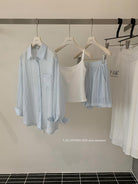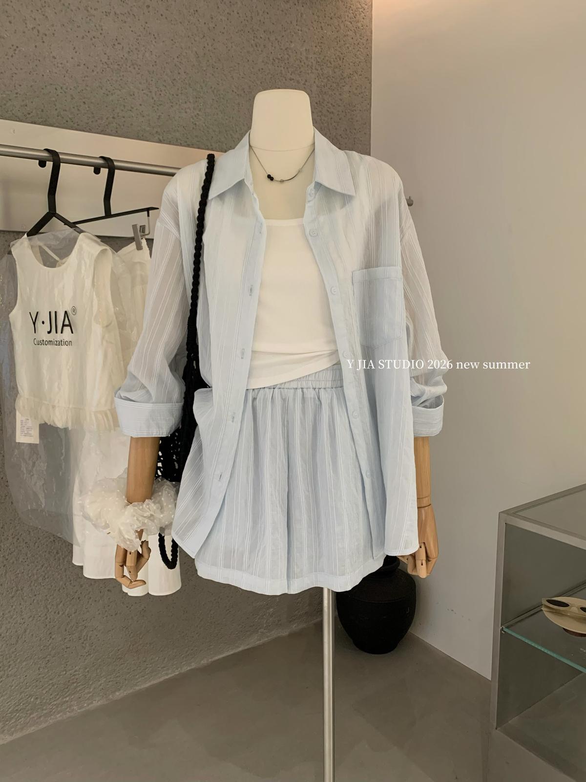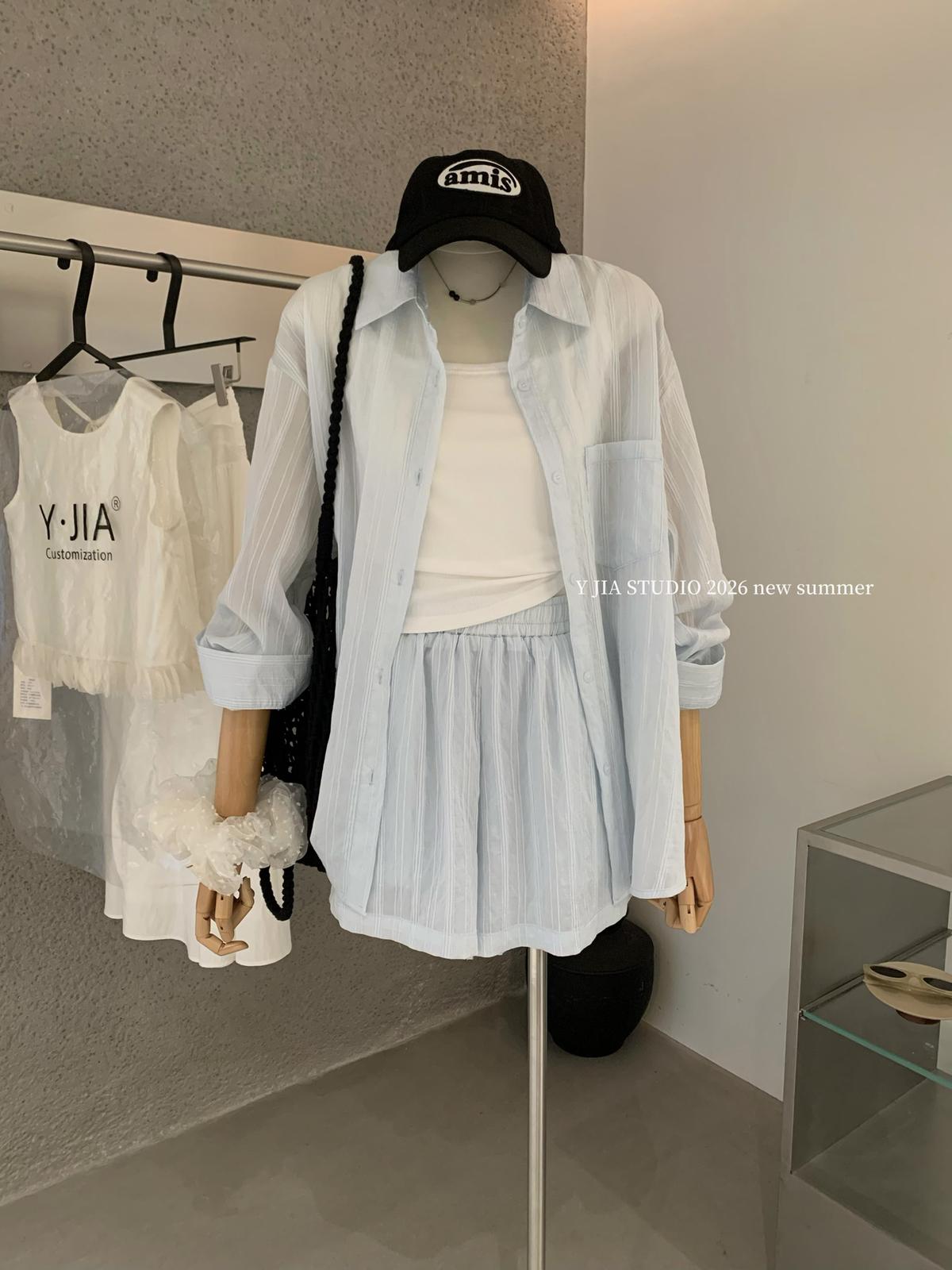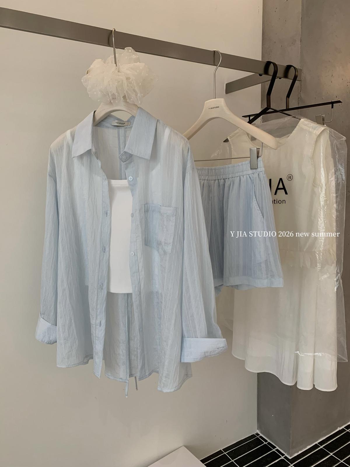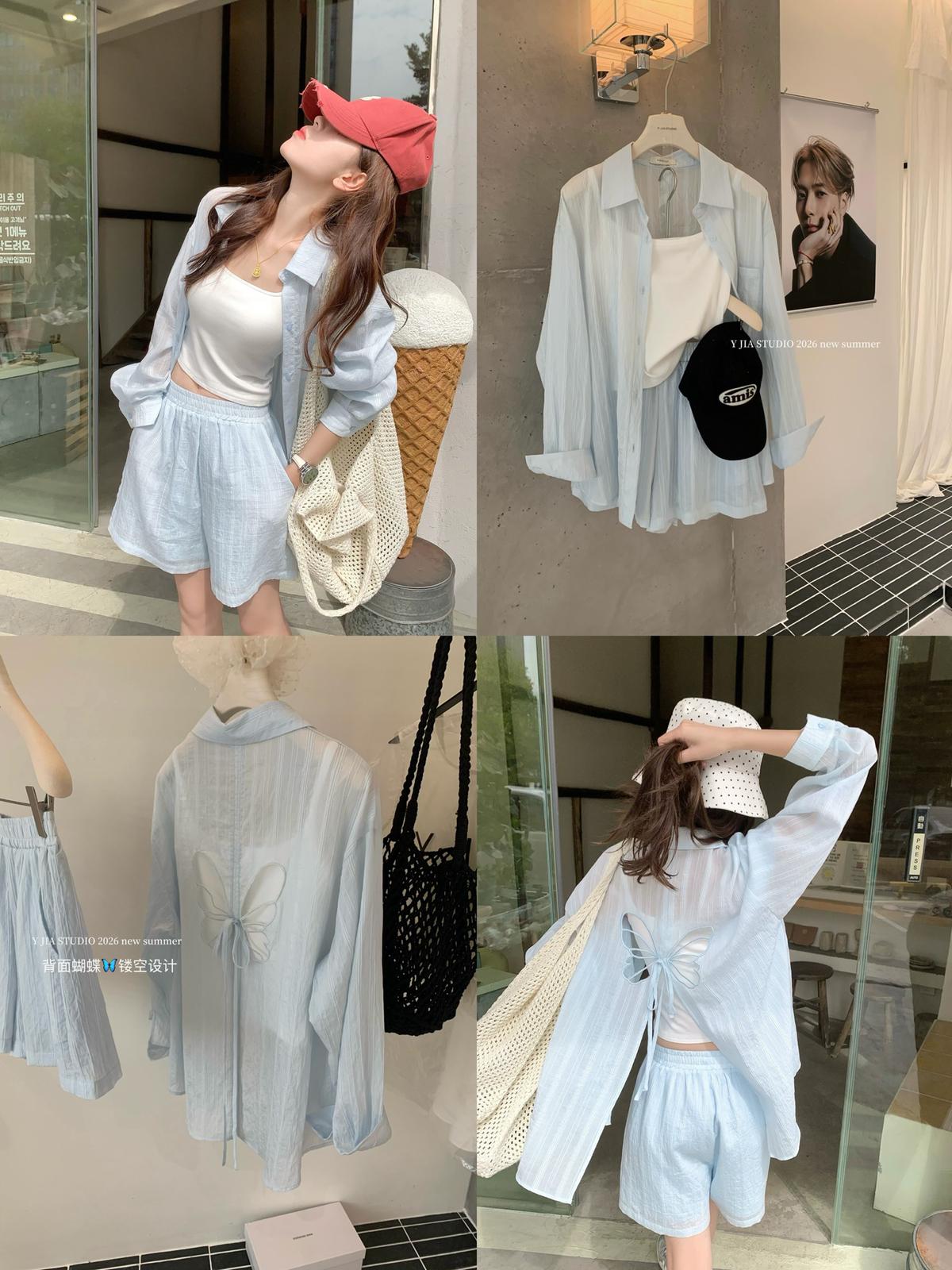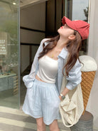 【C9068】冰萃夏日慵懶防曬衣防曬襯衫+顯瘦背心+鬆緊腰休閒短褲三件套套裝