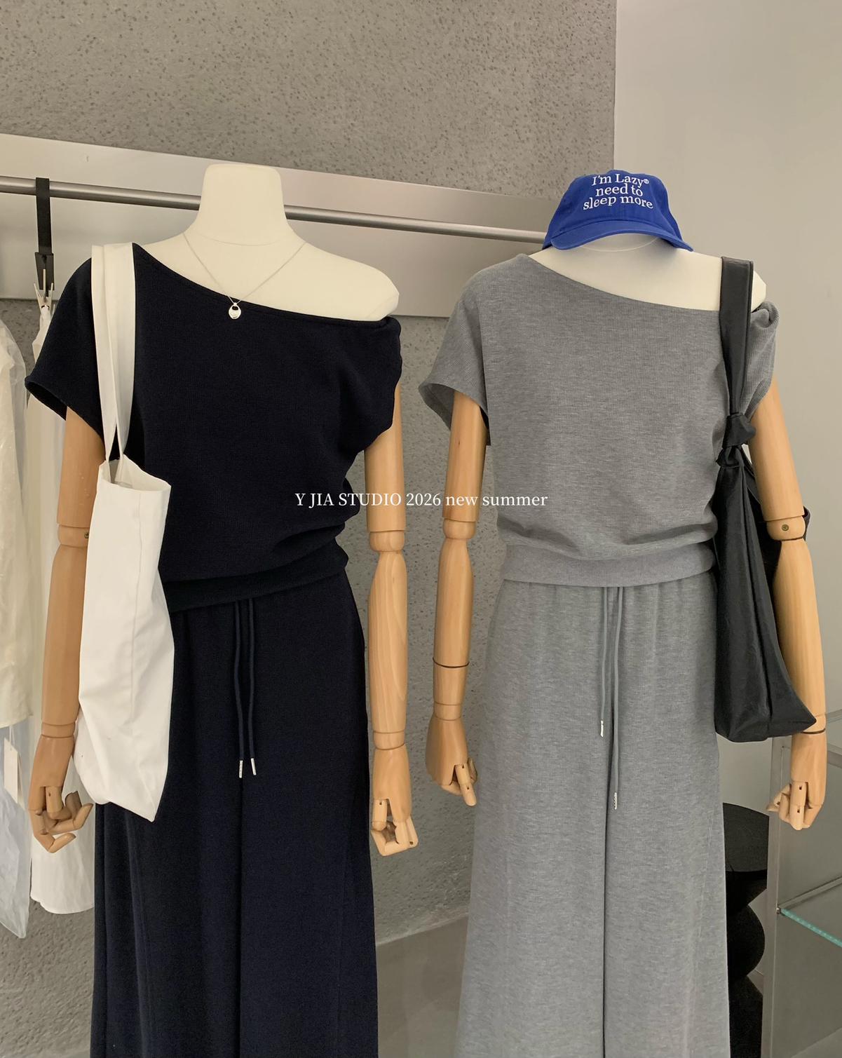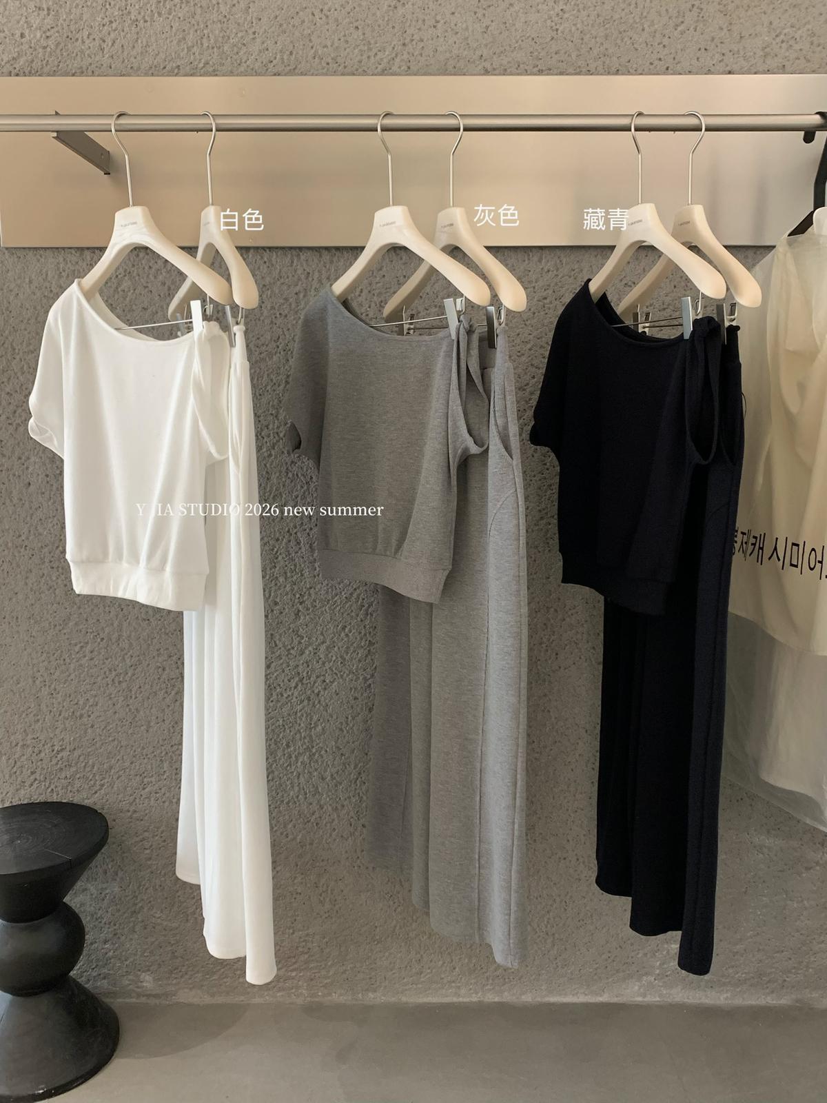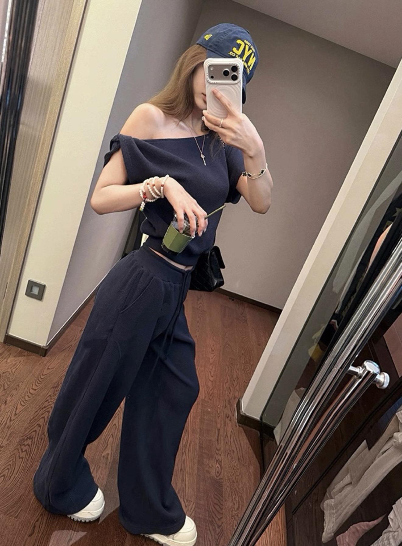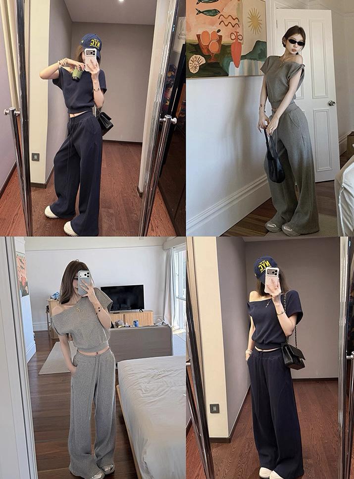 【C9070】斜領露肩短袖T恤+寬鬆直筒休閒闊腿褲兩件套裝
