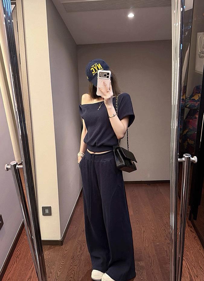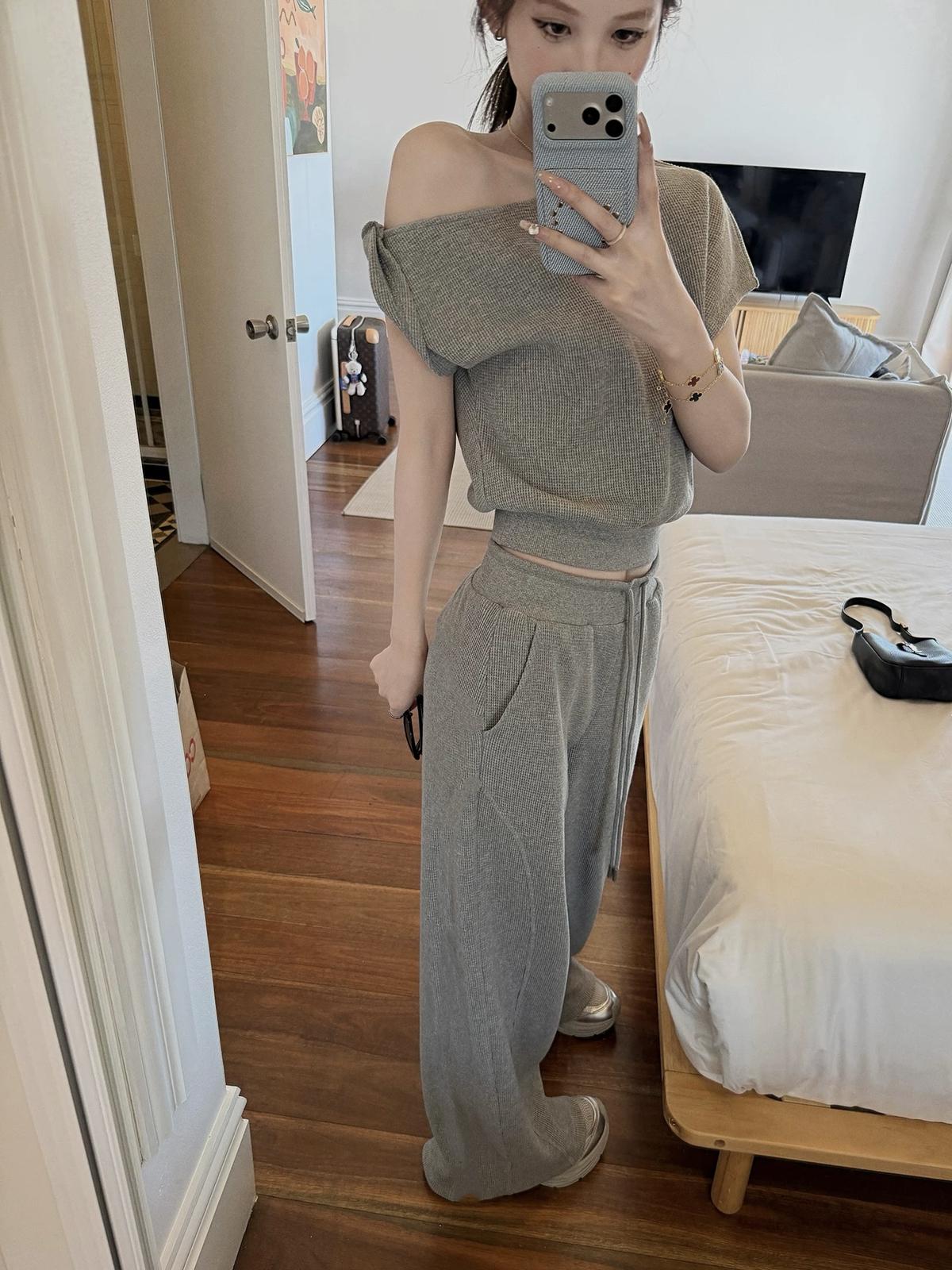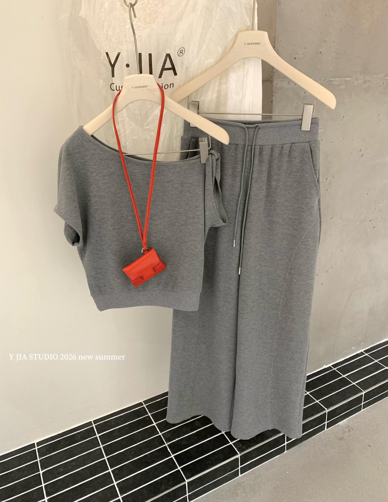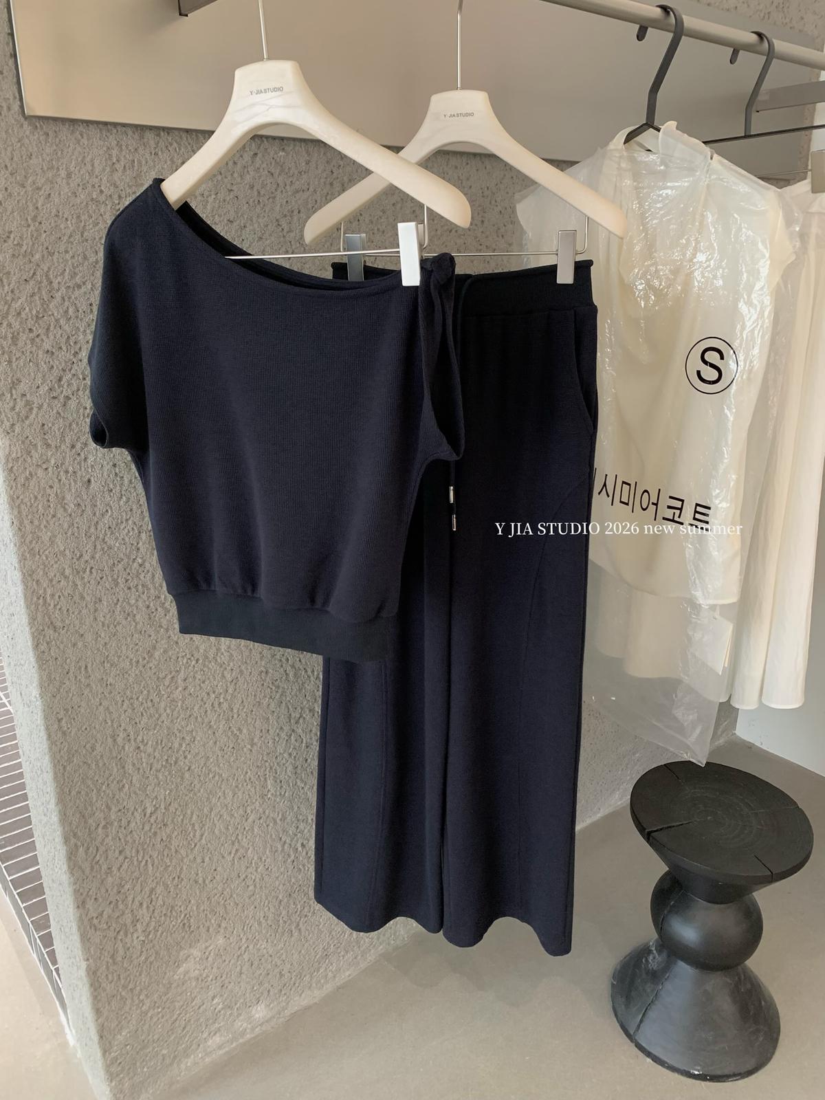 【C9070】斜領露肩短袖T恤+寬鬆直筒休閒闊腿褲兩件套裝