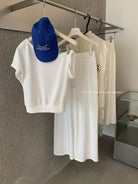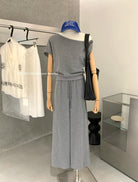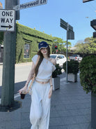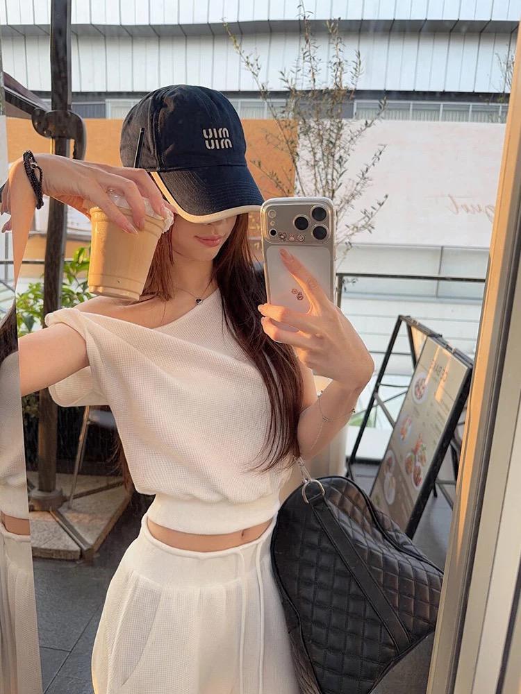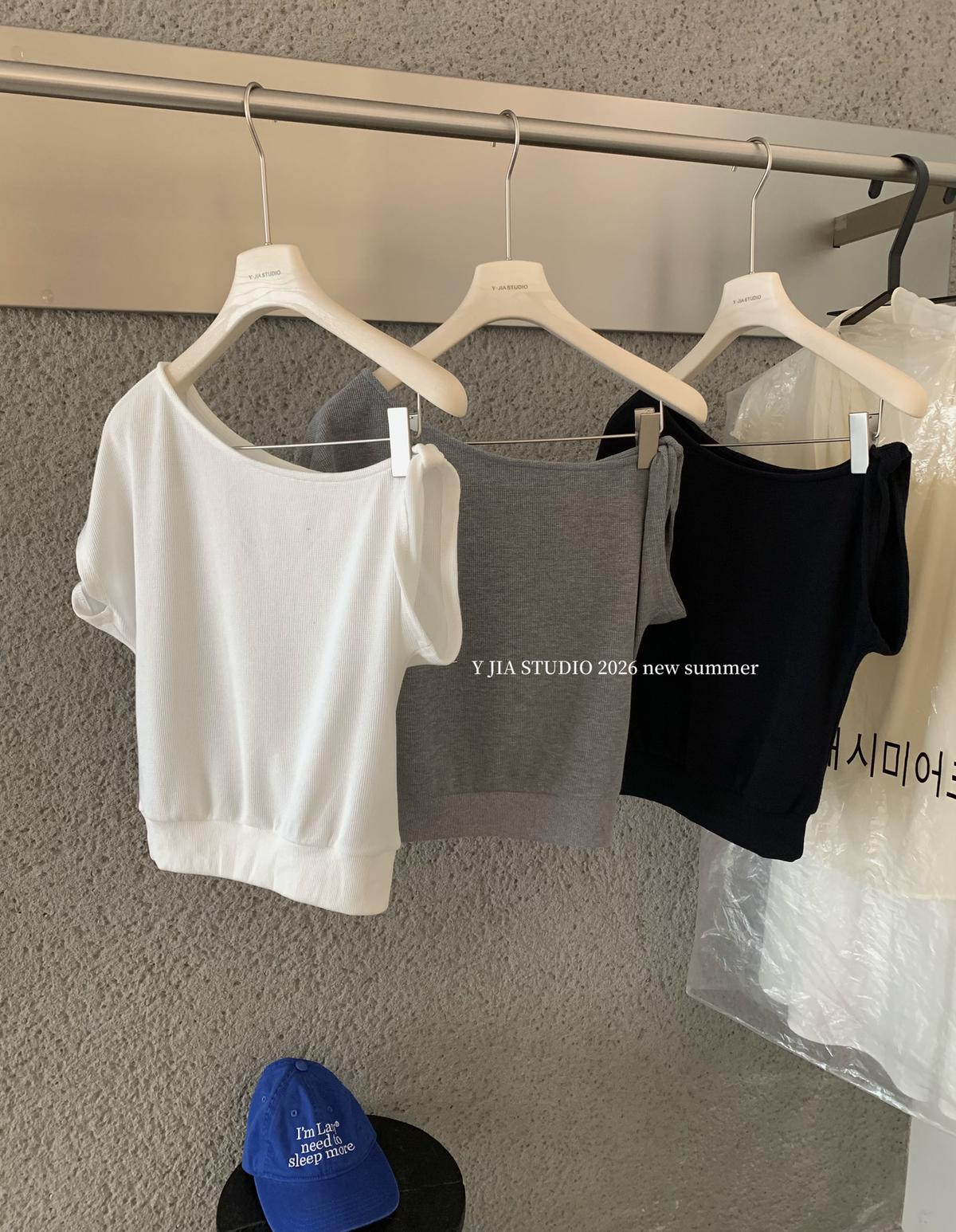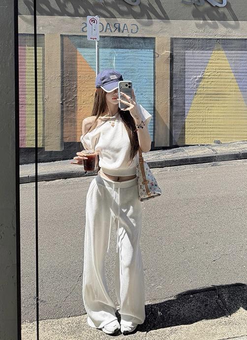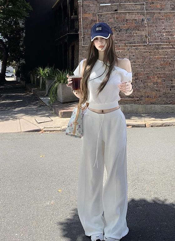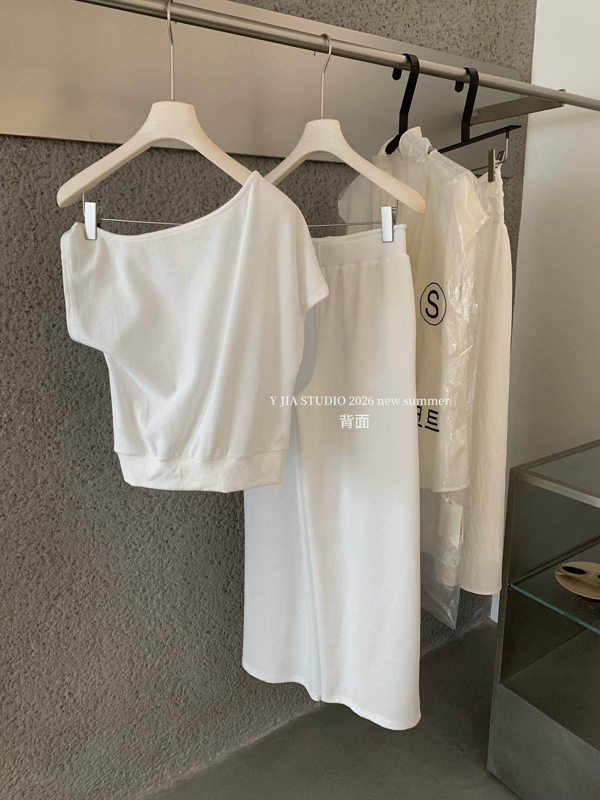 【C9070】斜領露肩短袖T恤+寬鬆直筒休閒闊腿褲兩件套裝