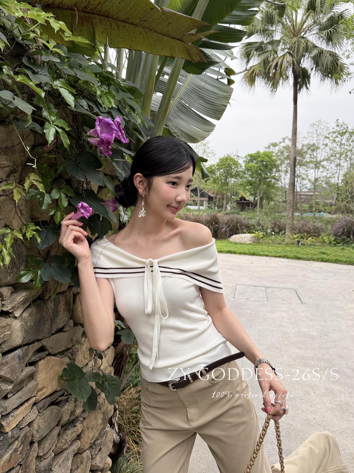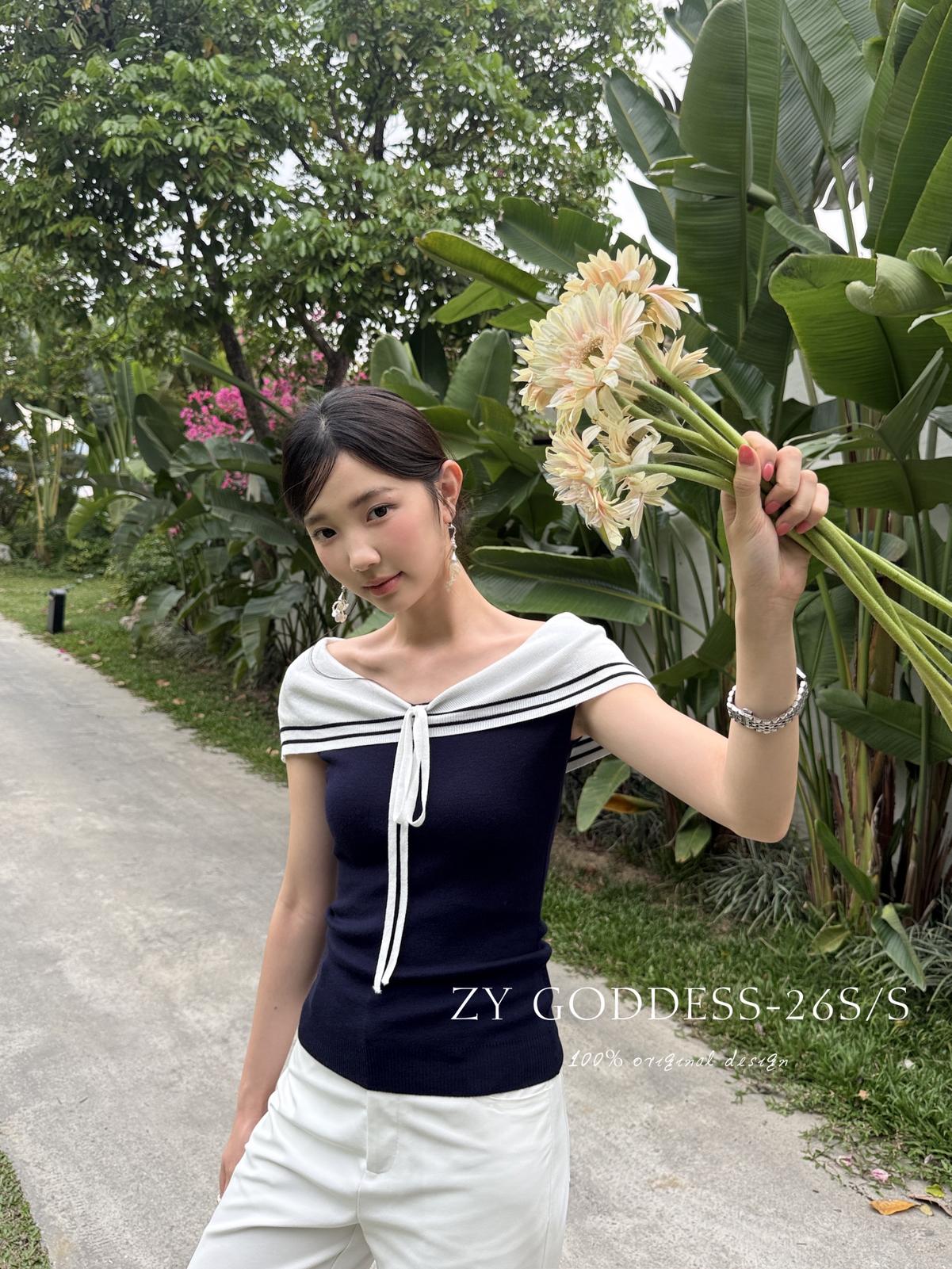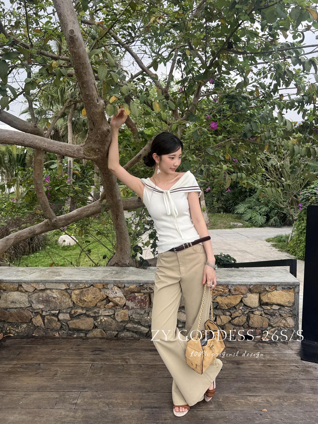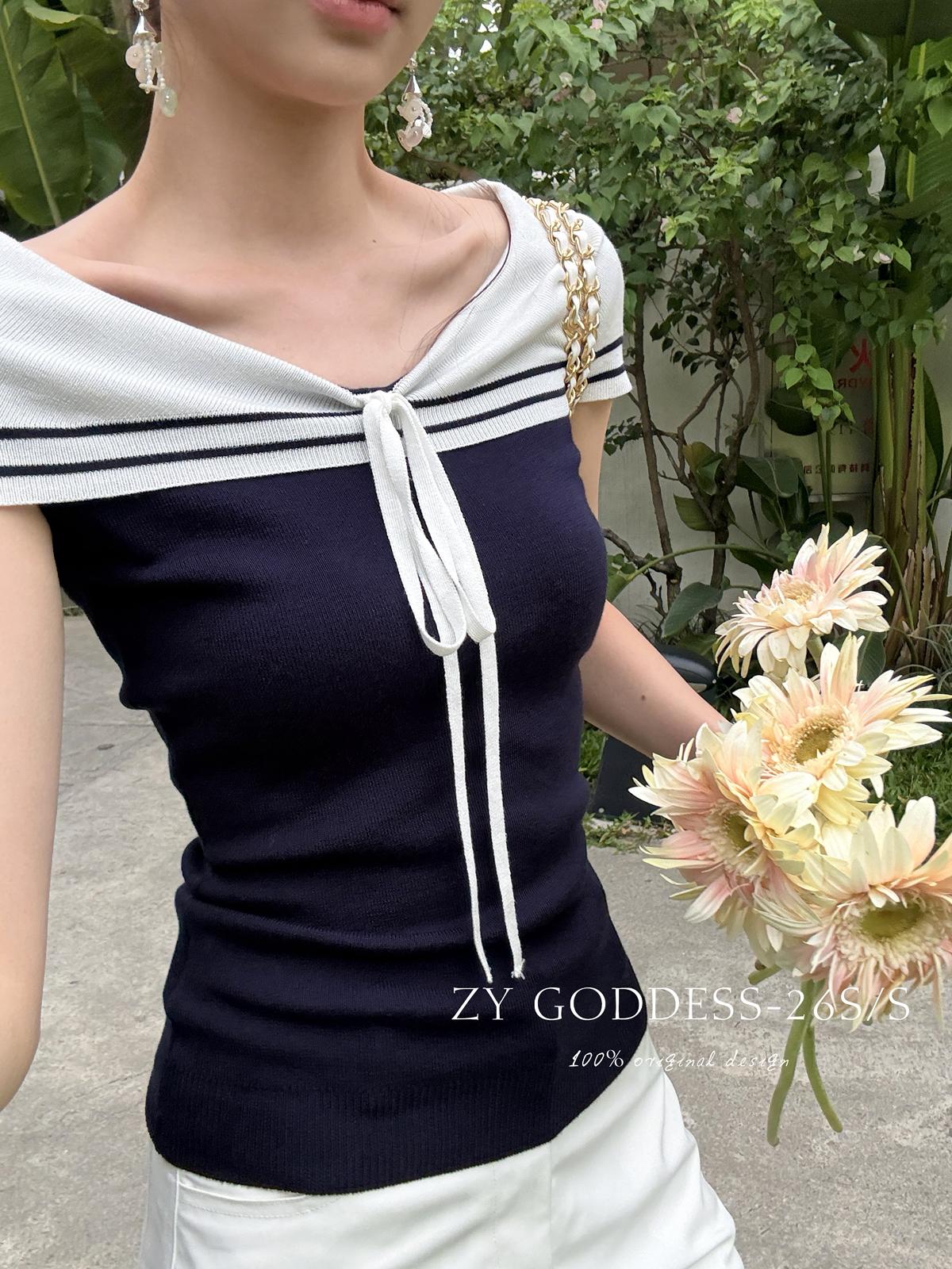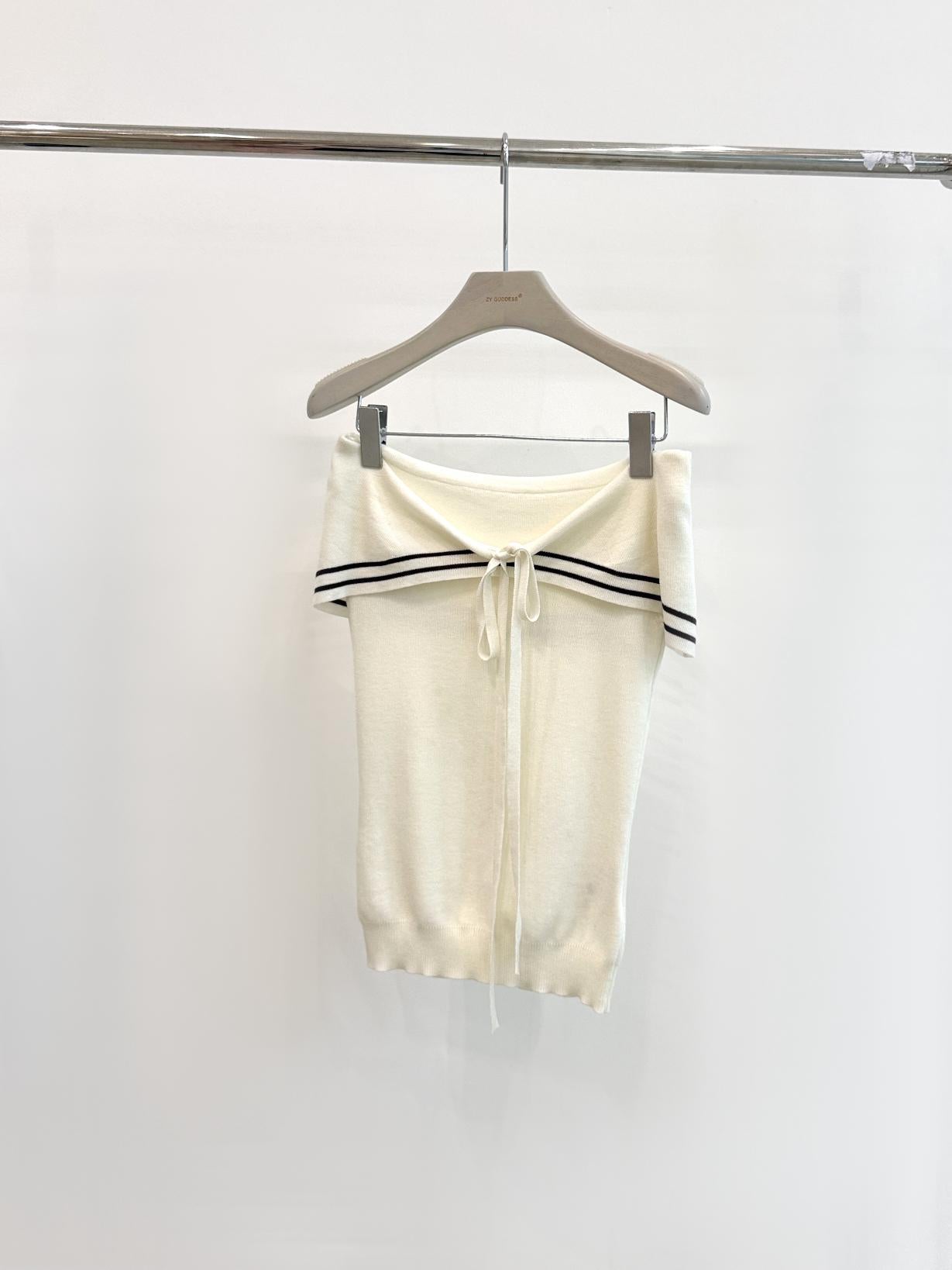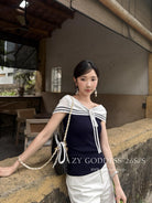 【C9076】海航度假風V領繫帶海軍翻領氣質針織小衫